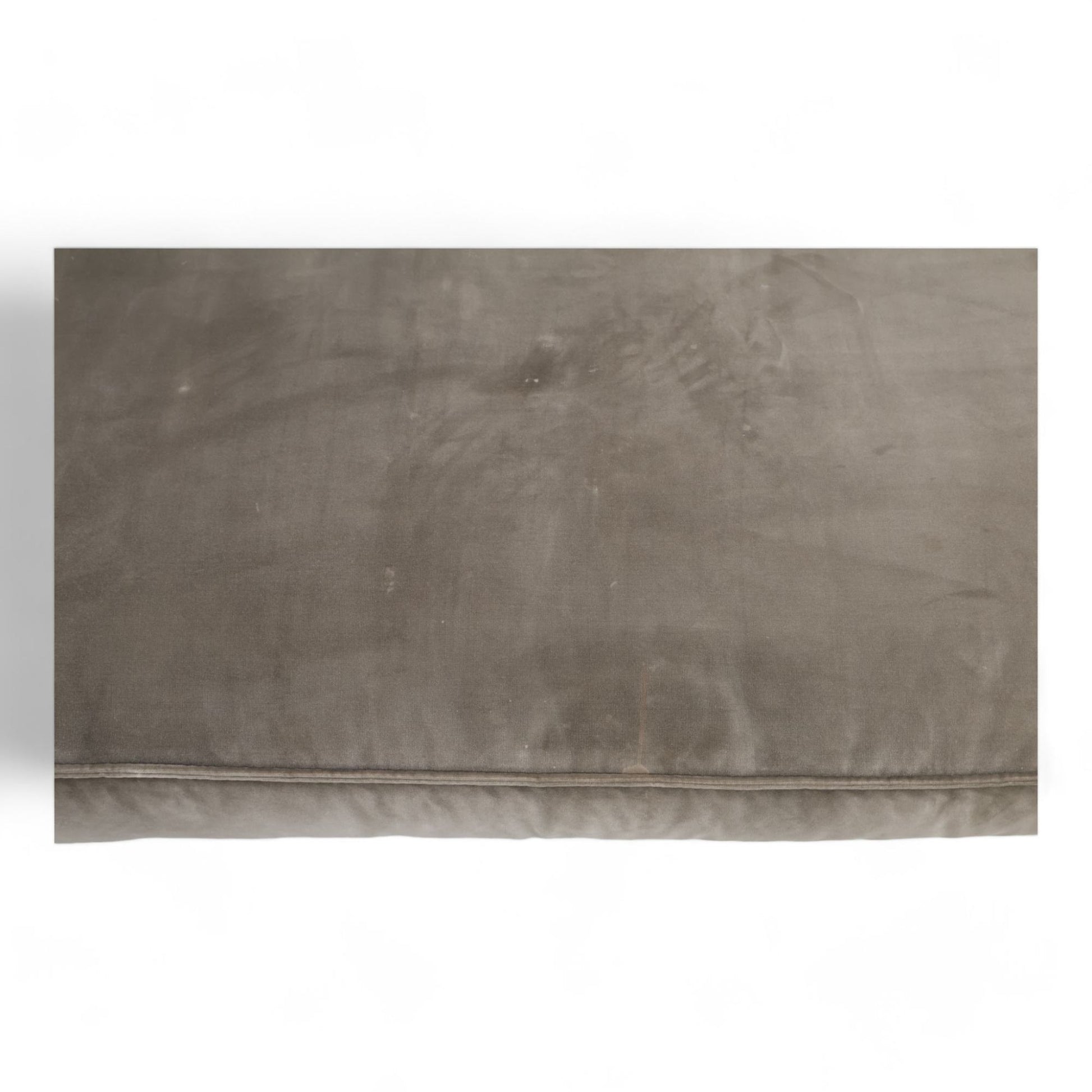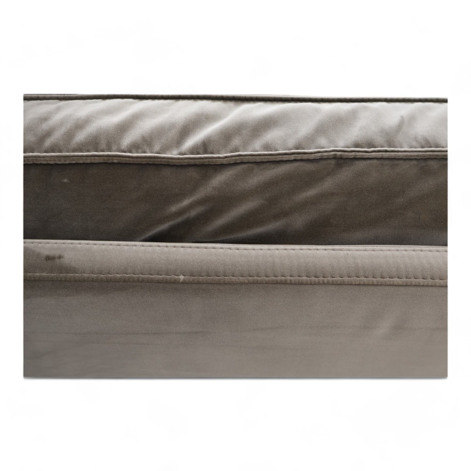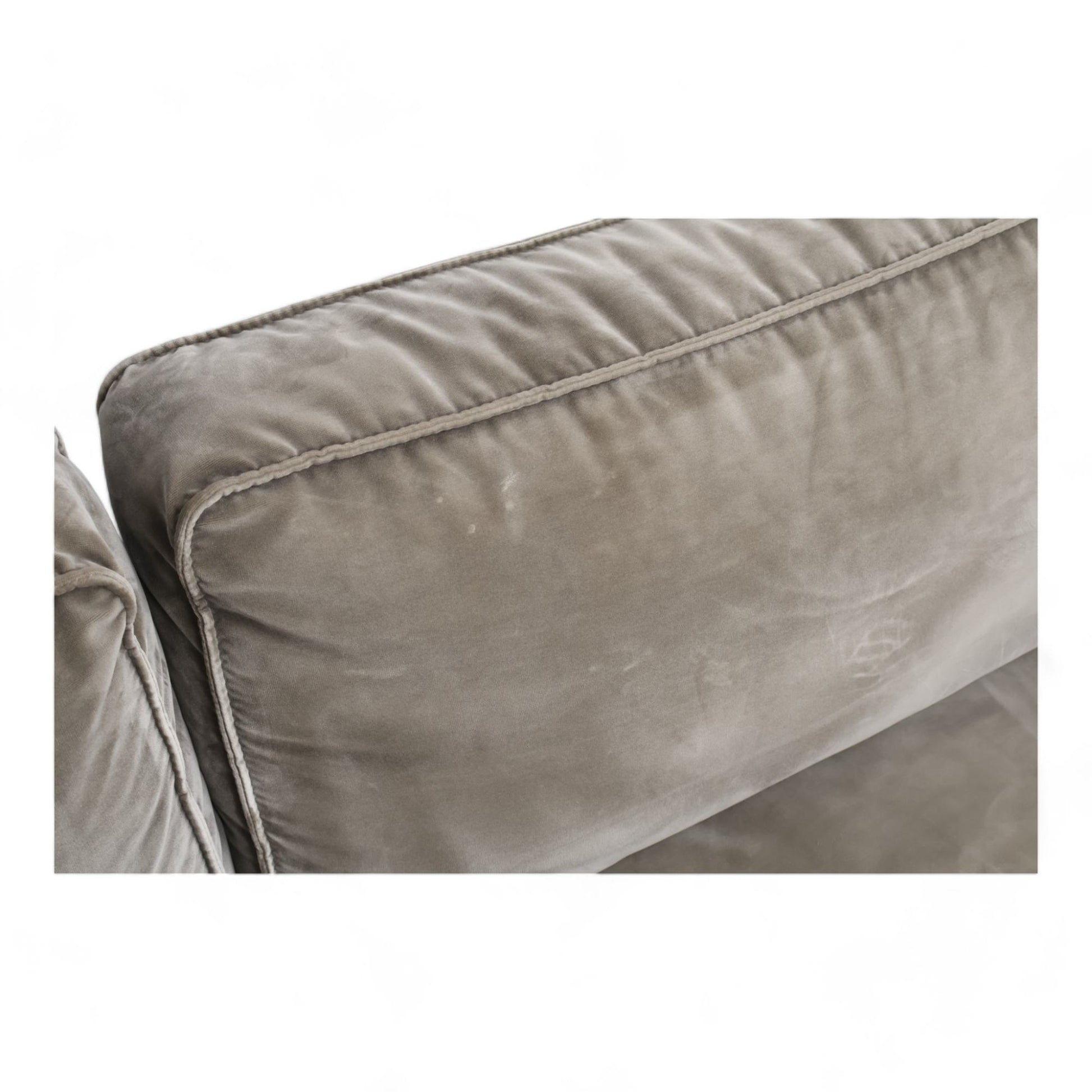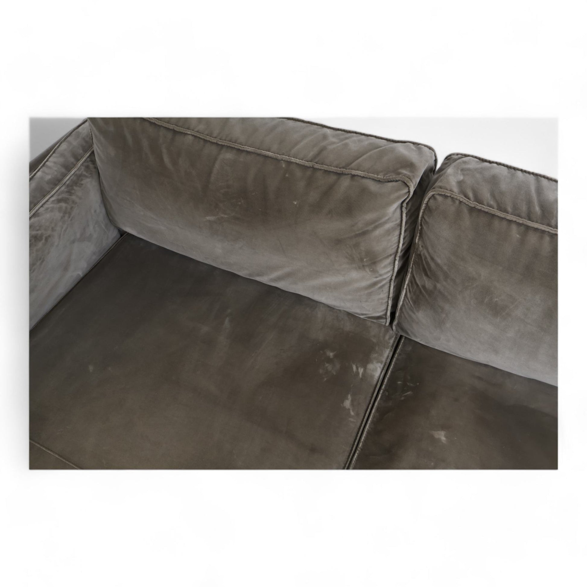 Sjeselongdelen mangler duk på undersiden, men dette er ikke synlig. Det er flere bruksmerker på putetrekkene, noen markante. Kun putene ved armlenene er vendbare. Velurstoffet er mindre glatt på sitteputene. Perfekt for en romslig og komfortabel stue