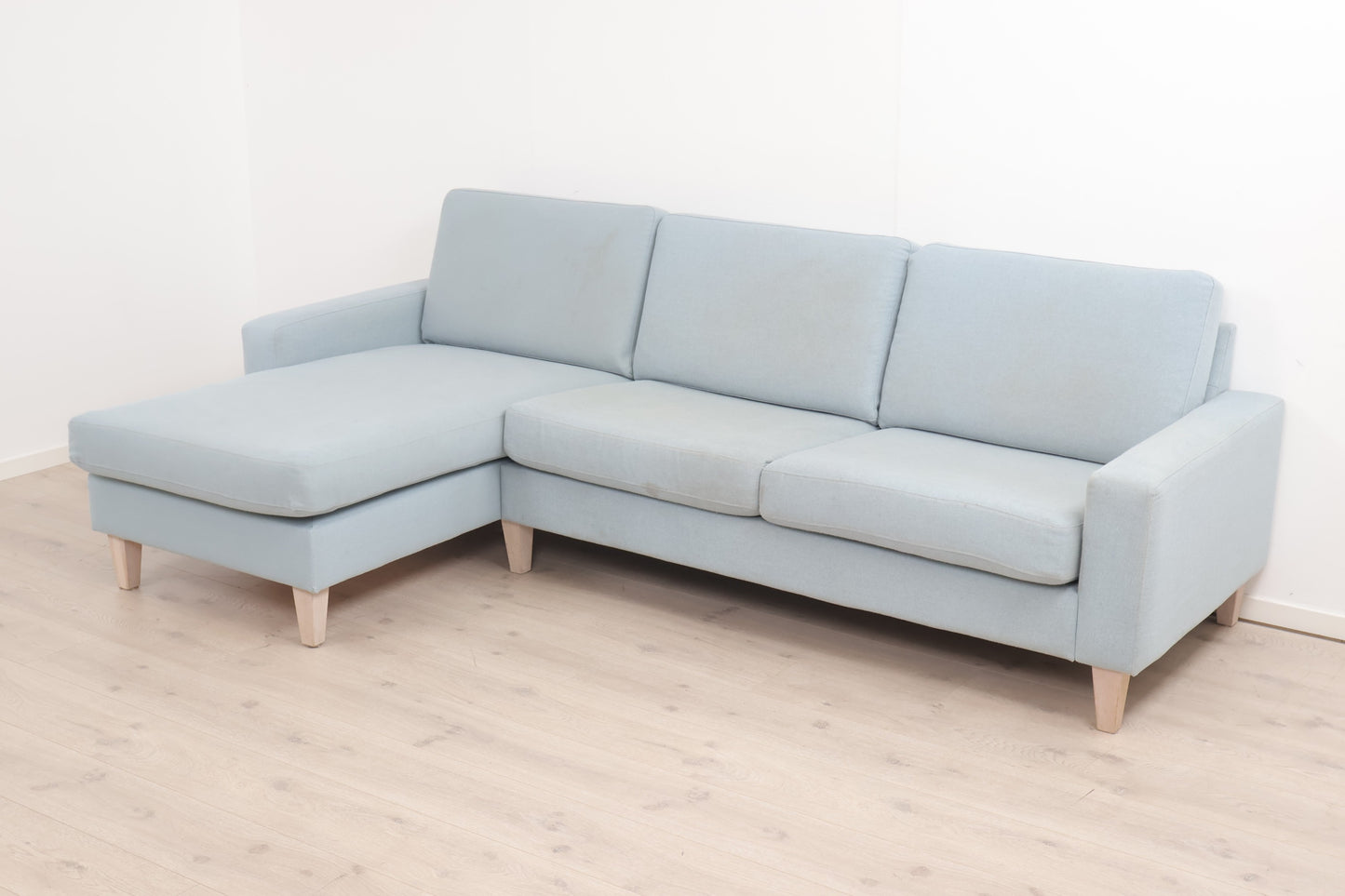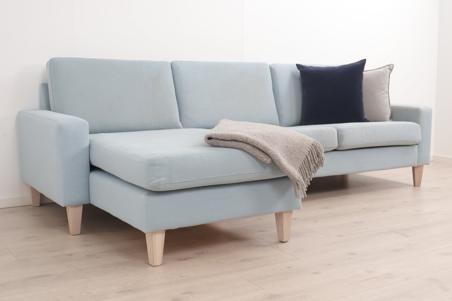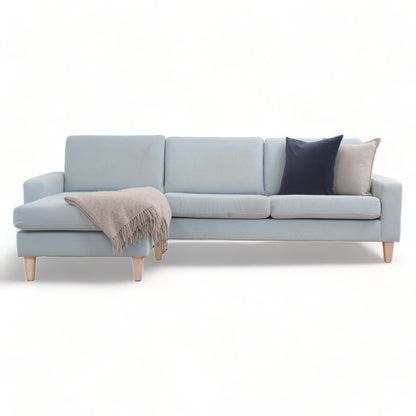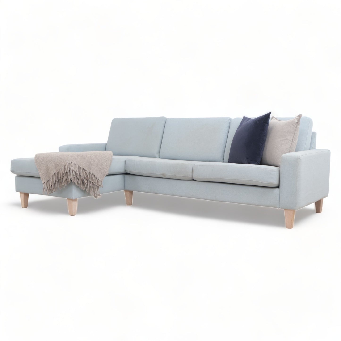 Nyrenset | Lys blå vendbar sjeselongsofa med eikebein