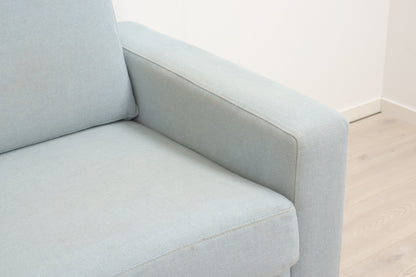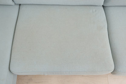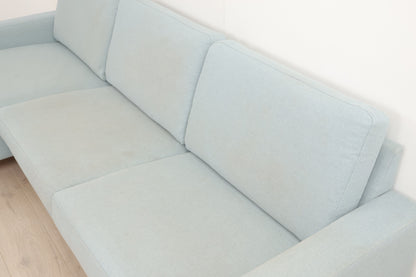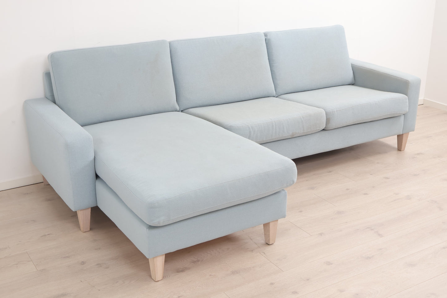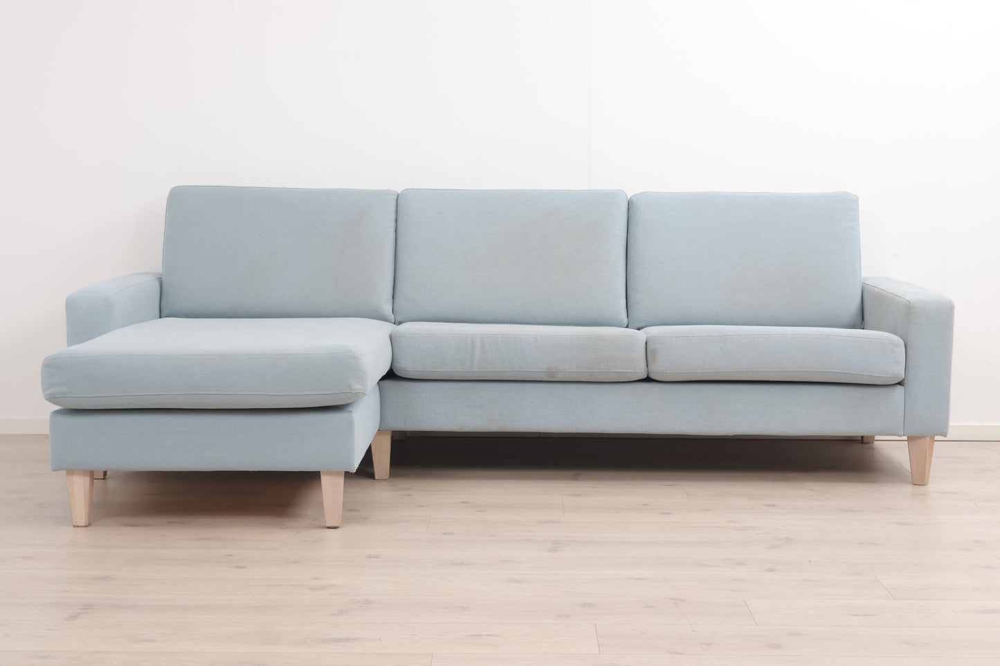 Nyrenset | Lys blå vendbar sjeselongsofa med eikebein