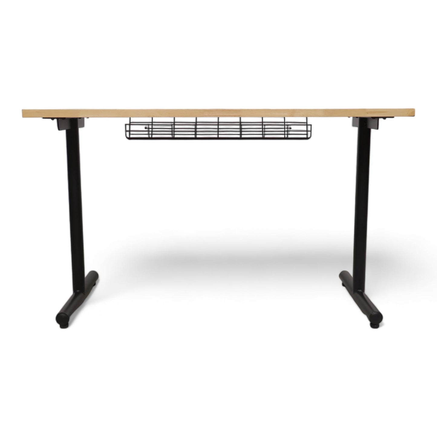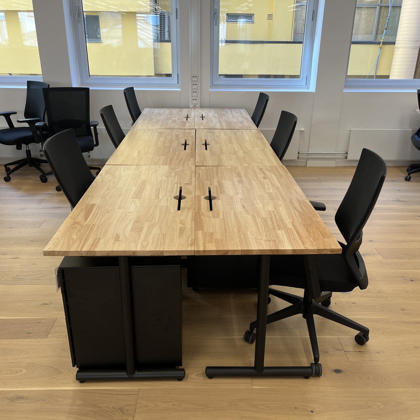 Skrivebordet er i god tilstand med noen små riper på bordplaten. Det er ideelt for både hjemmekontor og profesjonelle kontorlandskap, og tilbyr en kompakt, men romslig arbeidsflate.