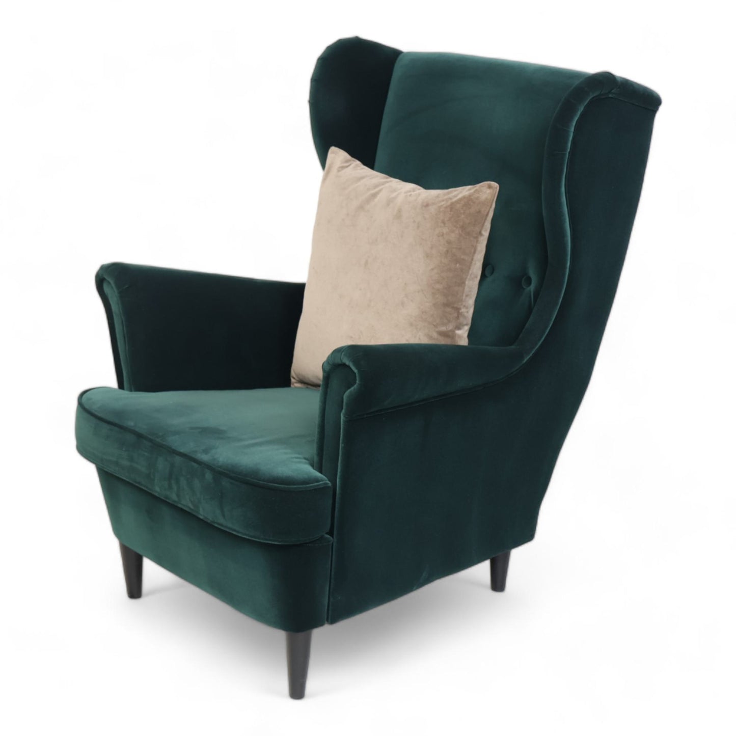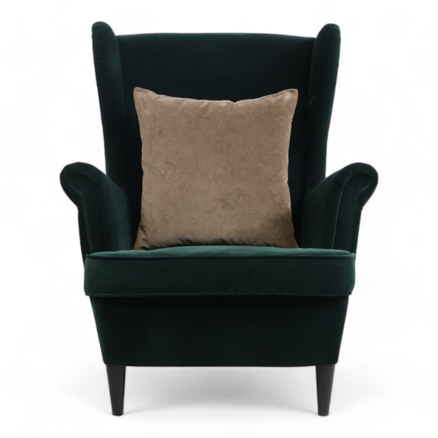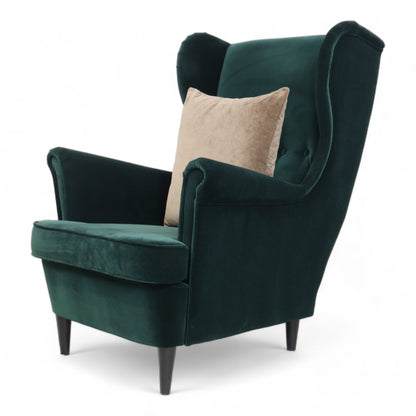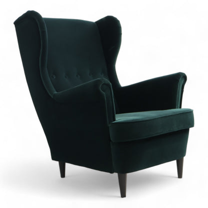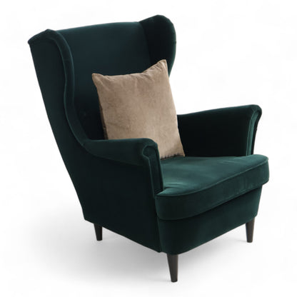 Nyrenset IKEA Strandmon lenestol i en nydelig mørk grønn velur. Lenestolen har fast sittekomfort og er perfekt for koselige stunder. Den er montert og klar til bruk, med putefyll av skum og dun.
