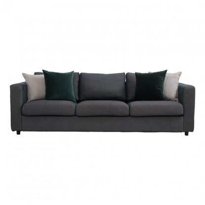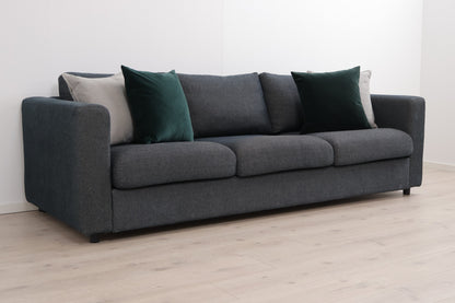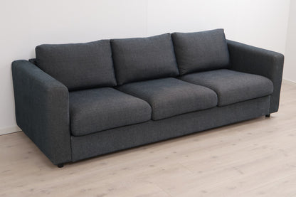 Mørk IKEA Vimle 3-seter sofa med avtagbare/vaskbare trekk på samtlige puter samt på selve sofaen. Sofaen fremstår som pen og har god sittekomfort. Normal/lite bruksslitasje. En liten sprekk i en plate innvendig men dette verken synes eller merkes - se det siste produktbildet. Renset og Leveringsklar.