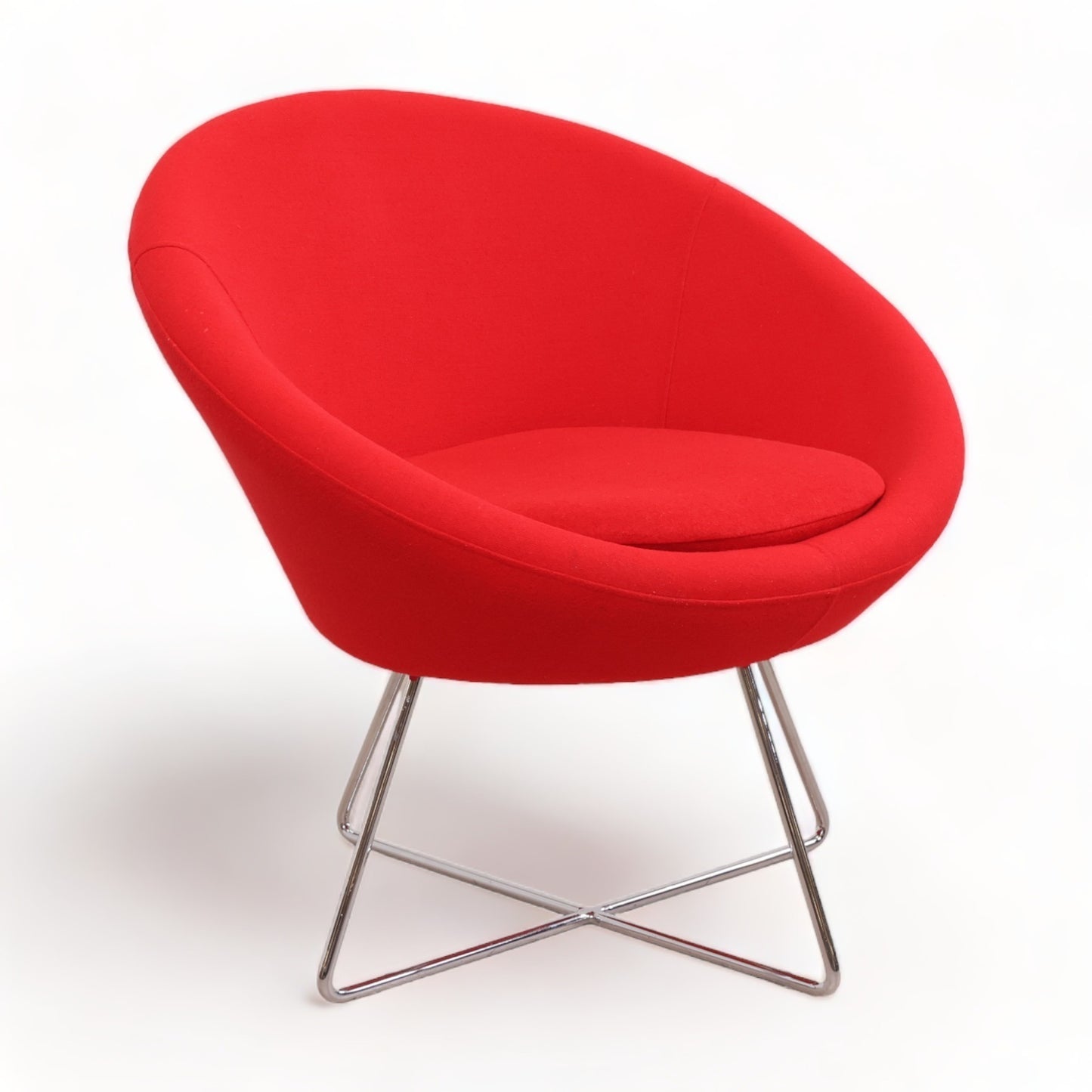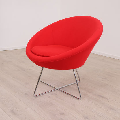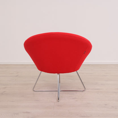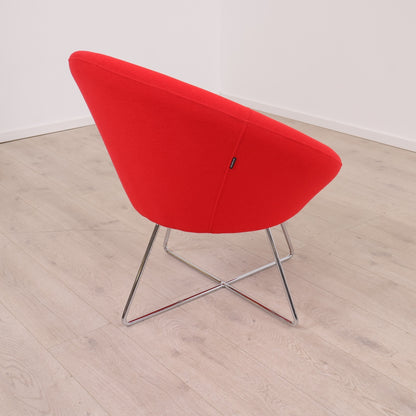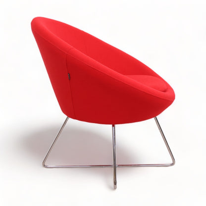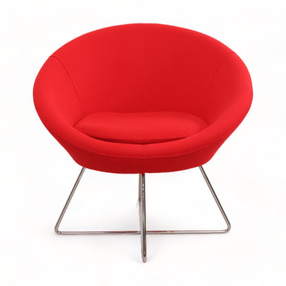Frigaard loungestol i fargen rød på krom understell. Denne moderne og tidløse stolen fra Frigaard er designet for komfort og passer inn i moderne møterom/venterom. Stolen er i god tilstand med normal bruksslitasje.