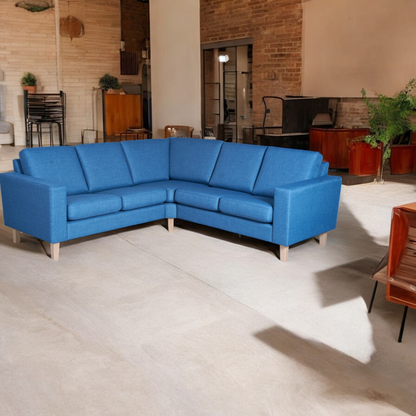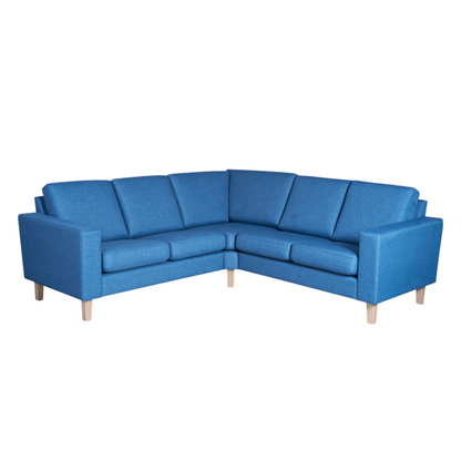 Her har du et populært oppsett i denne serien. Oppsettet er en klassisk hjørneløsning i fast sittekomfort med smale armlener på begge sider. Sofaen er trukket i det slitesterke stoffet Forza i den nydelige fargen Blue, og har 16cm høye ben som er hvitoljet.