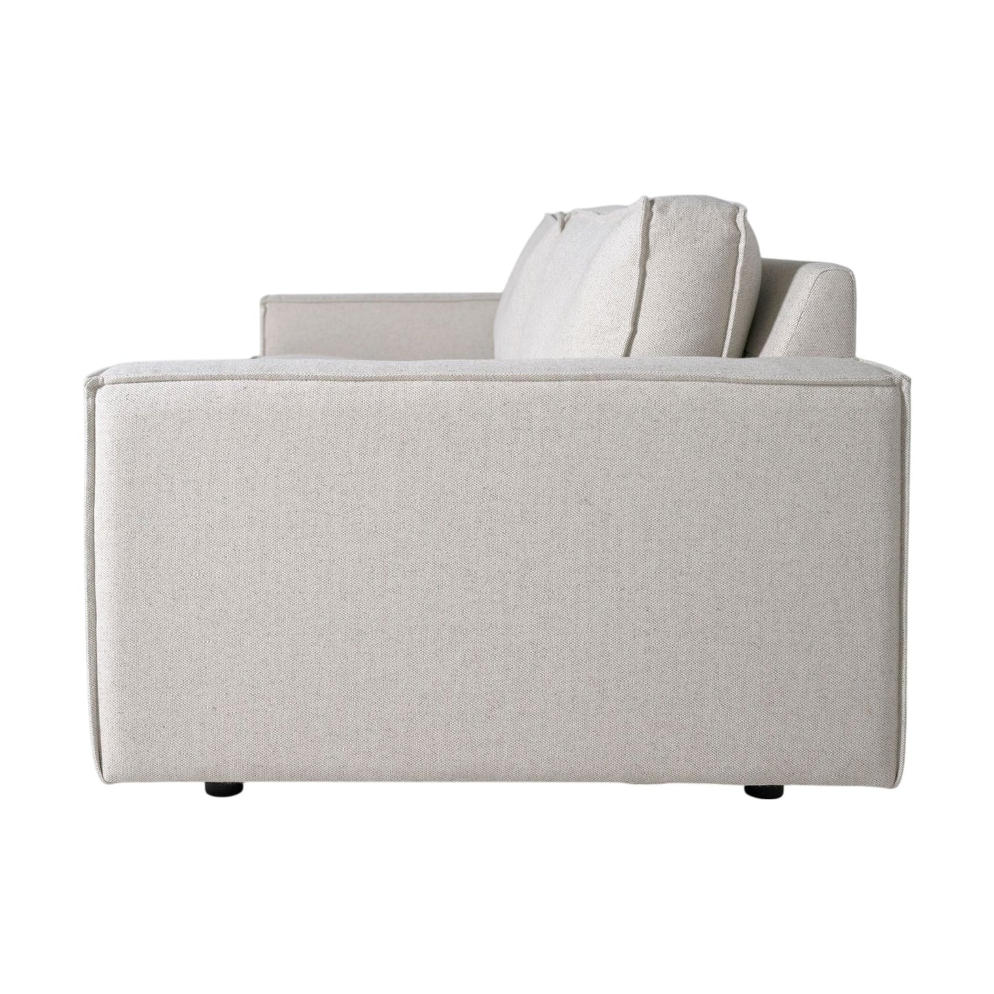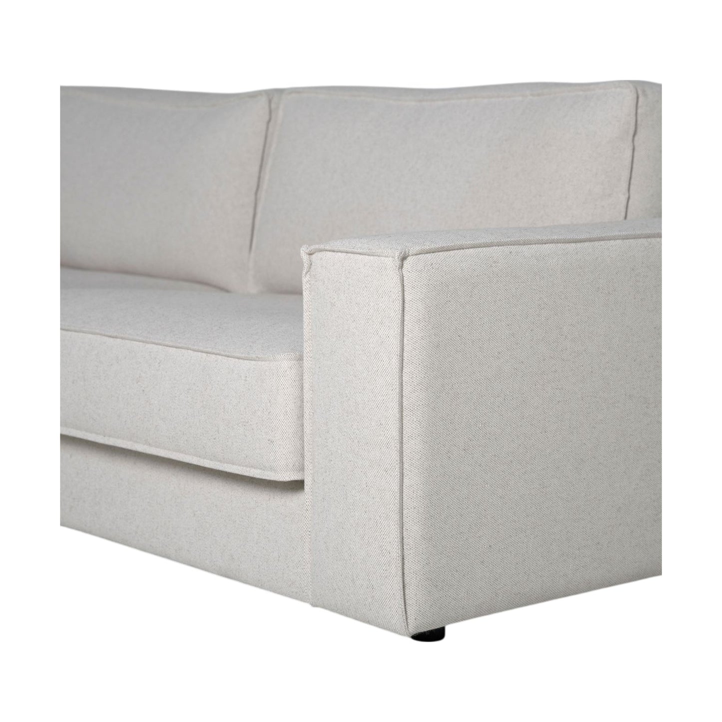 Tidløs Olivia 3-seter sofa fra Kid med robuste brede armlener og skjulte ben. Sofaen er trukket i en stilren kombinasjon av hamp og bomull, noe som gir et moderne preg med en elegant fransk søm. De avtagbare putetrekkene gjør vedlikehold enkelt og praktisk, perfekt for hverdagsbruk. Sofaens nøytrale beige farge gjør den lett å integrere i ulike interiørstiler.