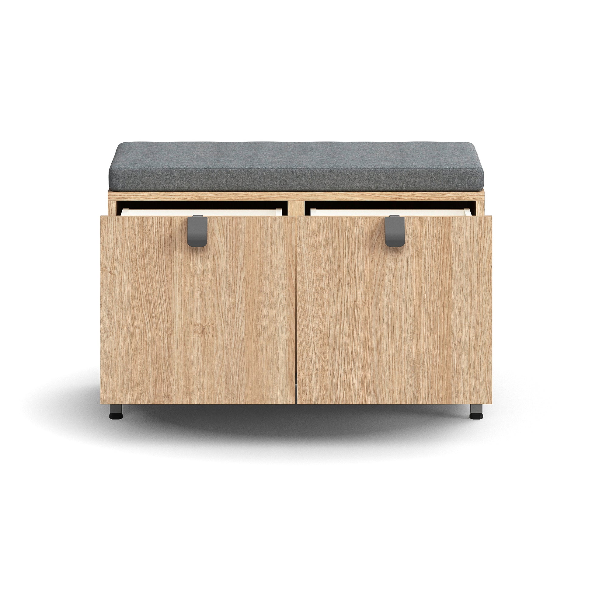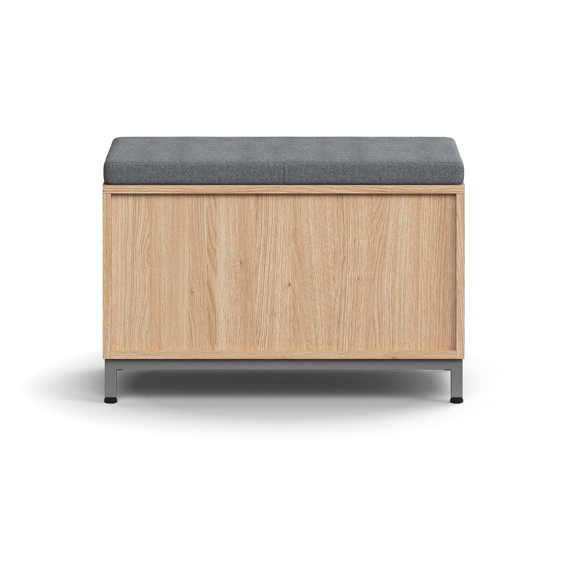 Praktisk oppbevaringsbenk fra AJ Produkter med benstativ i sølv og sete i eikefiner. Benken er utstyrt med en grønn pute og 2 skuffer, og egner seg perfekt for å organisere lagringsplasser på kontoret eller i hjemmet.