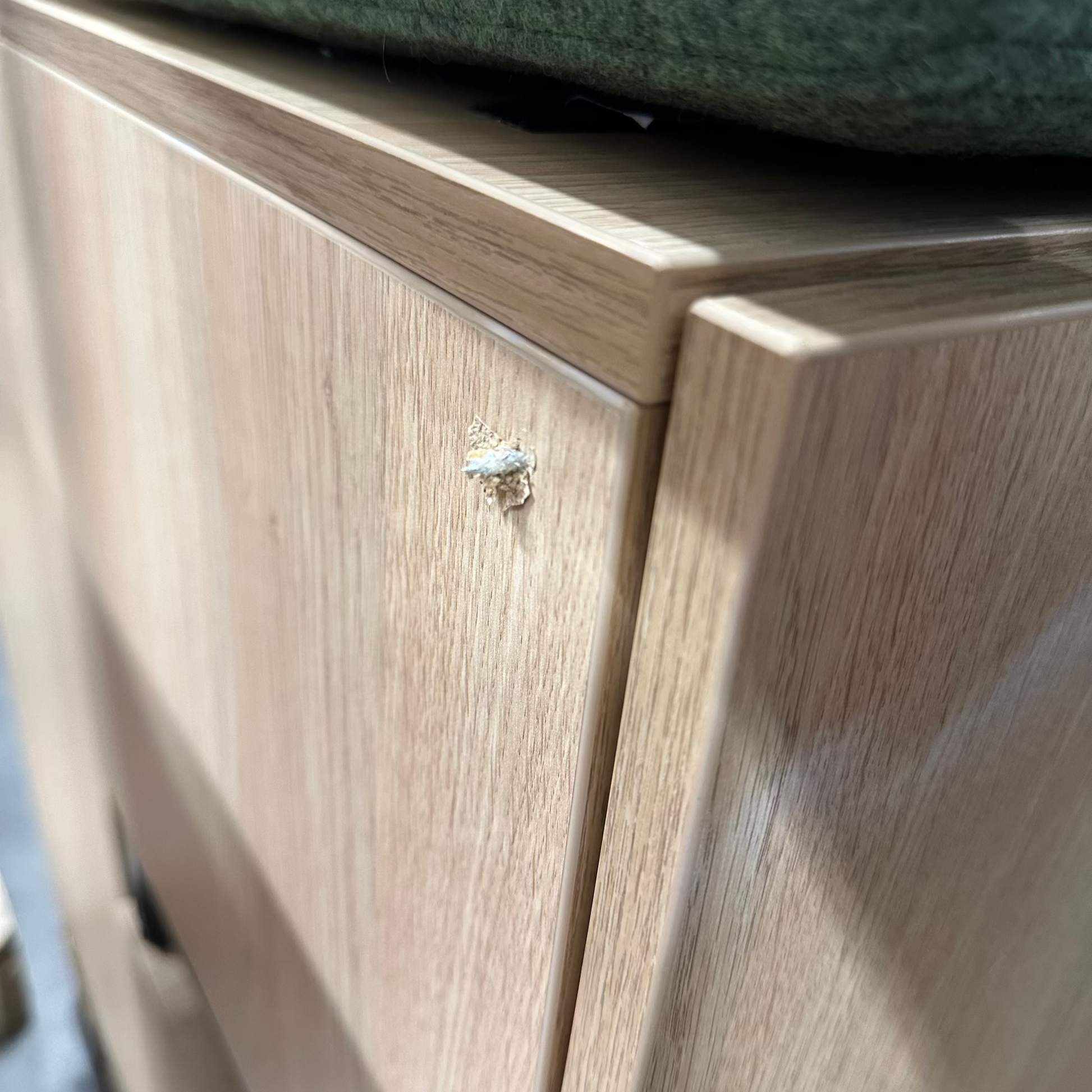 Oppbevaringsbenken er i god stand, men har skruehull på kantene etter å ha vært montert fast i andre skap. Den grønne puten er inkludert, mens en grå pute ikke følger med.