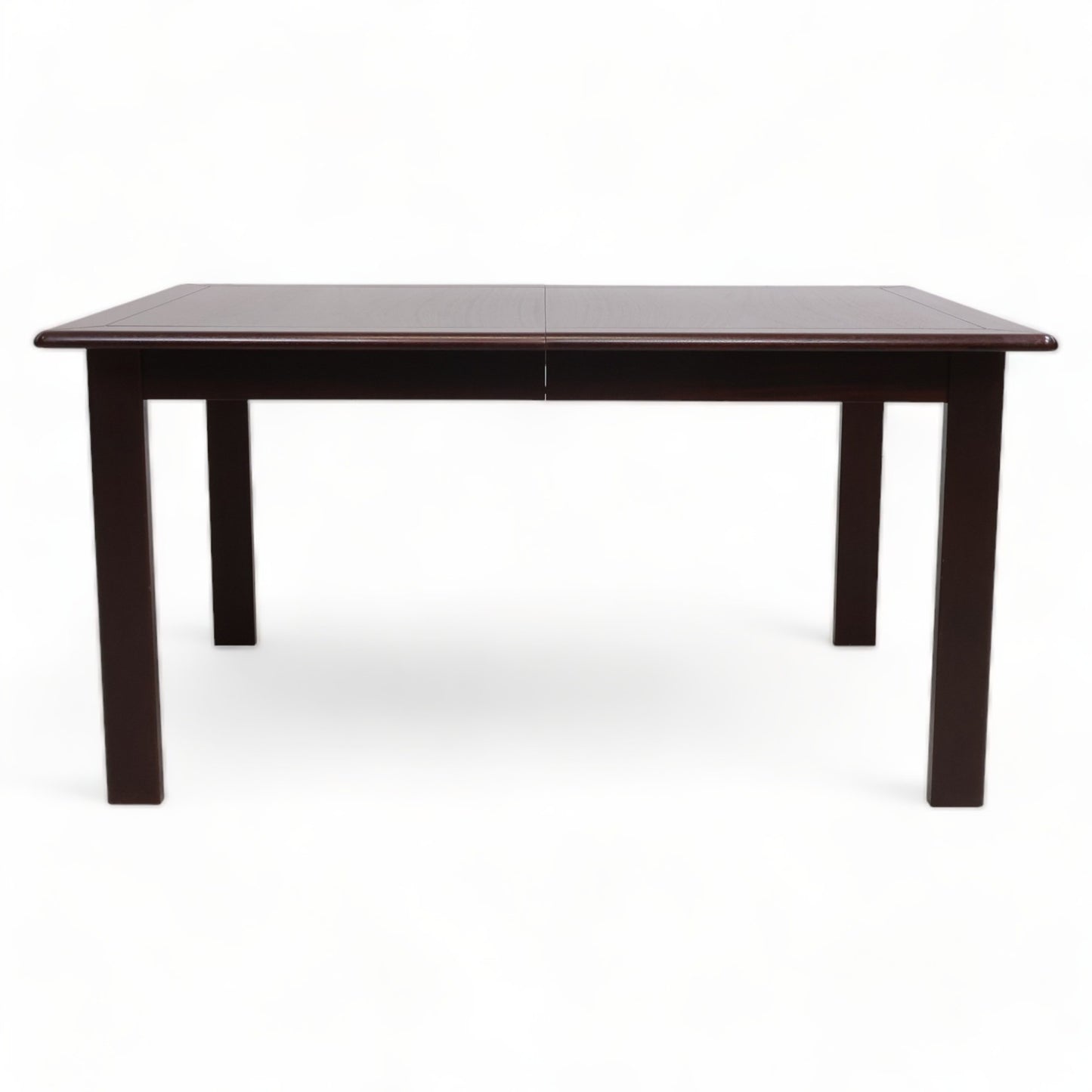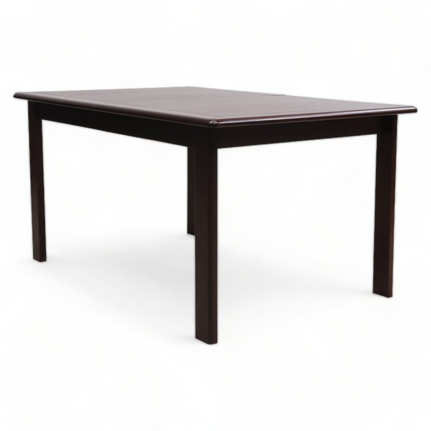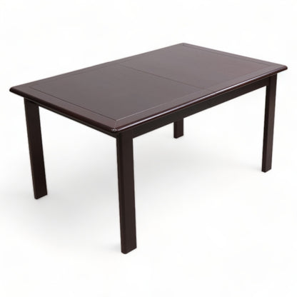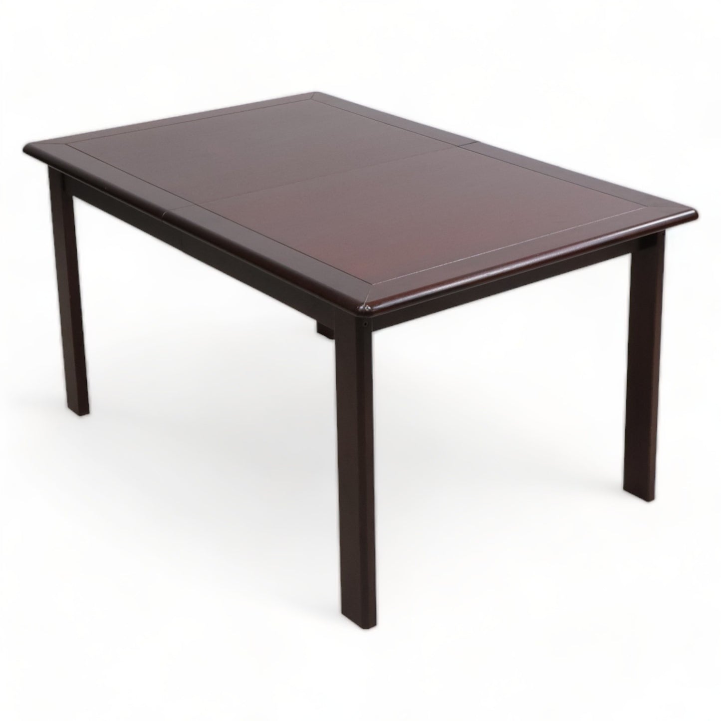 Spisebord i en elegant og klassisk stil med mørk brunt treverk. Bordet er i utmerket tilstand med lite bruksslitasje.