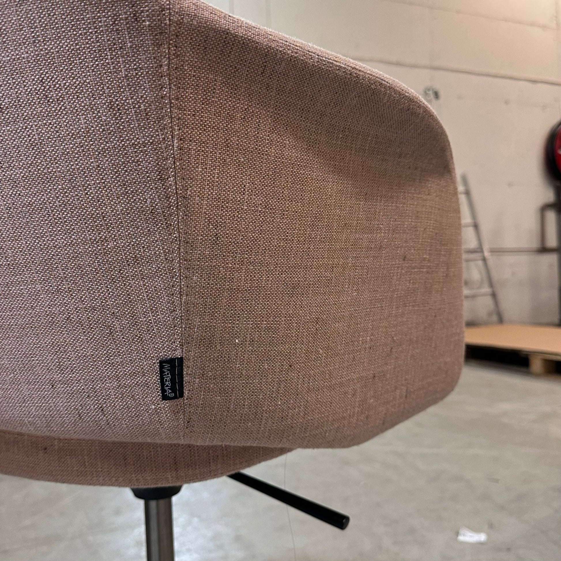 Moderne møteromsstol fra Materia med et stilrent design. Stolen har et polstret sete og rygg trukket i mykt, rosa stoff, noe som gir et friskt preg til ethvert rom. Den har en praktisk svingbar base med hjul, noe som gjør den enkel å flytte rundt i kontormiljøet. Stolen er velegnet for både møterom og kontorer, og tilfører en behagelig atmosfære.