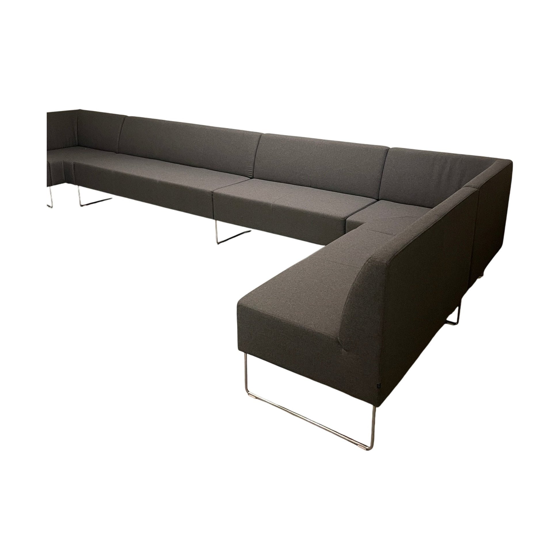 Moderne og stilren Pivot U-loungesofa fra VAD, perfekt for kontorlandskapet eller loungeområder. Sofaen er trukket i en elegant mørk grå tekstil som gir et professjonelt og tidløst inntrykk. Den U-formede designen er ideell for sosial interaksjon, samtidig som den gir et behagelig sittemiljø.