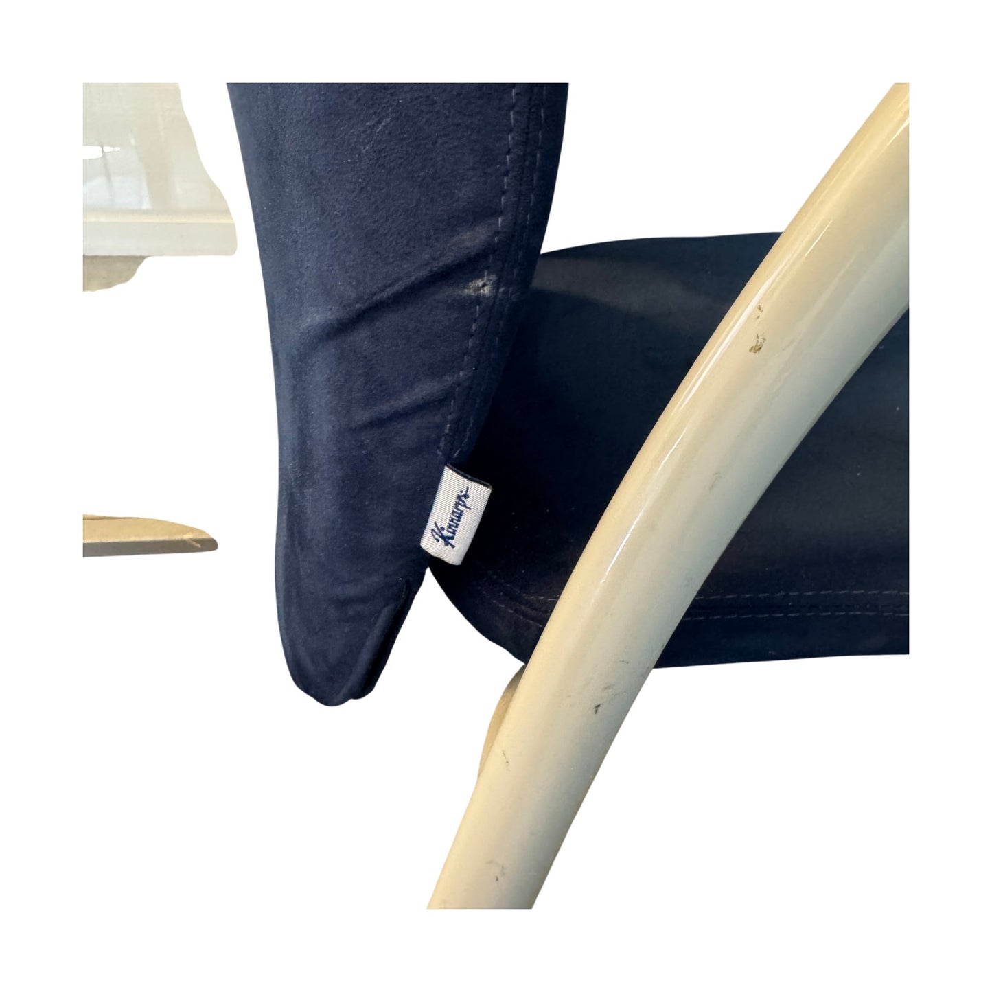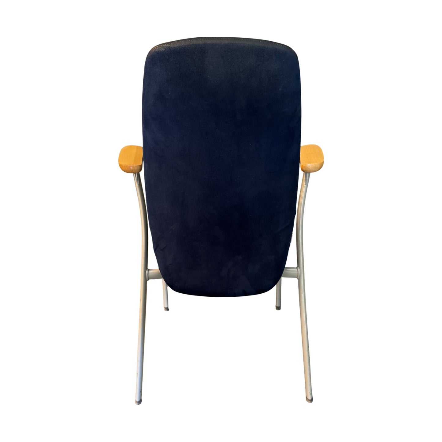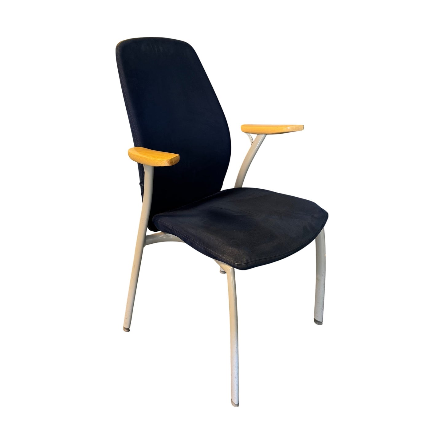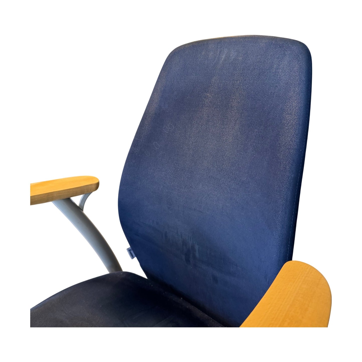 Stolen er synlig brukt med slitasje spesielt i setet og noen riper på armlener. Disse merkene er ikke veldig fremtredende grunnet fargen på armlenene. Til tross for bruksmerkene, er sittekomforten fortsatt god, og stolen er klar til bruk.