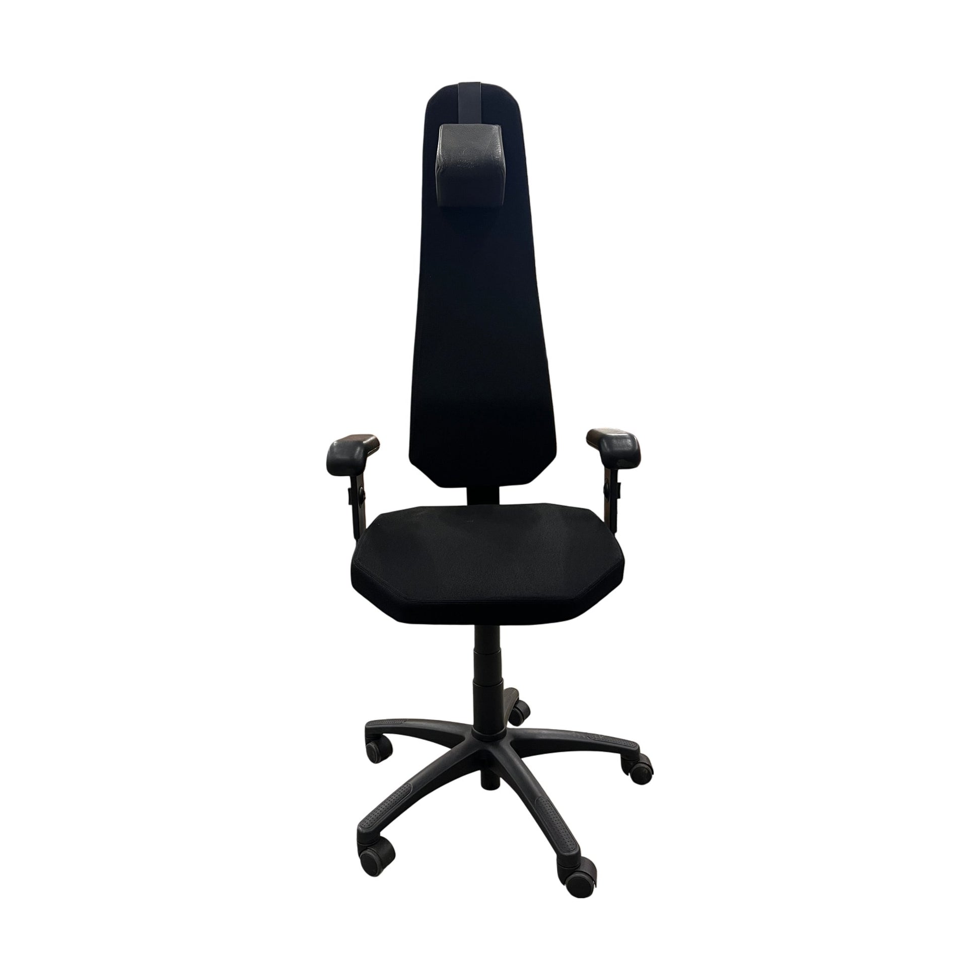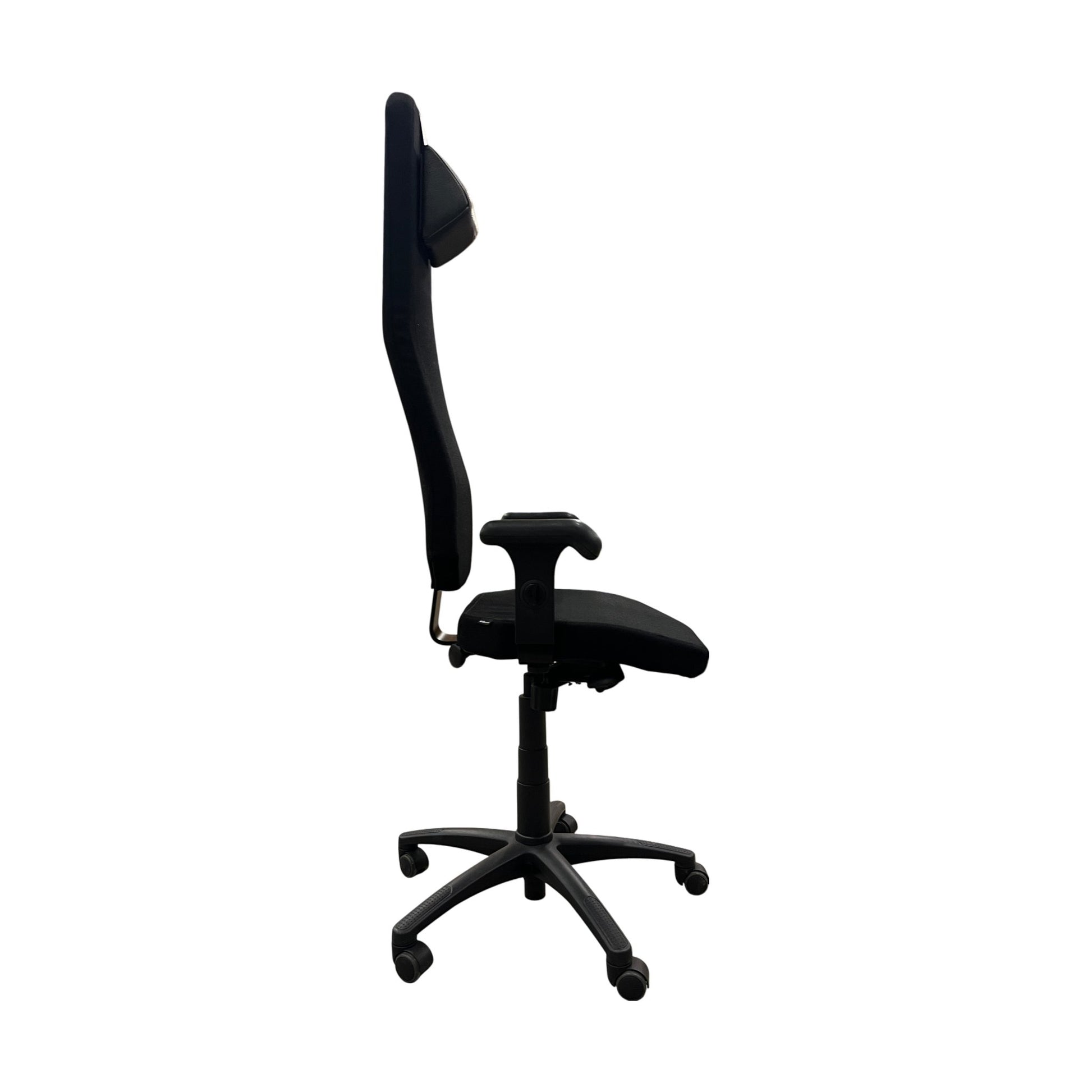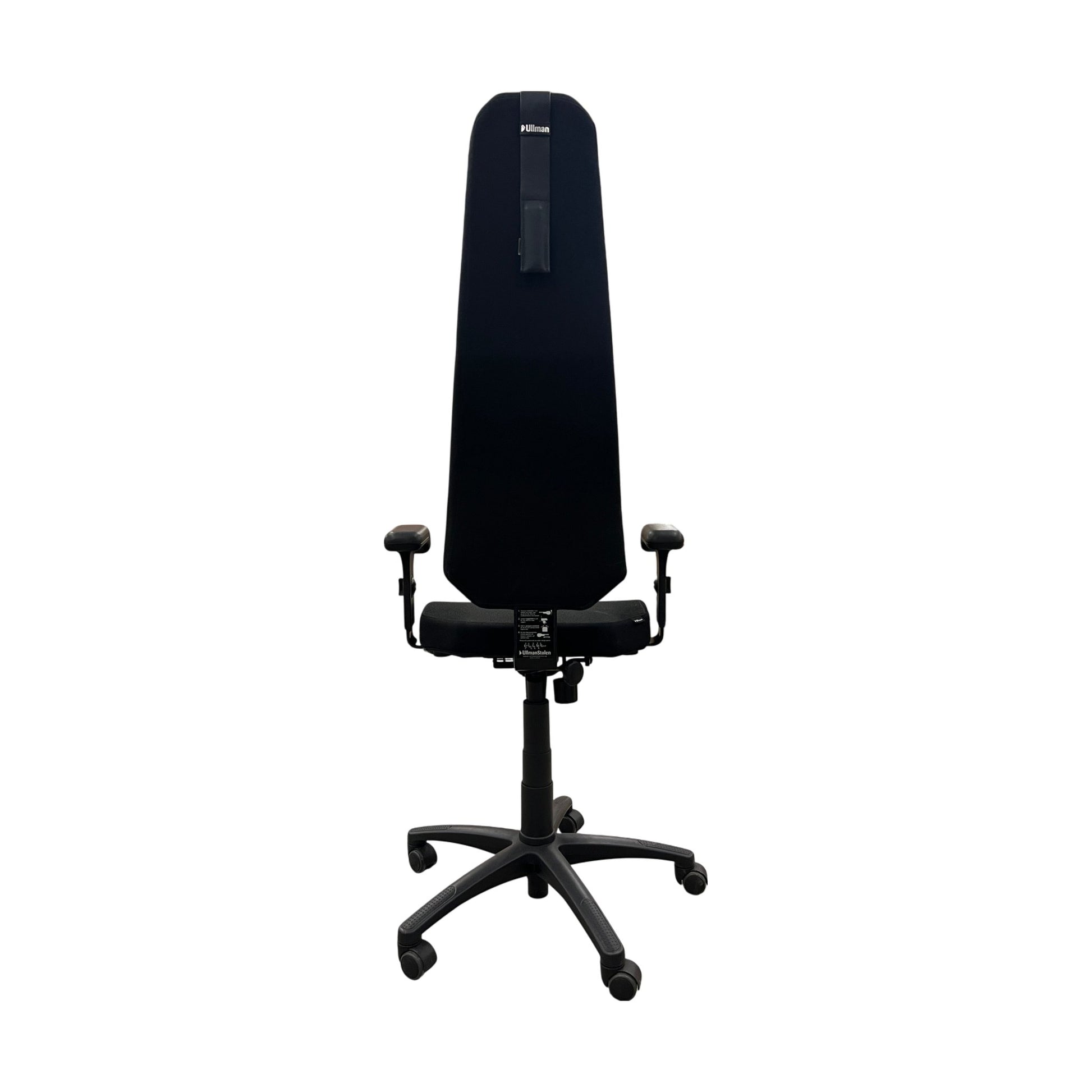 Kontorstolen Q-lite fra UllmanStolen har et moderne og stilrent design med en høy, rett rygg som gir godt støtte til ryggen. Denne stolen er kledd i svart stoff, noe som gir den et tidløst og profesjonelt utseende, perfekt til ethvert kontormiljø.