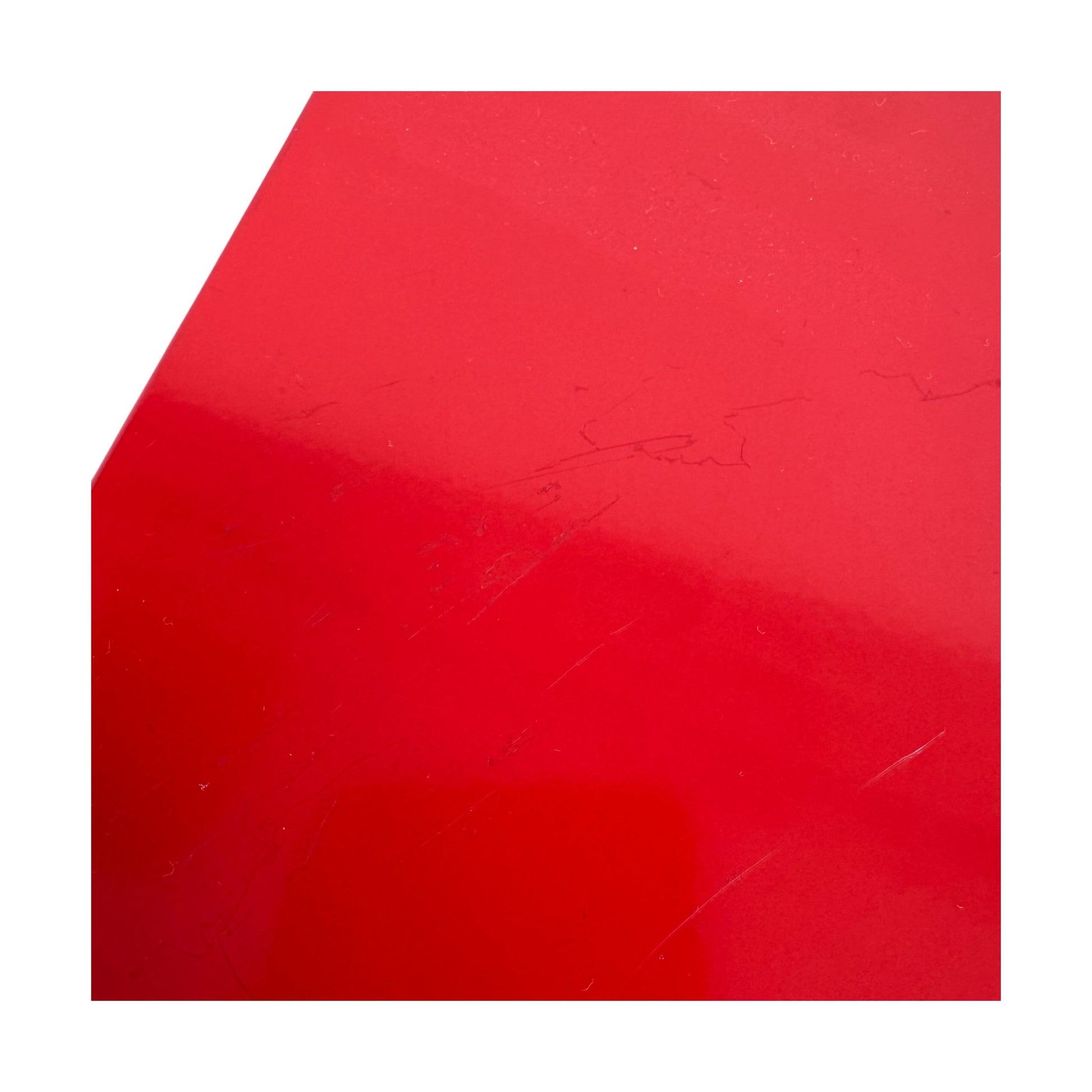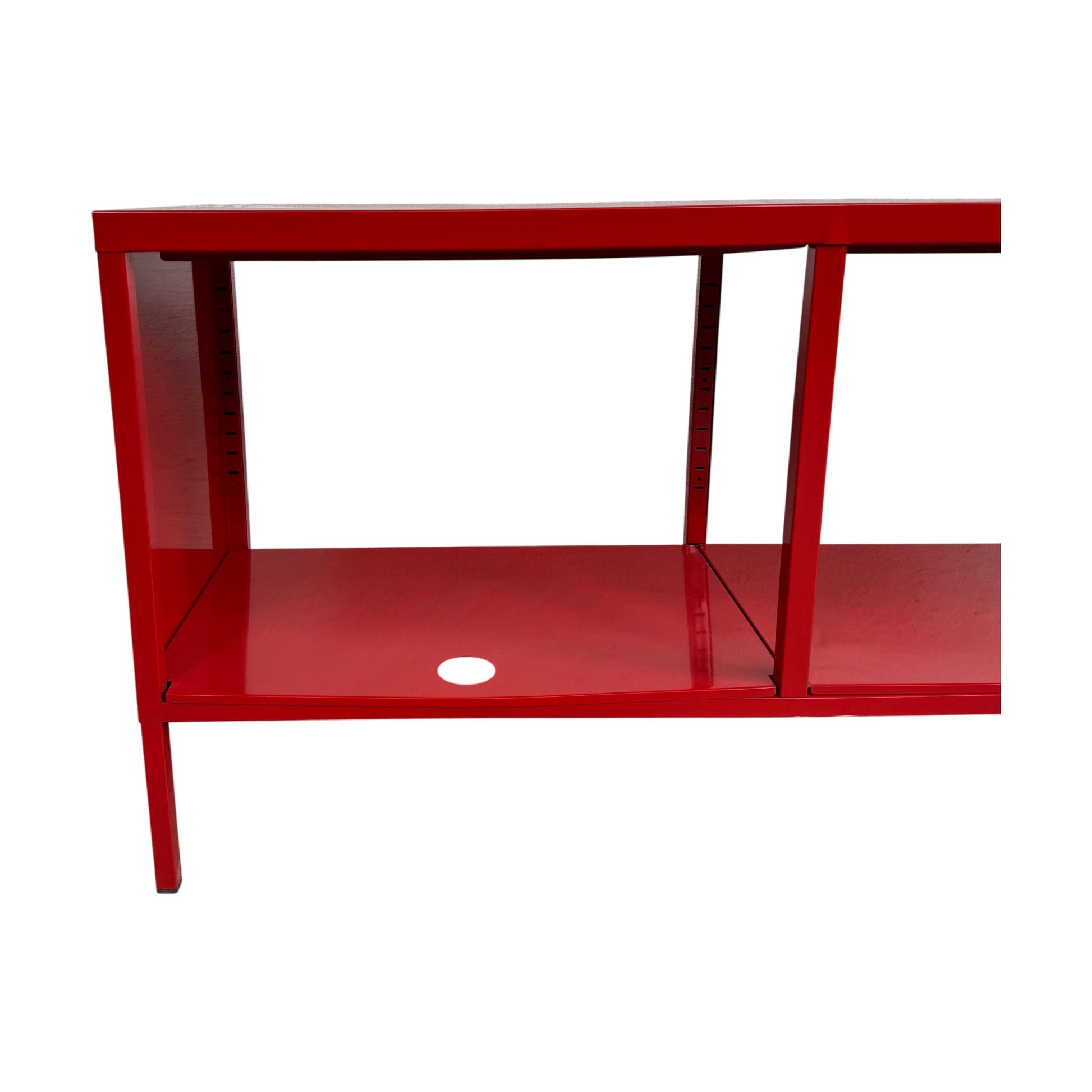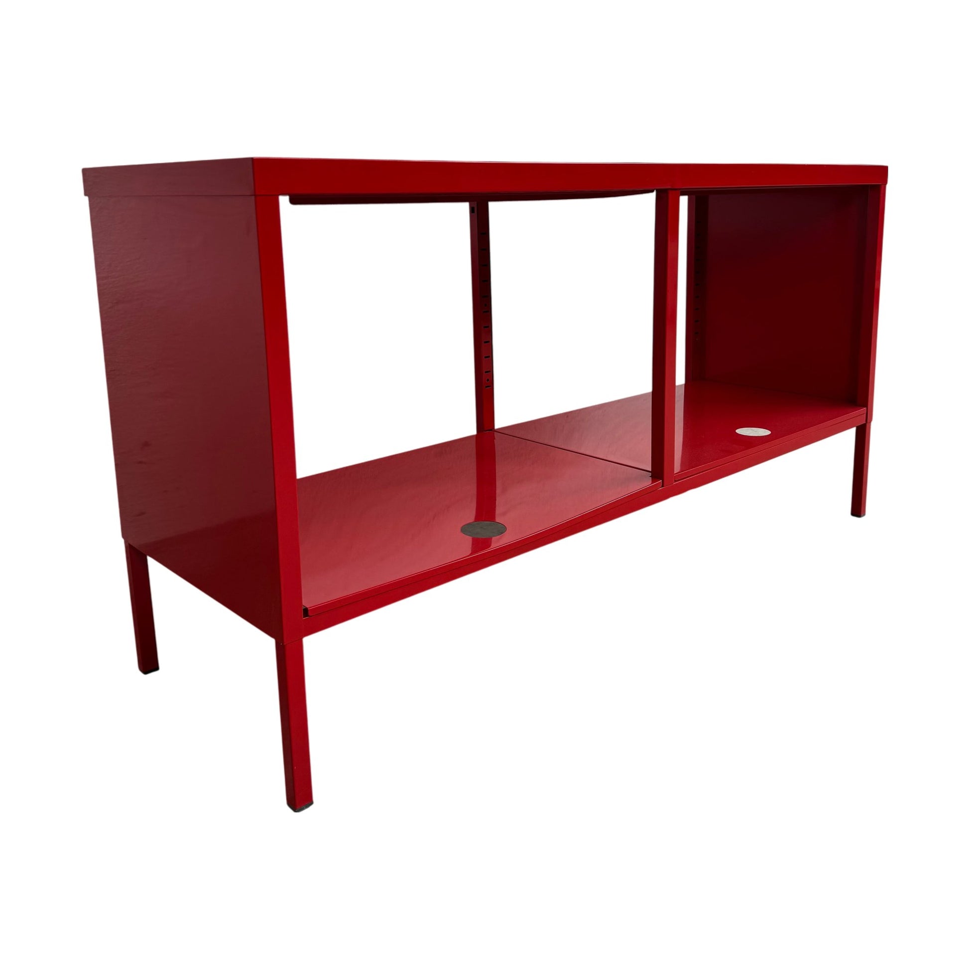 Stilig hylle i metal med en iøynefallende rød farge. Denne hyllen har et moderne uttrykk og passer perfekt til oppbevaring av bøker, planter eller dekorative gjenstander. Enkel å plassere i både stuer og inngangspartier, og gir en livlig touch til rommet.