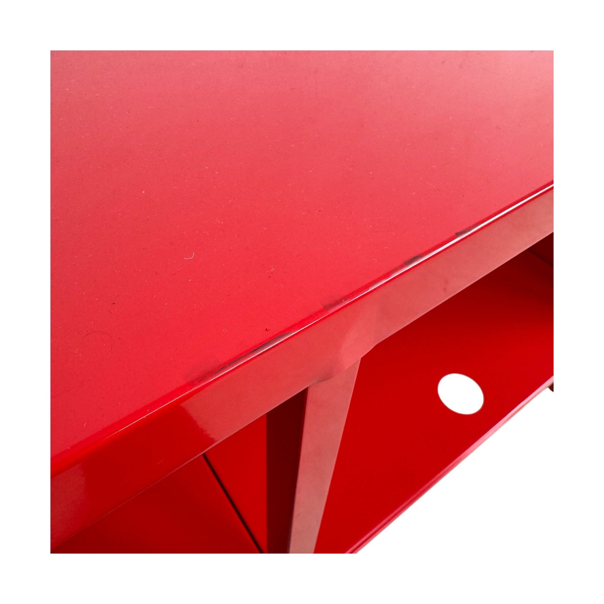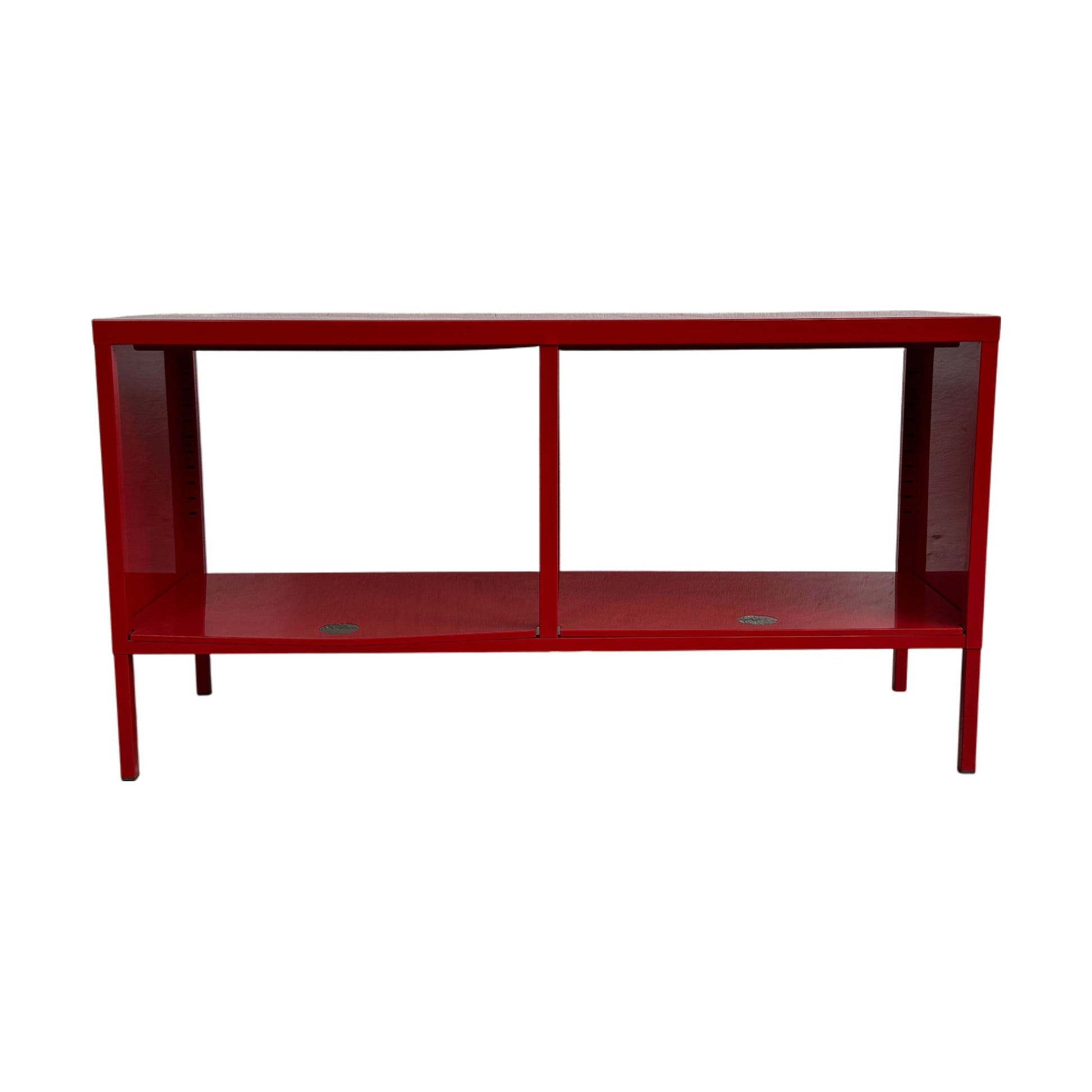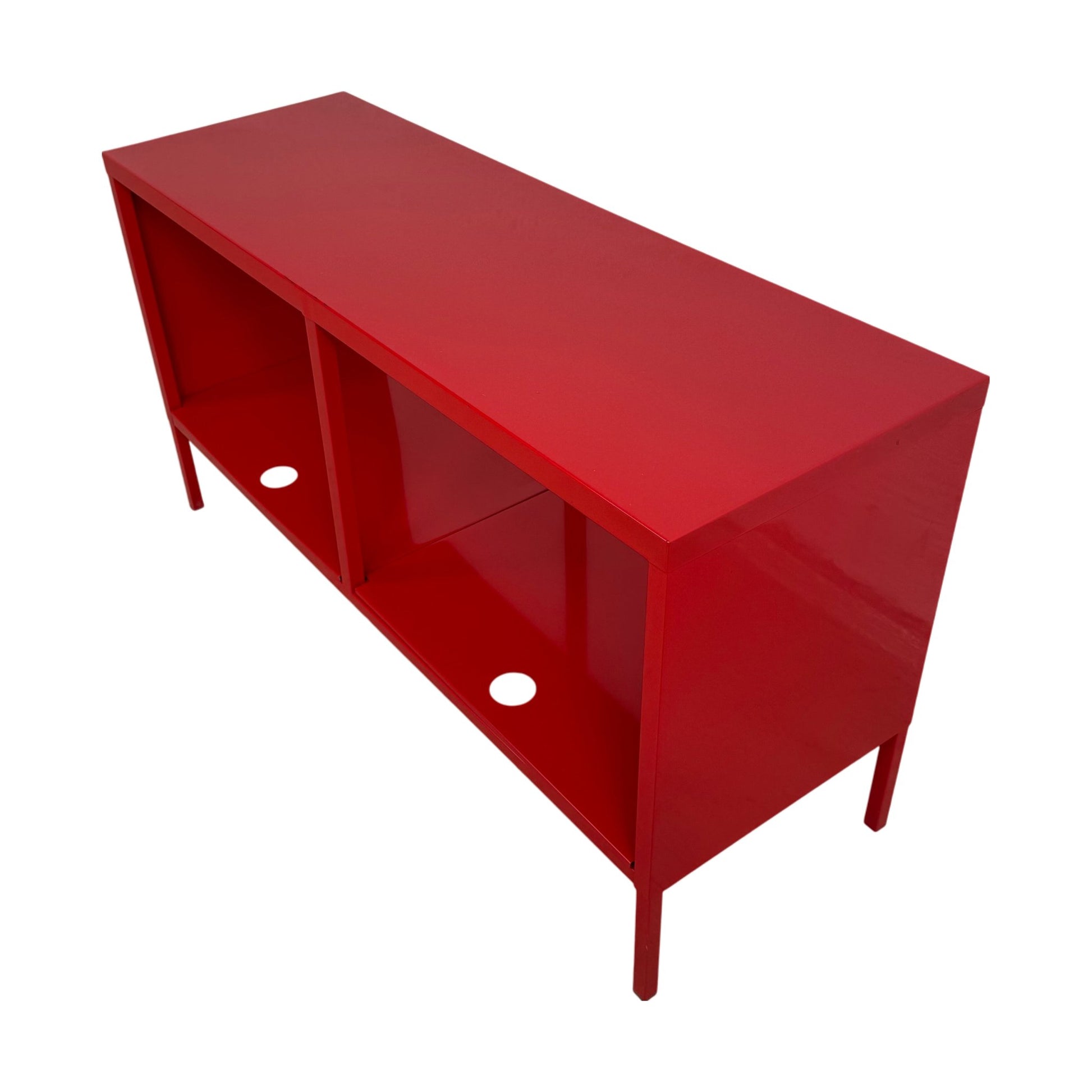 Stilig hylle i metal med en iøynefallende rød farge. Denne hyllen har et moderne uttrykk og passer perfekt til oppbevaring av bøker, planter eller dekorative gjenstander. Enkel å plassere i både stuer og inngangspartier, og gir en livlig touch til rommet.