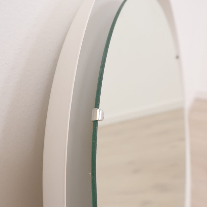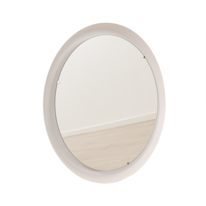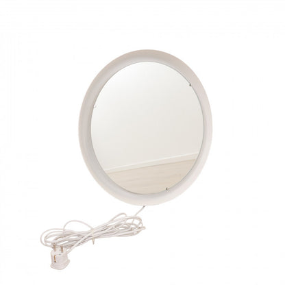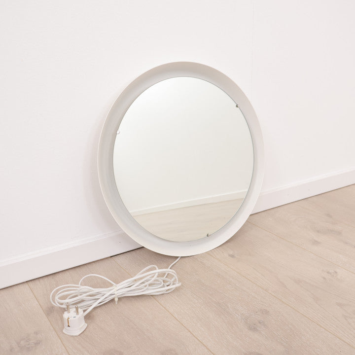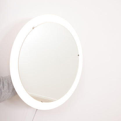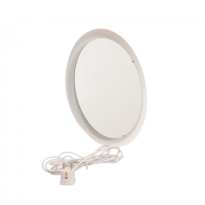 Rundt, hvitt speil med LED belysning og mulighet for veggfeste