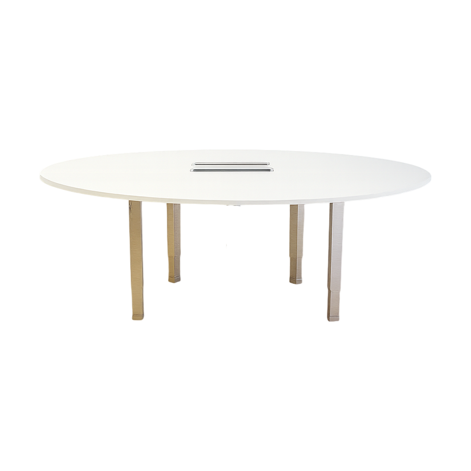 Sirkulert 2-delt møtebord med en elegant og slitesterk lys grå bordflate som gir et moderne og stilrent uttrykk. Bordet er utstyrt med praktiske integrerte stikkontakter for enkel tilkobling av teknologisk utstyr, noe som gjør det ideelt for møter og samarbeid i kontormiljøer.Den romslige diameters på 180x180 cm gir plass til flere deltakere og muliggjør effektive diskusjoner og idémyldringer.