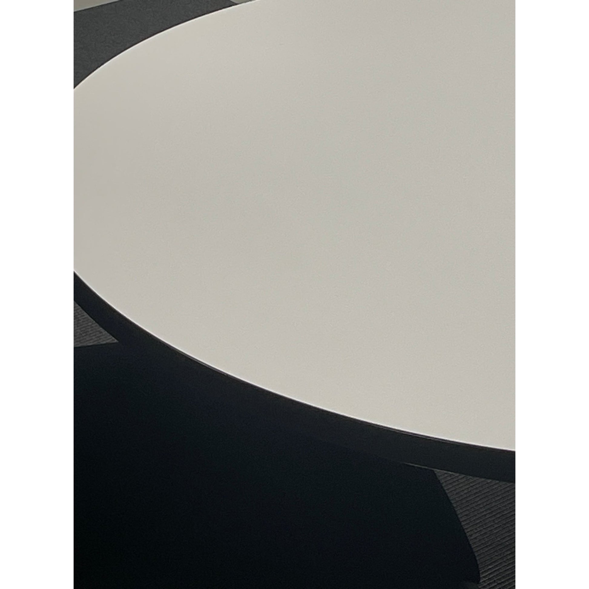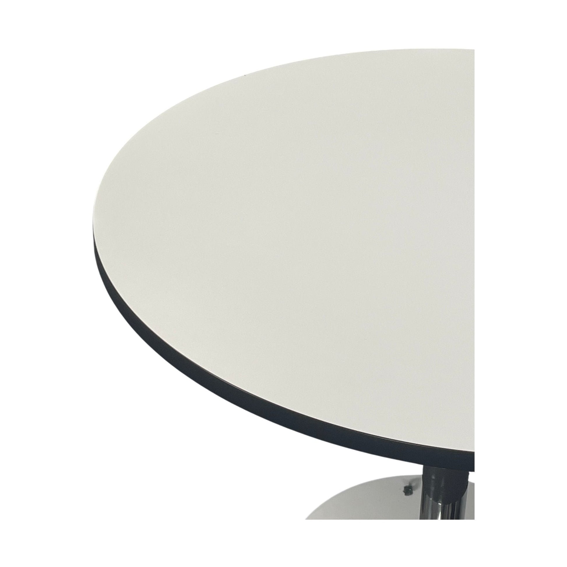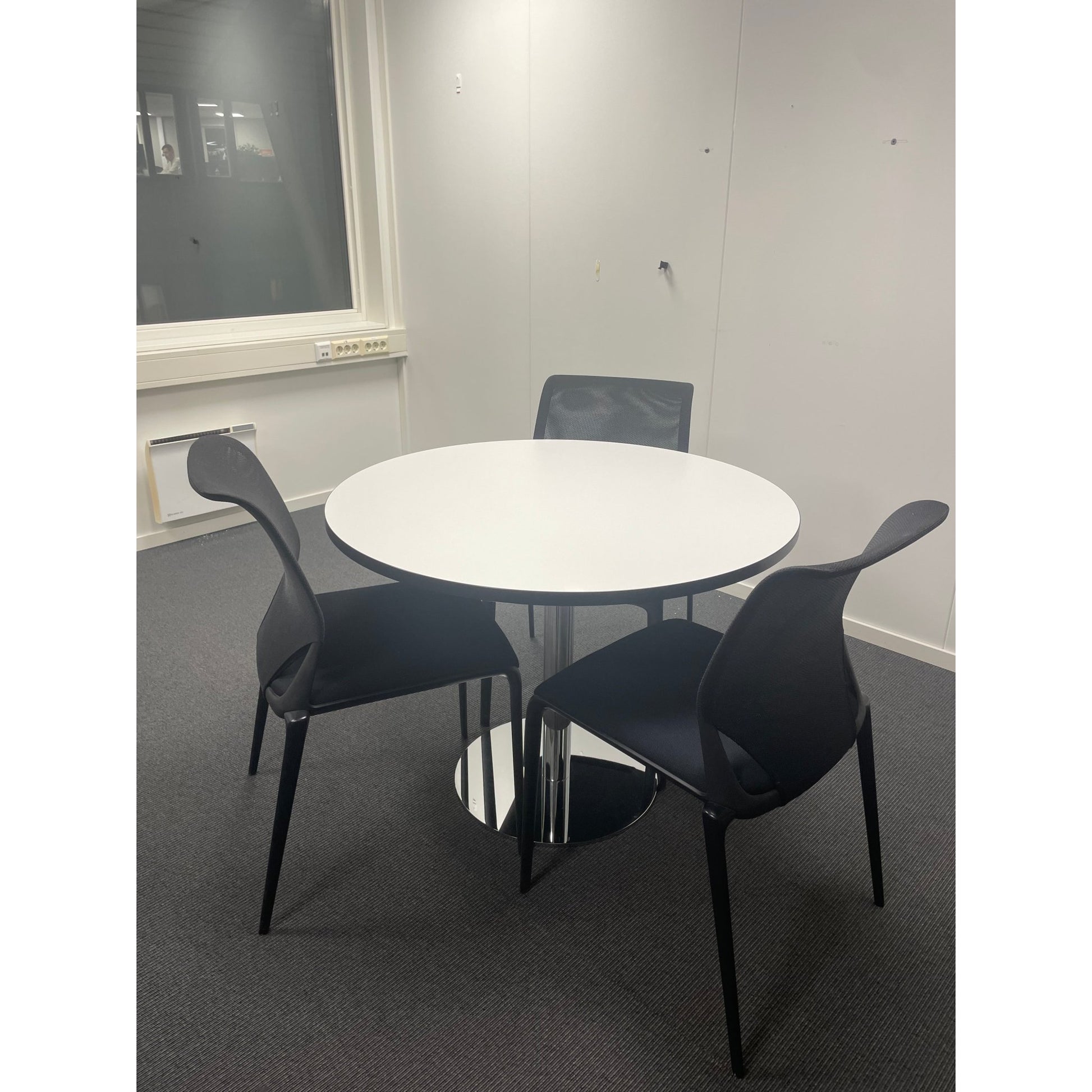 Rundt møtebord med en stilren hvit laminat bordplate og et glanset krom understell. Dette bordet tilfører et moderne preg til ethvert kontor eller møterom.