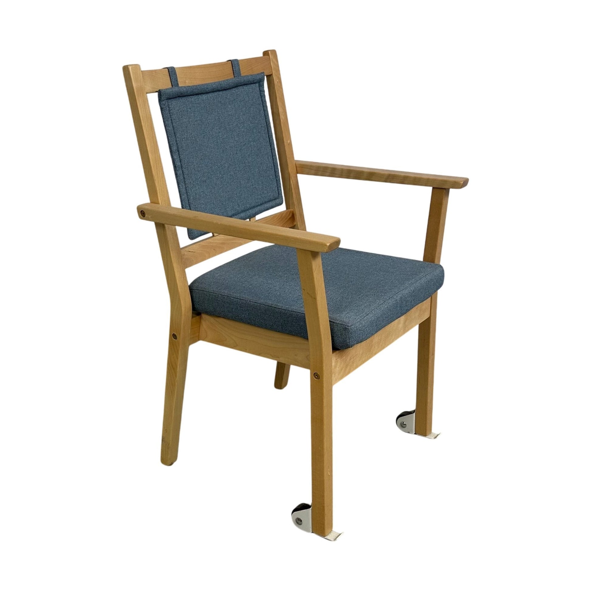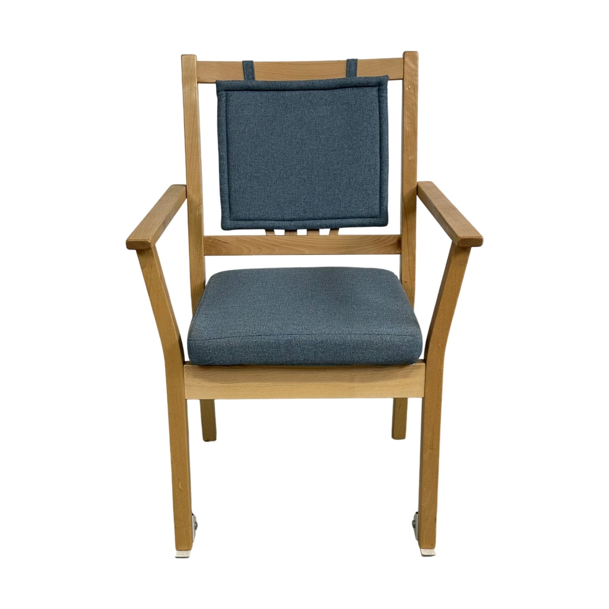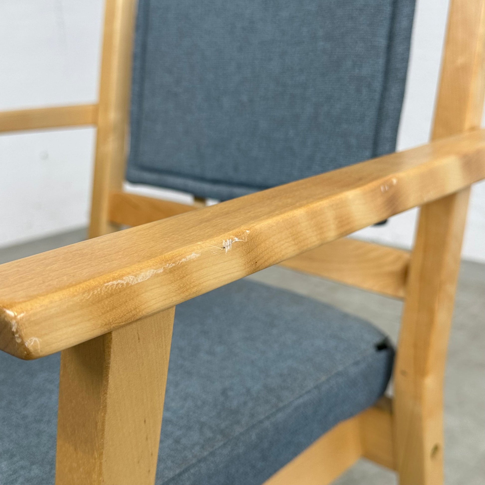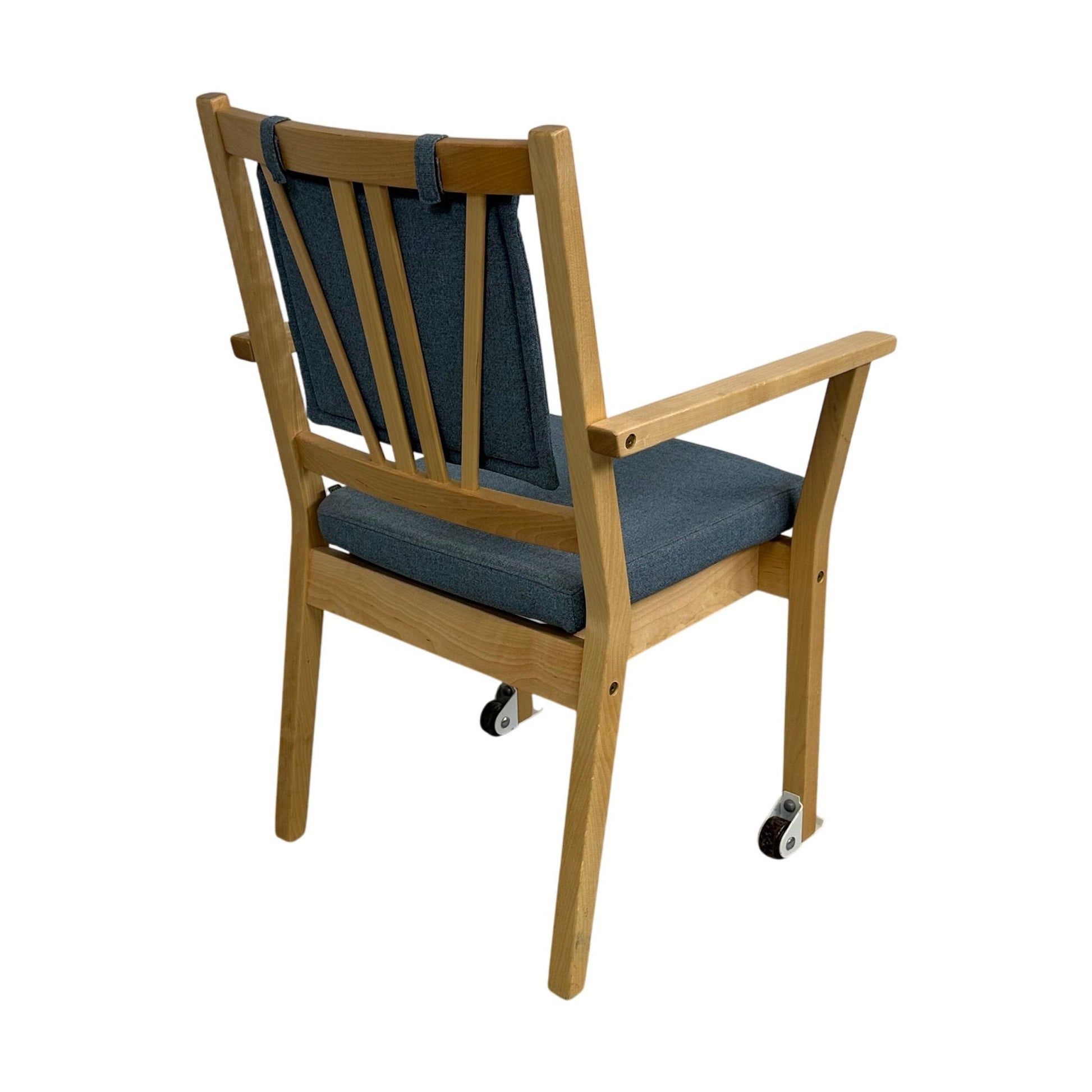 Stolen har et grått stofftrekk og armlener som gir ekstra komfort. Den slanke designen gjør at den passer godt rundt spisebordet eller som en ekstra stol i stuen.Stolens robuste treramme har fått noen merker, spesielt på den ene siden av armlenet og på bena, som er synlige ved nærmere inspeksjon. Se produktbilder for mer informasjon.