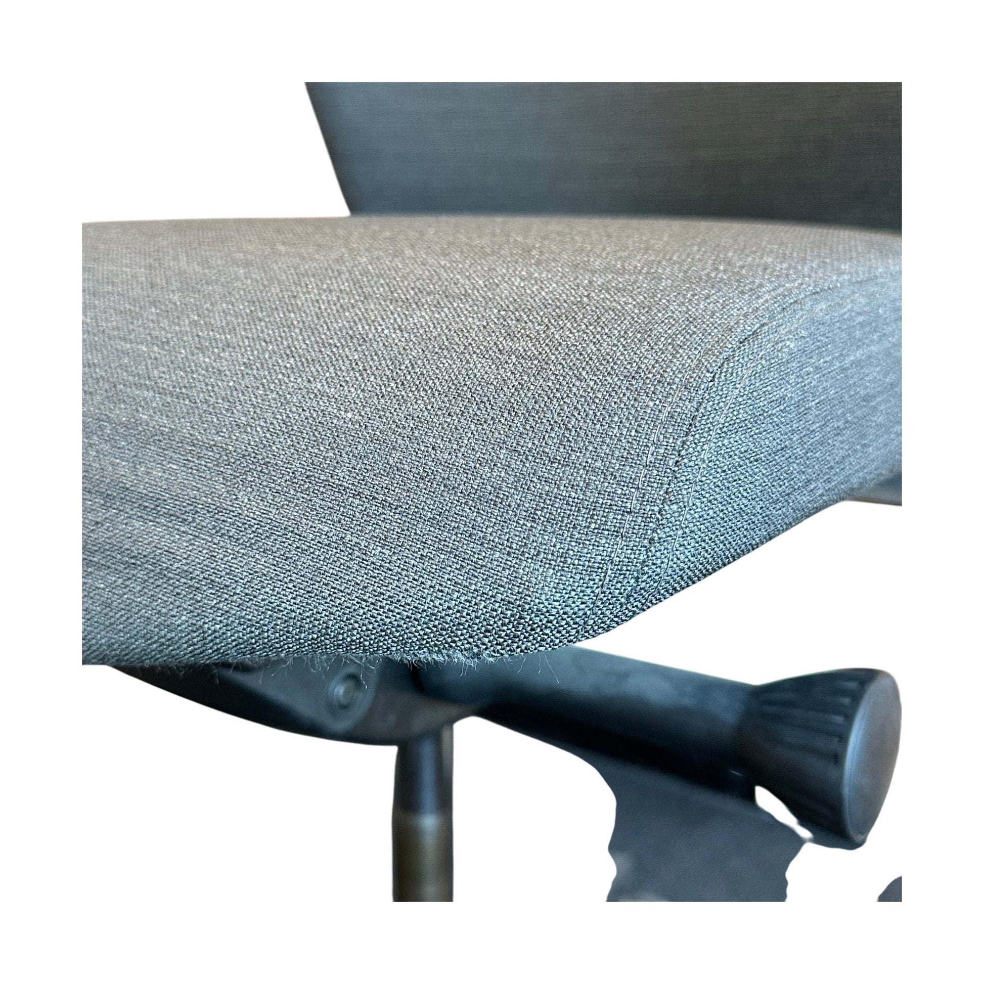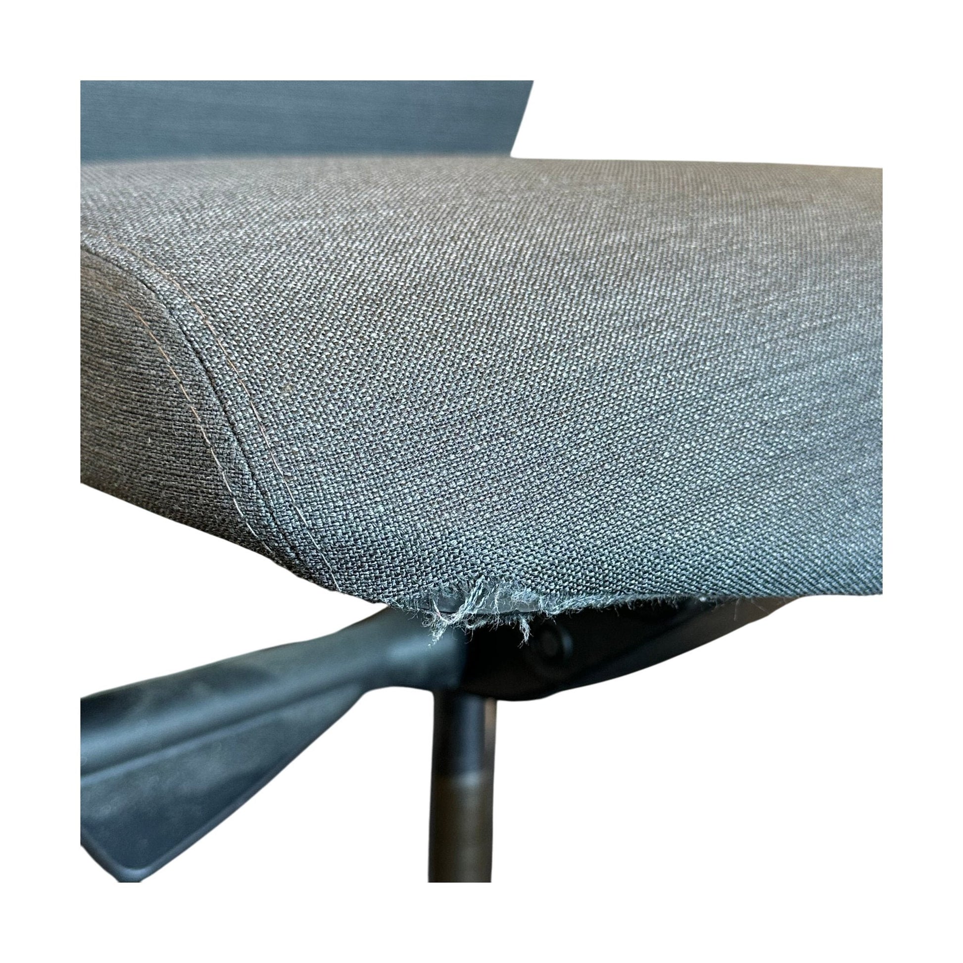 - Materiale: Grå tekstil på sete og rygg, med svart understell