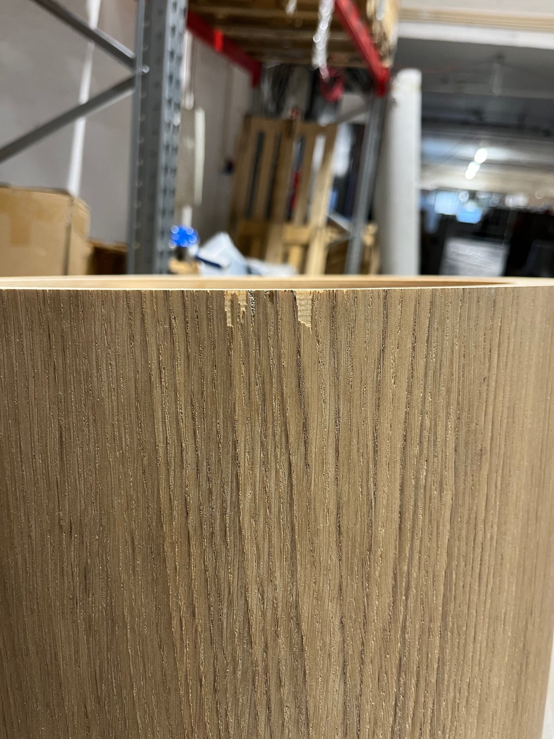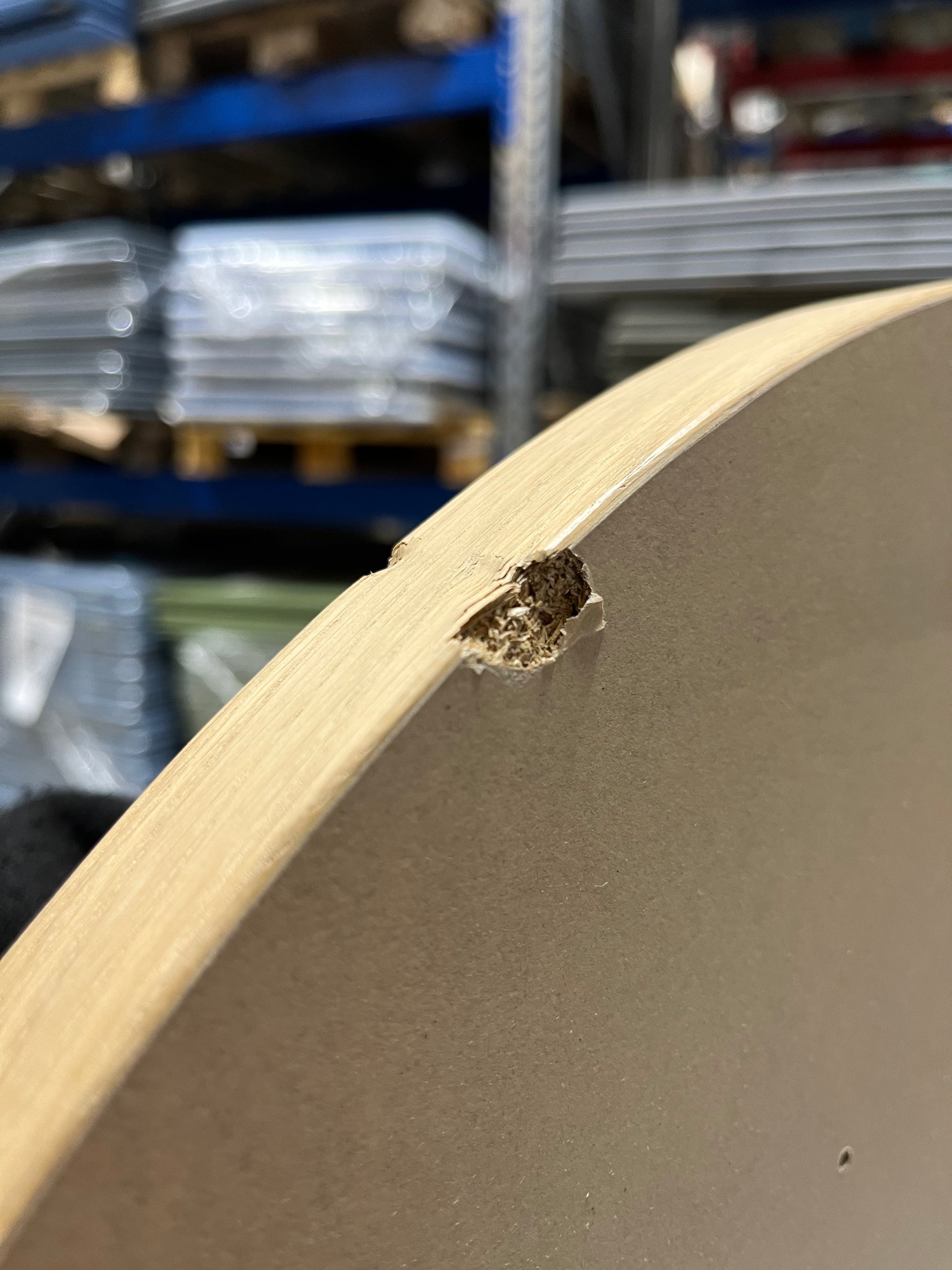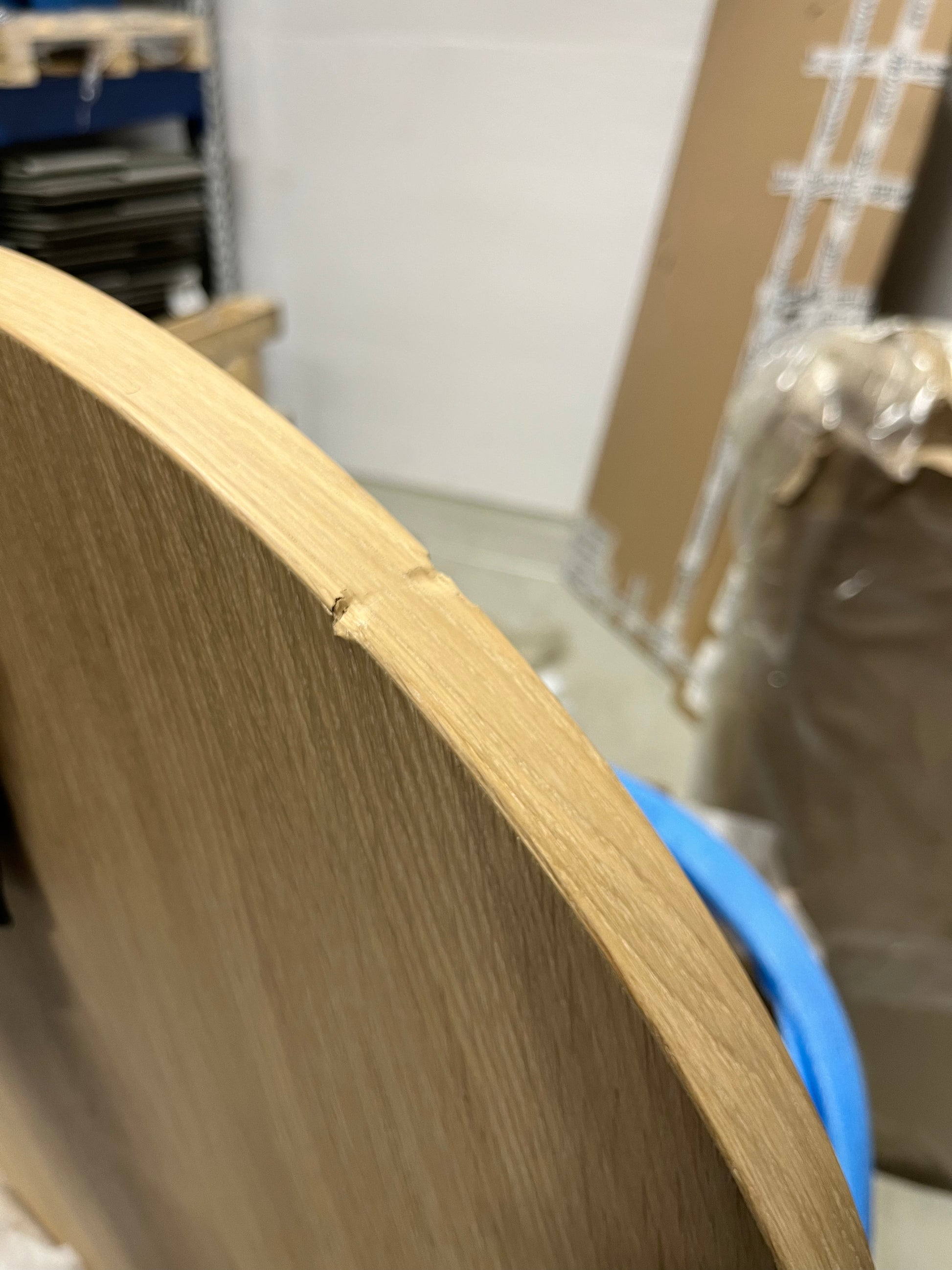 Bordet er i god tilstand med to skader, men helhetsinntrykket er fortsatt svært godt. Det er behandlet med et beskyttende lag mot flekker, og ved regelmessig behandling vil det holde seg pent gjennom mange år.