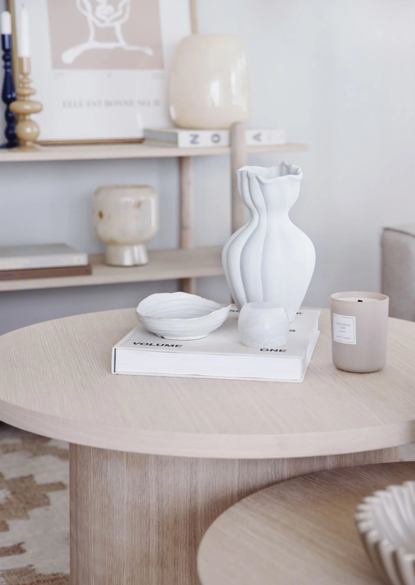Selja Sofabord fra Kid er et rundt og robust bord i skandinavisk stil som tilfører et elegant preg til enhver stue. Dette bordet, laget av eikefiner i en lys beige farge, har myke linjer og en solid sokkel som understreker det moderne designet.