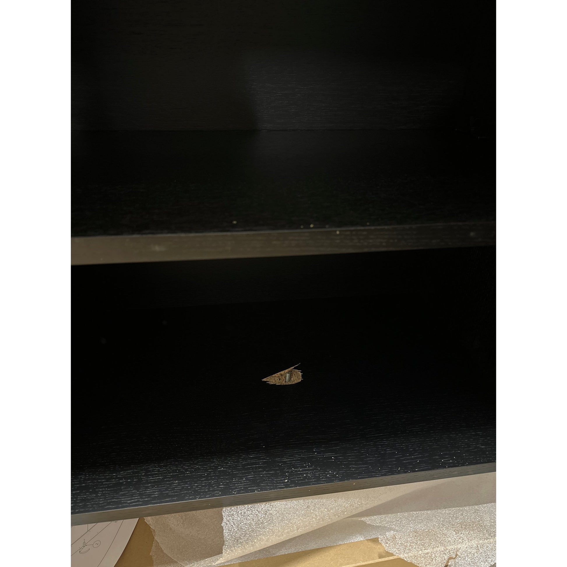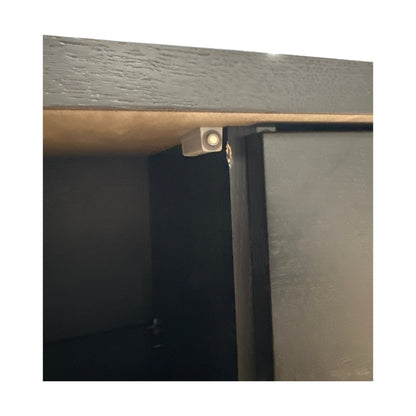 Skjenken er i god stand, men den automatiske åpningsmekanismen på dørene fungerer ikke. Det innebærer at dørene må åpnes fra bunnen som en vanlig dør. Det er et hakk nederst på den midterste døren etter at benet i midten har gått i gjennom rammen som vist på bildet. Disse feilene påvirker ikke skjenkens funksjonalitet, og den forblir en praktisk og stilig løsning for oppbevaring.