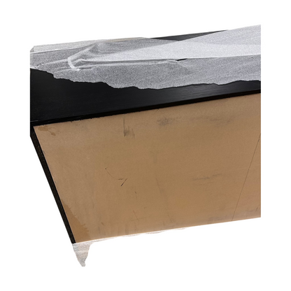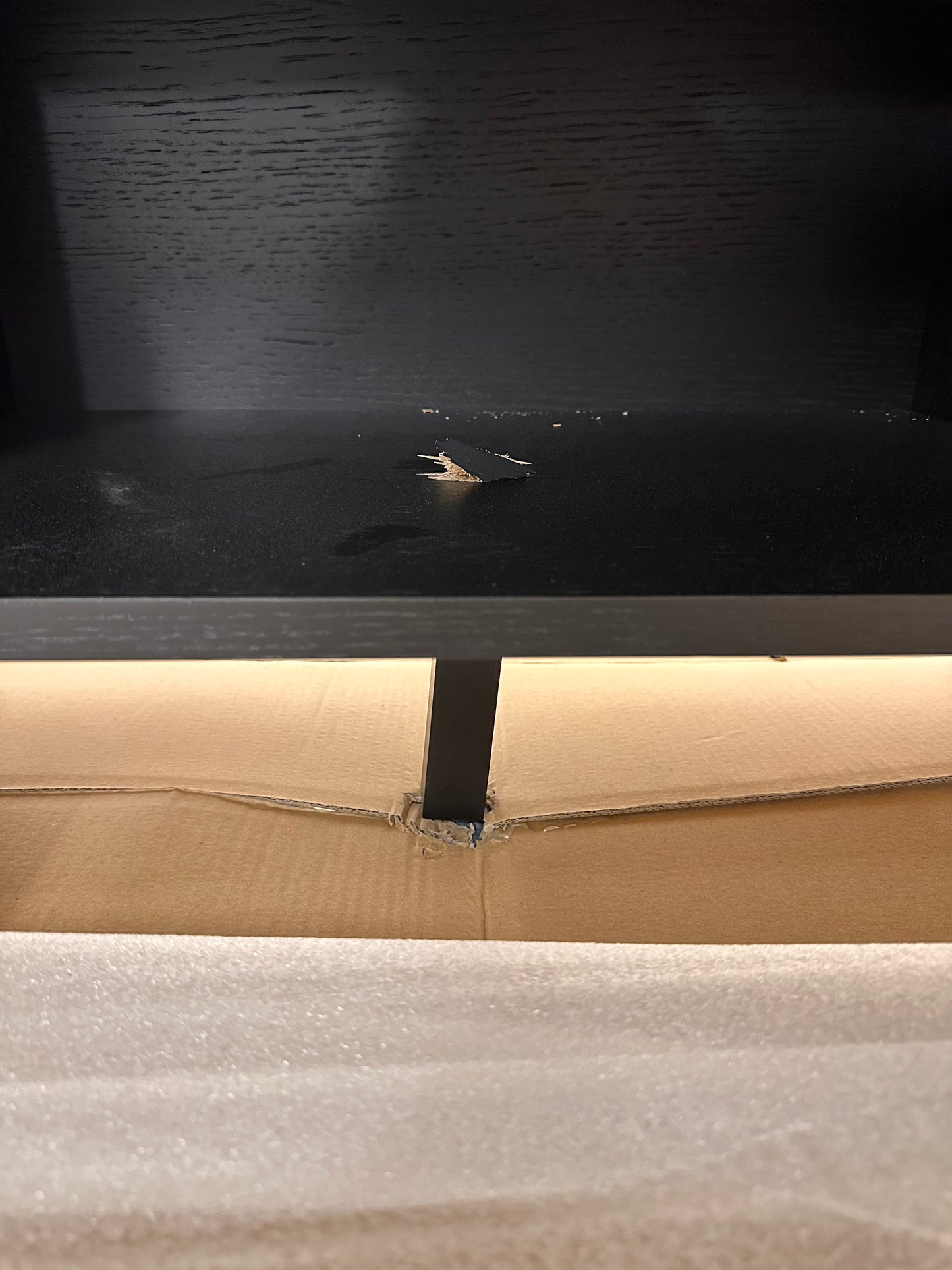 Skjenken er i god stand, med noen mindre skader. Den har et hull i bunnen der støttebenet har gått igjennom rammen; dette påvirker ikke stabiliteten. Dørene åpnes ikke med magnetenes "sprett opp"-funksjon, men må åpnes fra kanten eller bunnen. Det er også noen merker på baksiden, men dette har ingen innvirkning på bruken av skapet. Se bilder for detaljer.
