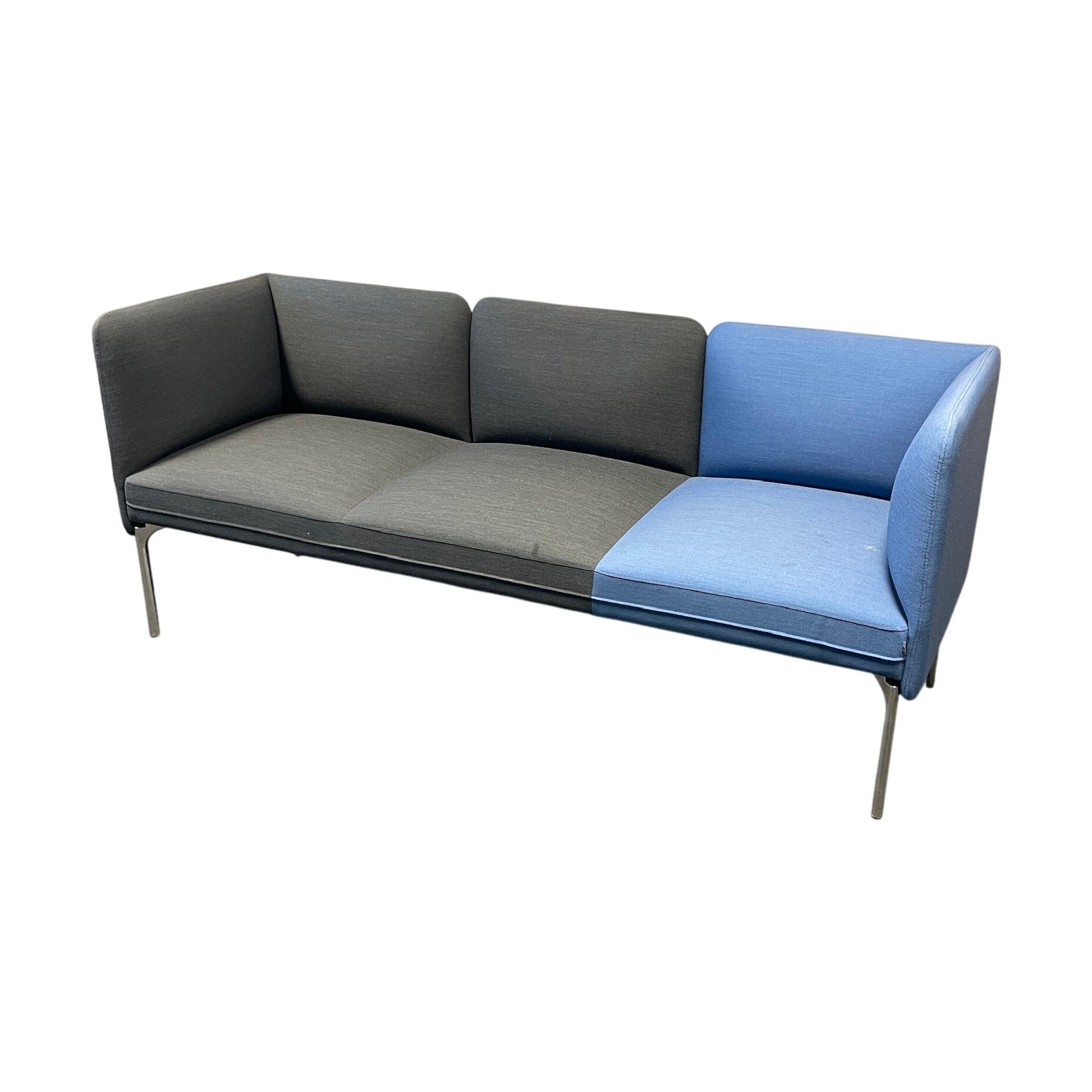 Moderne og stilren Senso loungesofa fra Fora Form, designet med en kombinasjon av grå og blå farger. Denne modulsofaen passer perfekt inn i kontorlandskapet, og dens unike fargekombinasjon gir et friskt og livlig preg. Sofaen gir et behagelig og innbydende sittemiljø, samtidig som den skaper avskjerming mellom arbeidsplasser.