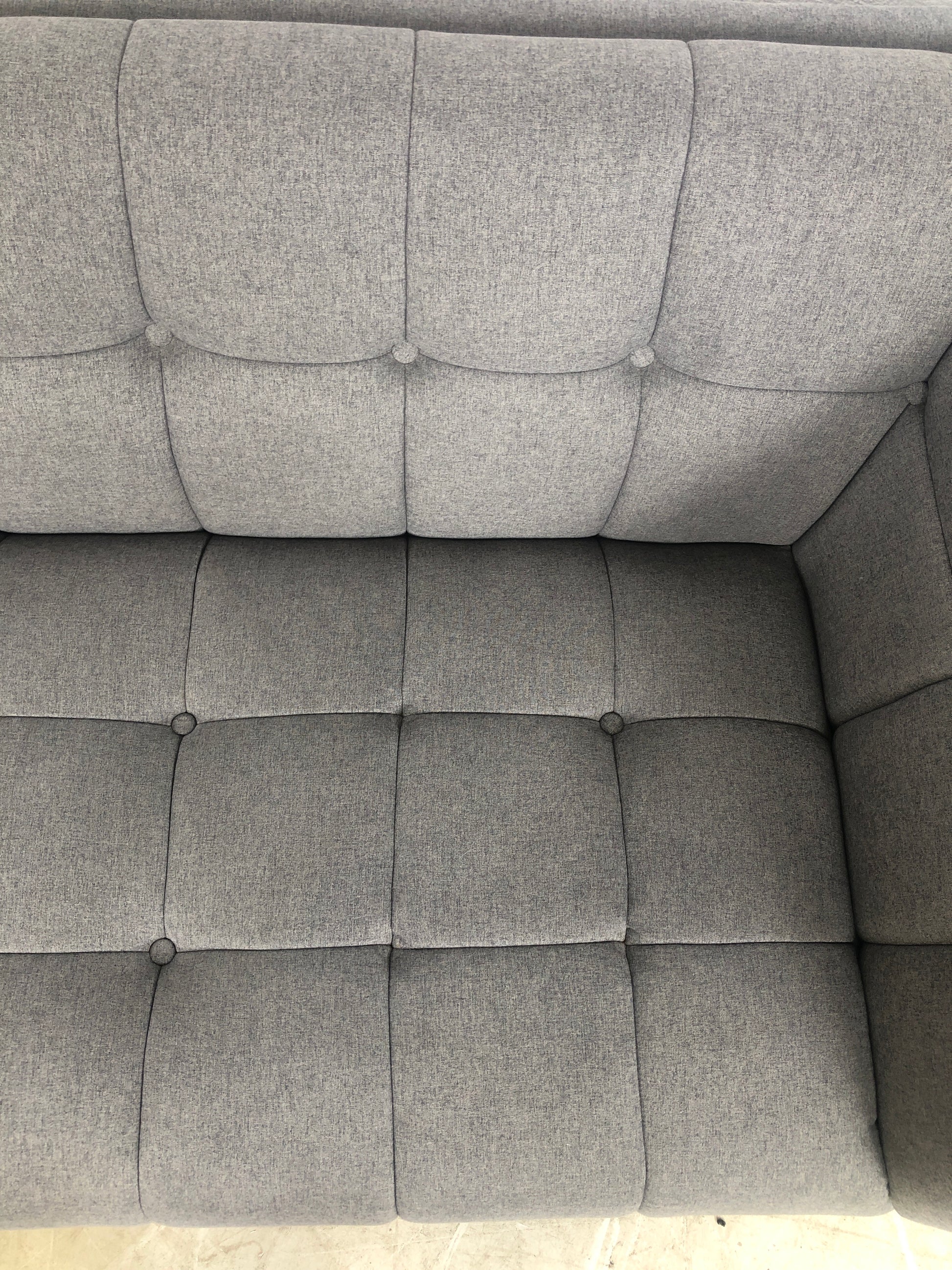 Sofaen er i god tilstand med minimale brukstegn. Det mangler tre av knappene i sitteområdet som vist på bildene. Det er også noe rust under knappene, men dette er ikke synlig. Helhetsinntrykket er fortsatt svært godt, og sofaen gir en komfortabel sitteopplevelse.