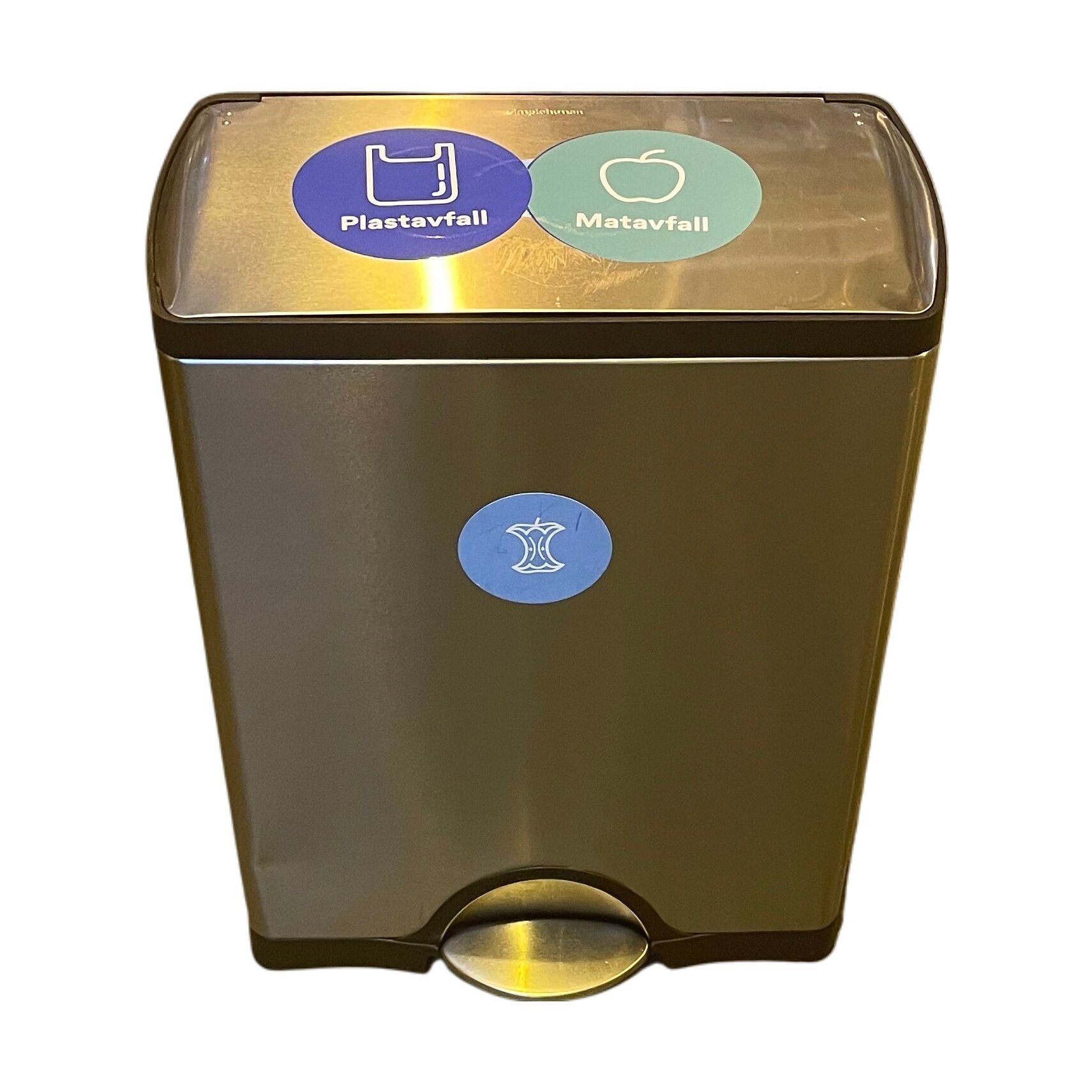 Simplehuman Dual rektangulær dobbel søplebøtte er en elegant løsning for avfallshåndtering på kontoret. Med en størrelse på 50x26x65 cm og en kromfinish, tilfører den et moderne preg til ethvert rom. Den har separate åpninger merket for plastavfall og matavfall, noe som gjør den praktisk og funksjonell. Vi tilpasser merkingen etter beste evne ut fra ønskene som oppgis ved bestilling.