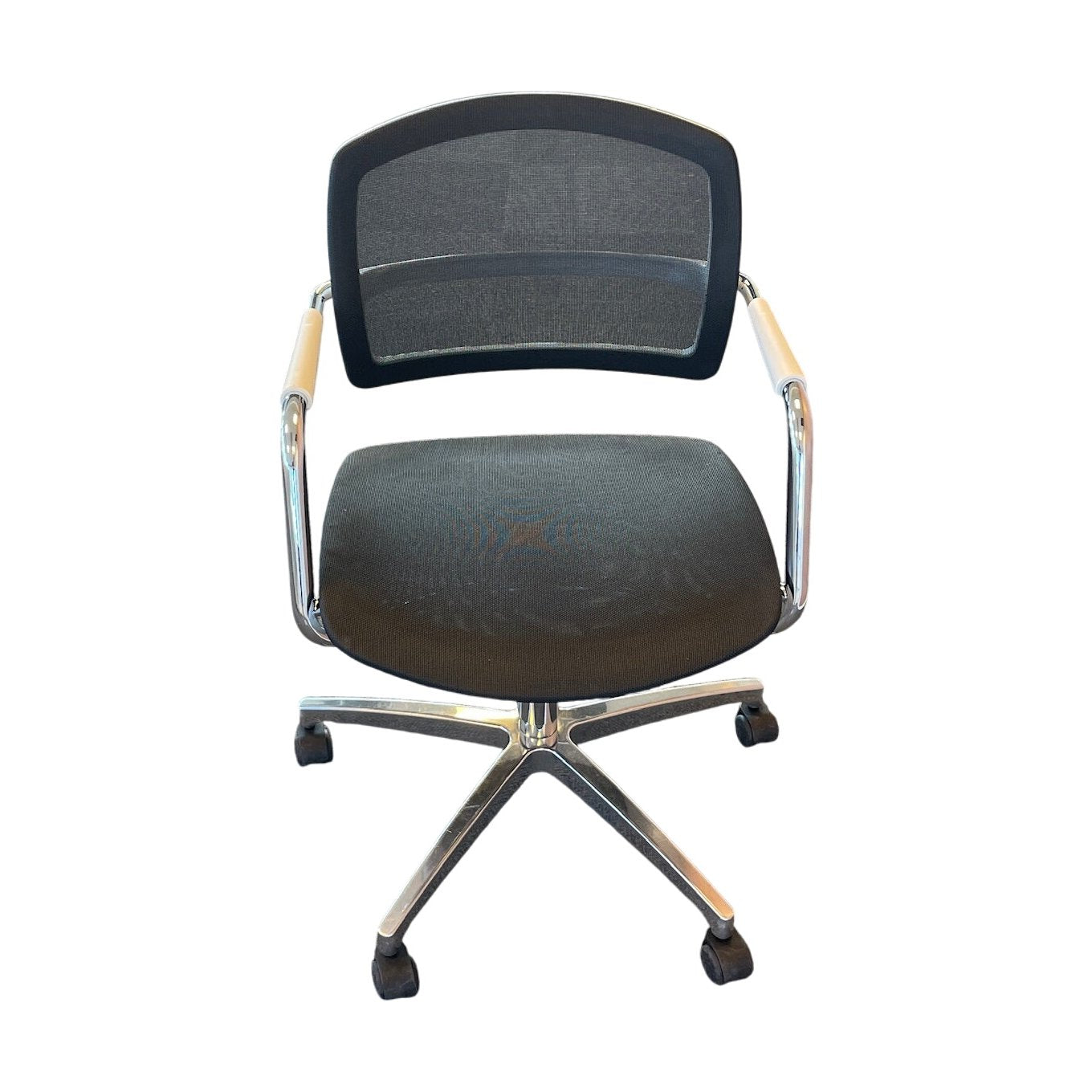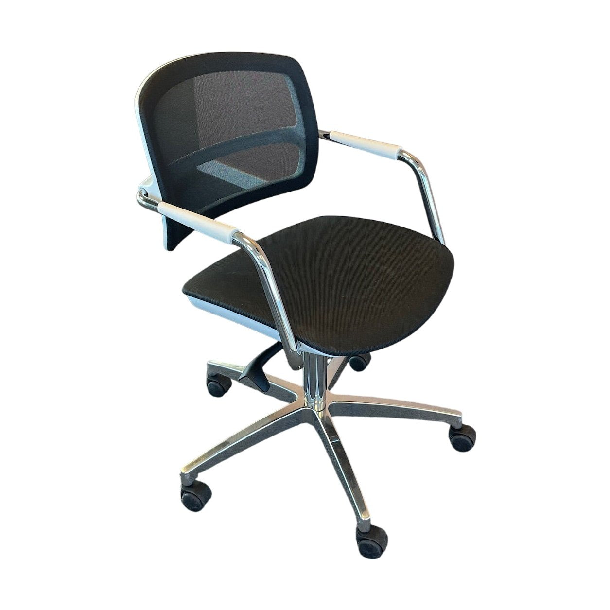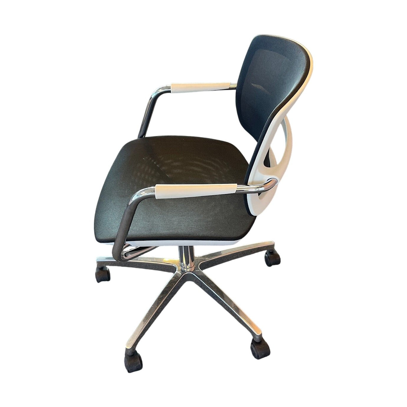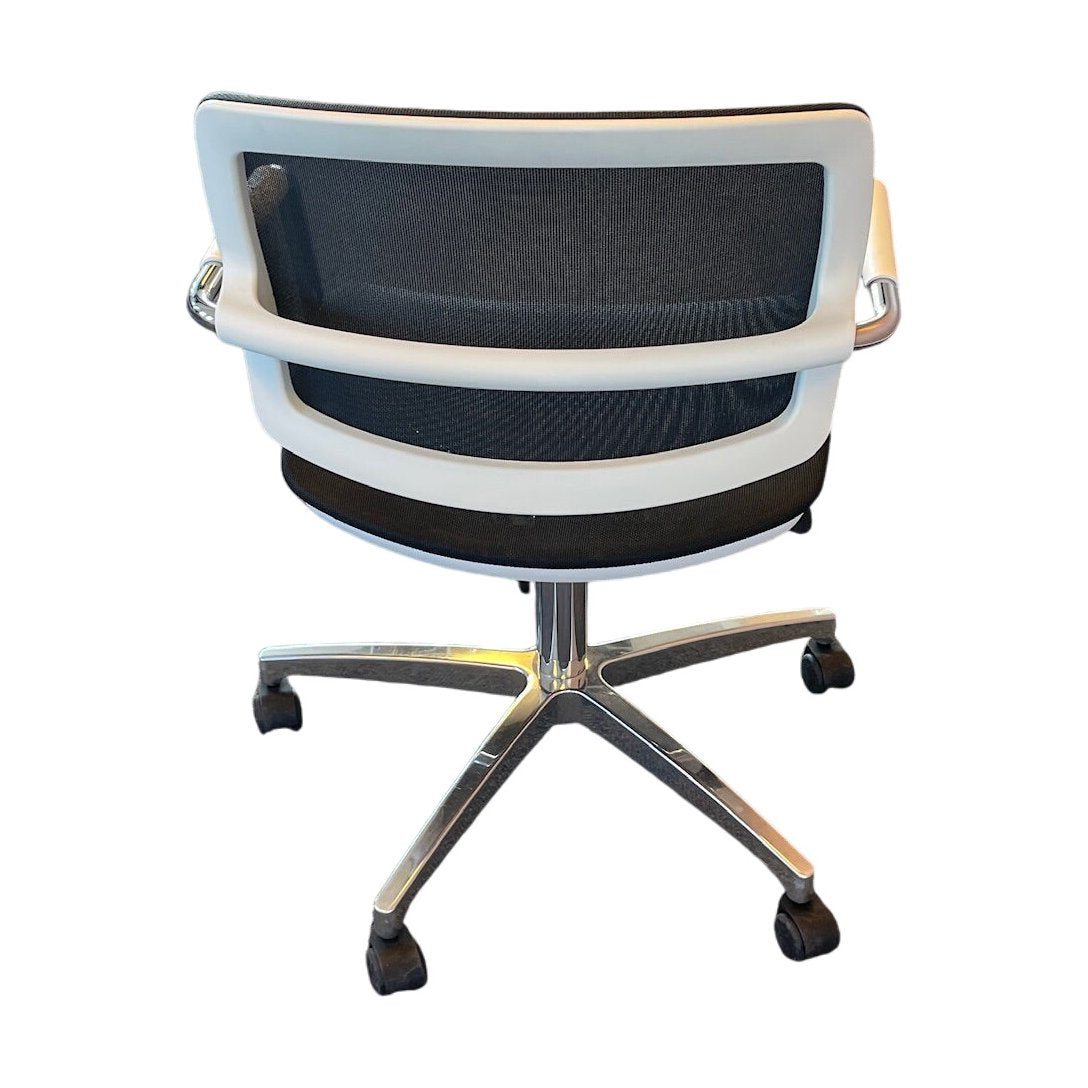 Moderne møteromsstol fra Sitland med et stilrent og funksjonelt design. Stolen har en justerbar høyde og et komfortabelt sete, som er ideelt for både møter og kontorbruk. Den hvite rammen gir et friskt uttrykk, mens den svarte setet og ryggstøtten av mesh gir god ventilasjon og komfort. Stolen er også utstyrt med hjul for enkel bevegelse, noe som gjør den praktisk i alle typer arbeidsmiljø.