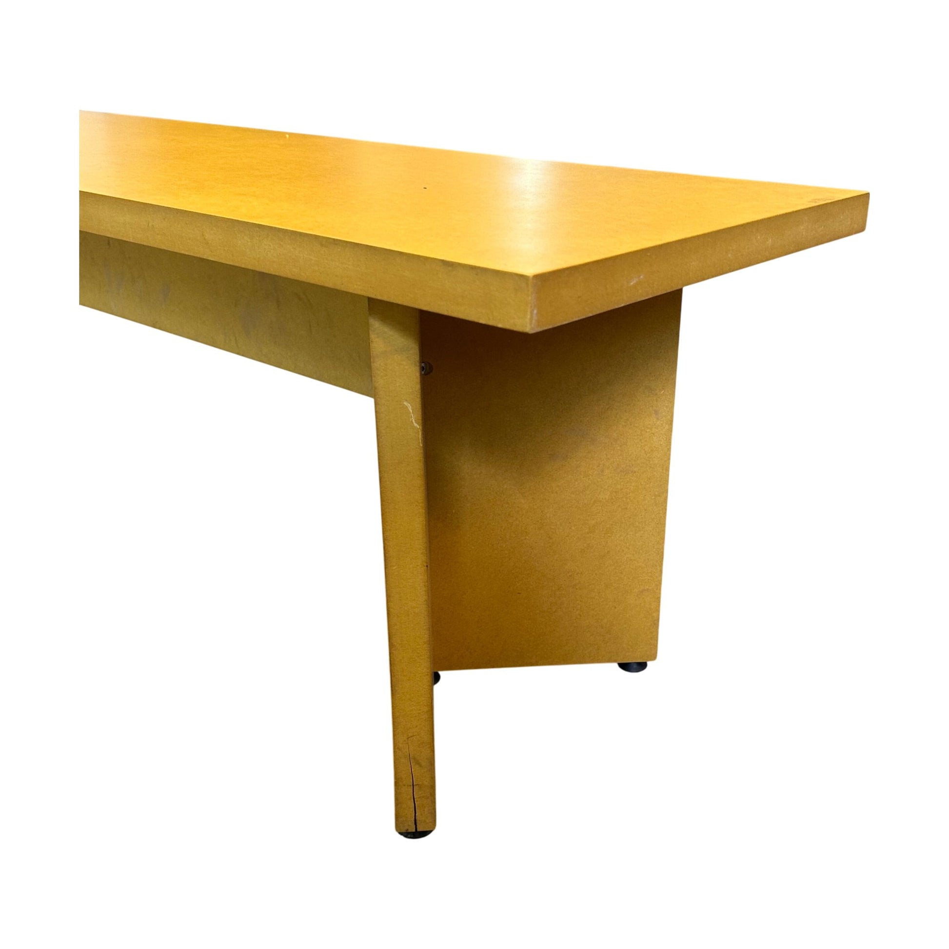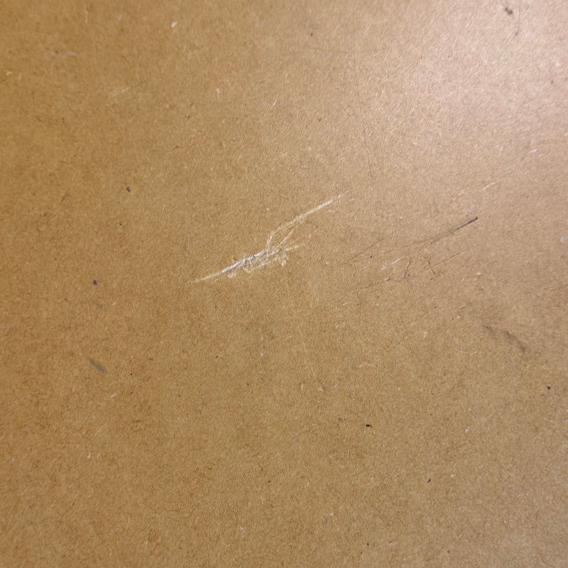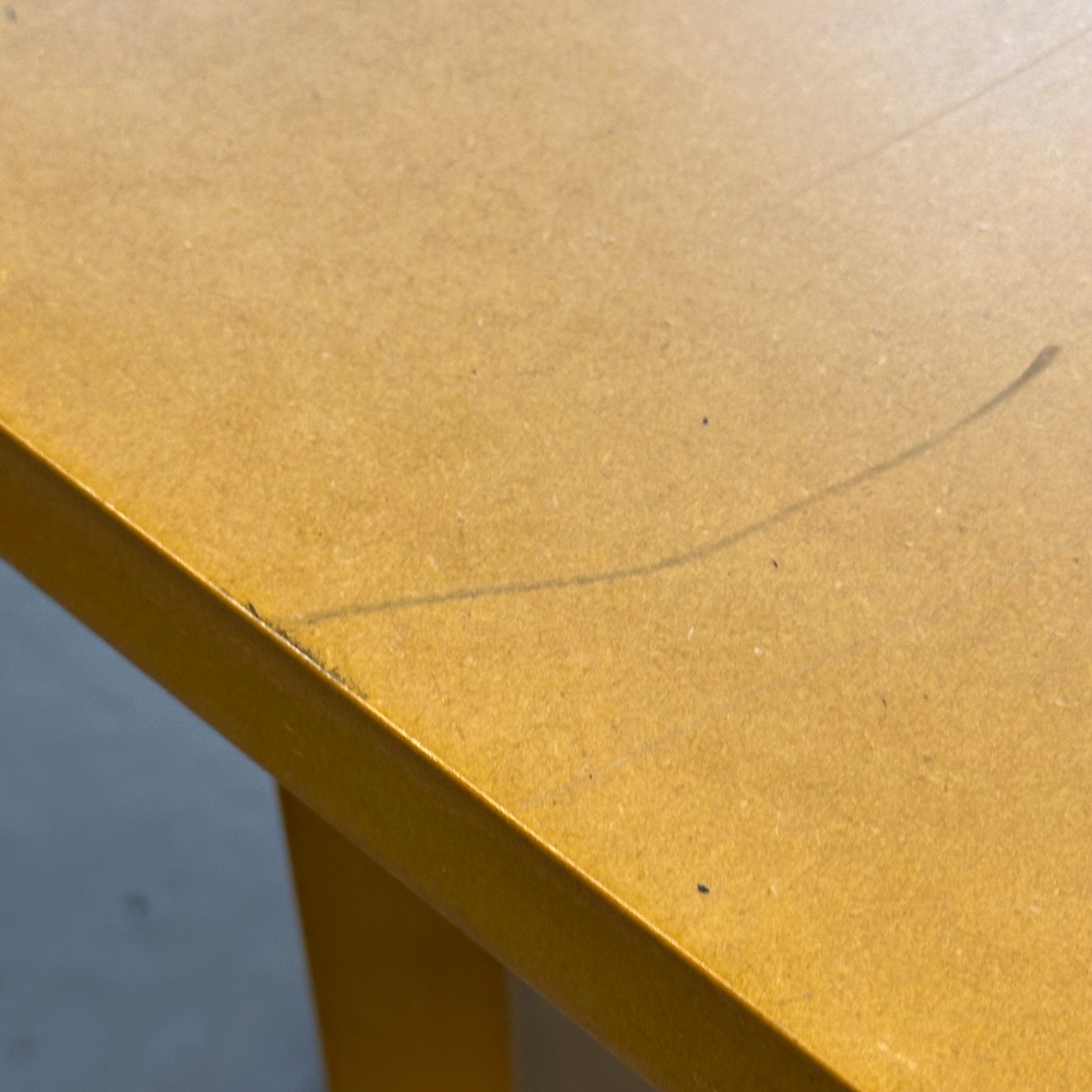 Benken har noen merker og skrammer i platen, samt enkelte sprekker og hakk i bena. Dette påvirker ikke bruken, og benken er fortsatt i god tilstand.