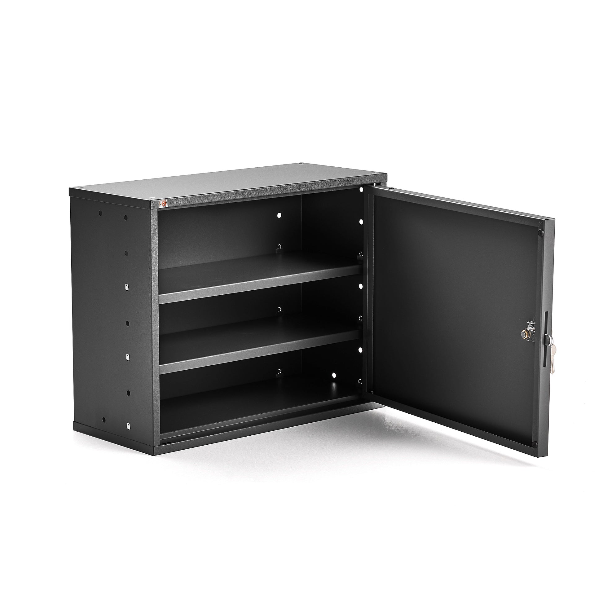 Praktisk og låsbart oppbevaringsskap fra AJ Produkter som enkelt monteres på verktøytavlen eller direkte på veggen. Skapet har to justerbare hyller som gir fleksibel lagringsløsning for kontorutstyr. Den mørke grå stålfinishen gir et moderne og stilig uttrykk.