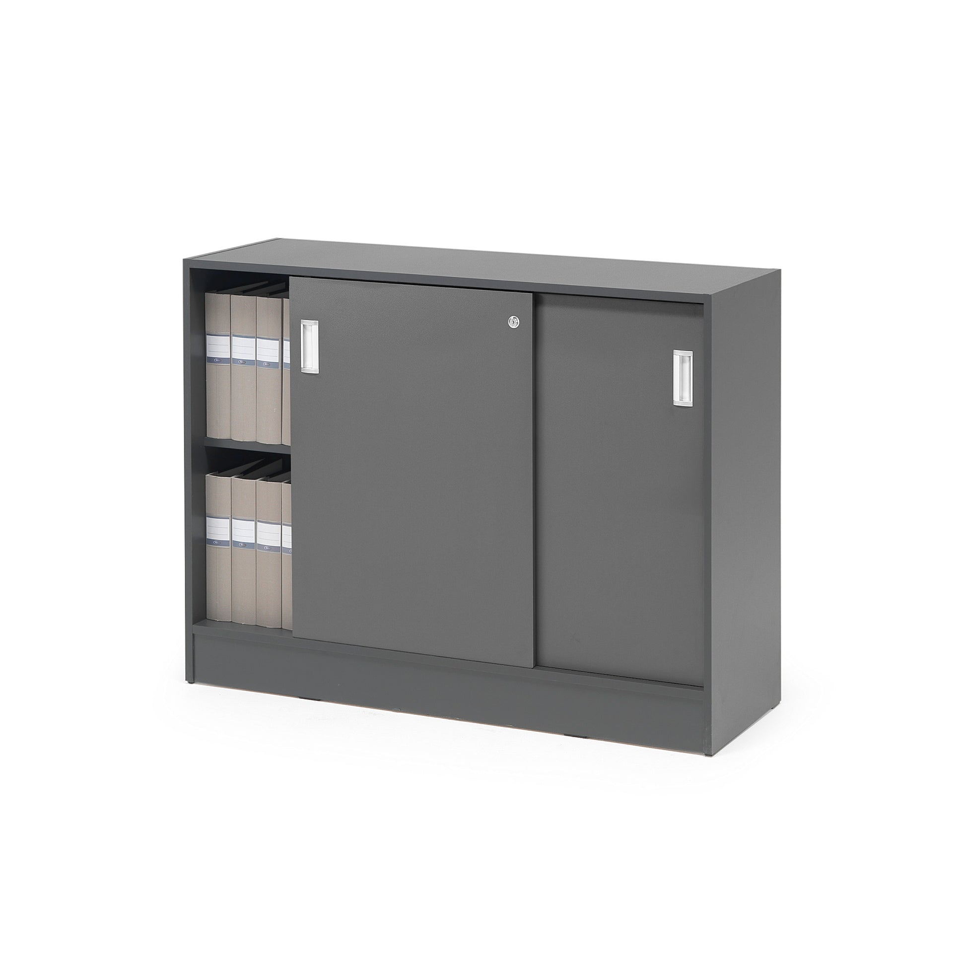 Plassbesparende skap med stilige skyvedører fra AJ Produkter. Dørene har innfelte håndtak for et rent og moderne uttrykk, og skapet leveres med sylinderlås og to nøkler for sikker oppbevaring. Det grå laminatet gir en elegant finish som passer inn i ethvert kontorlandskap.