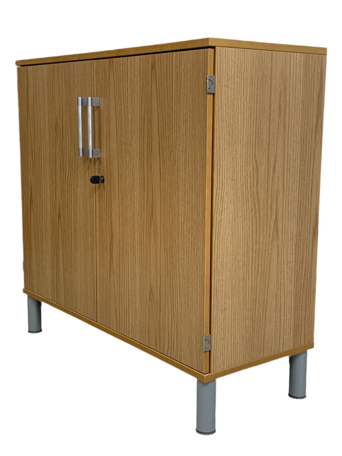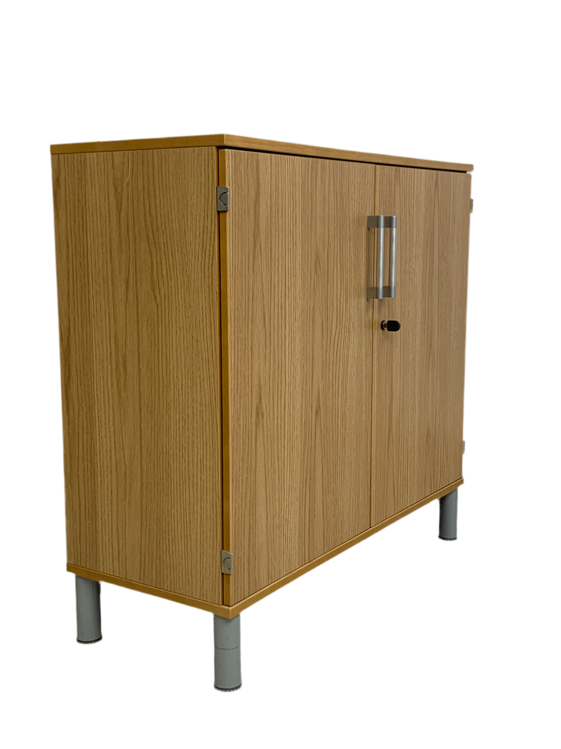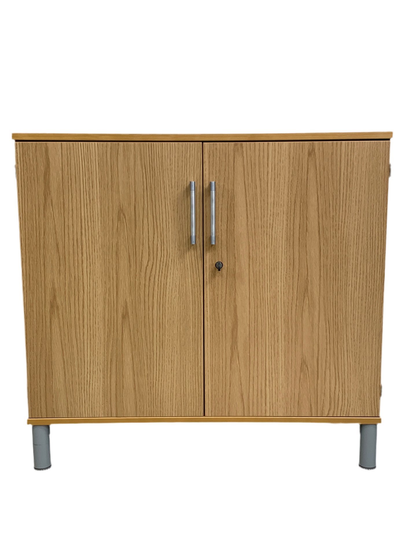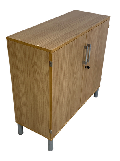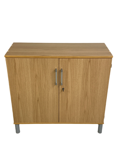 Trefarget skap med et stilrent design og to hyller, perfekt for kontormiljøet. Dørene åpnes parallelt med sideveggene, noe som gir enkel tilgang til innholdet. Merk at skapet mangler nøkkel.