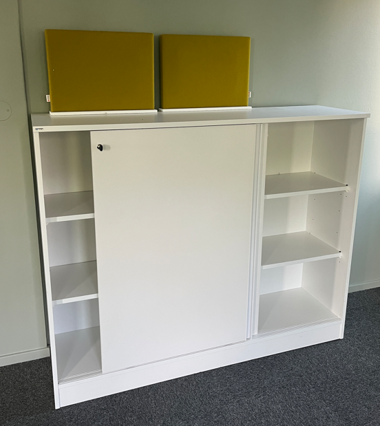 Praktisk skap med låsbare skyvedører, ideelt for kontoret. Skapet er laget i hvit finish og har flere åpne hyller for organisering av kontorartikler, noe som bidrar til et ryddig arbeidsmiljø.
