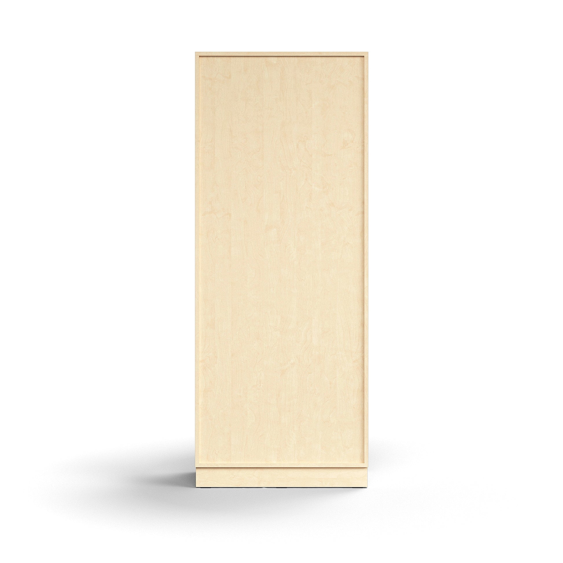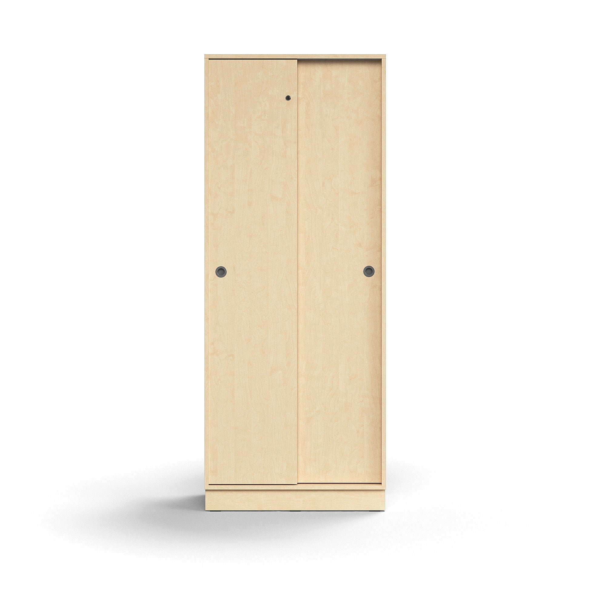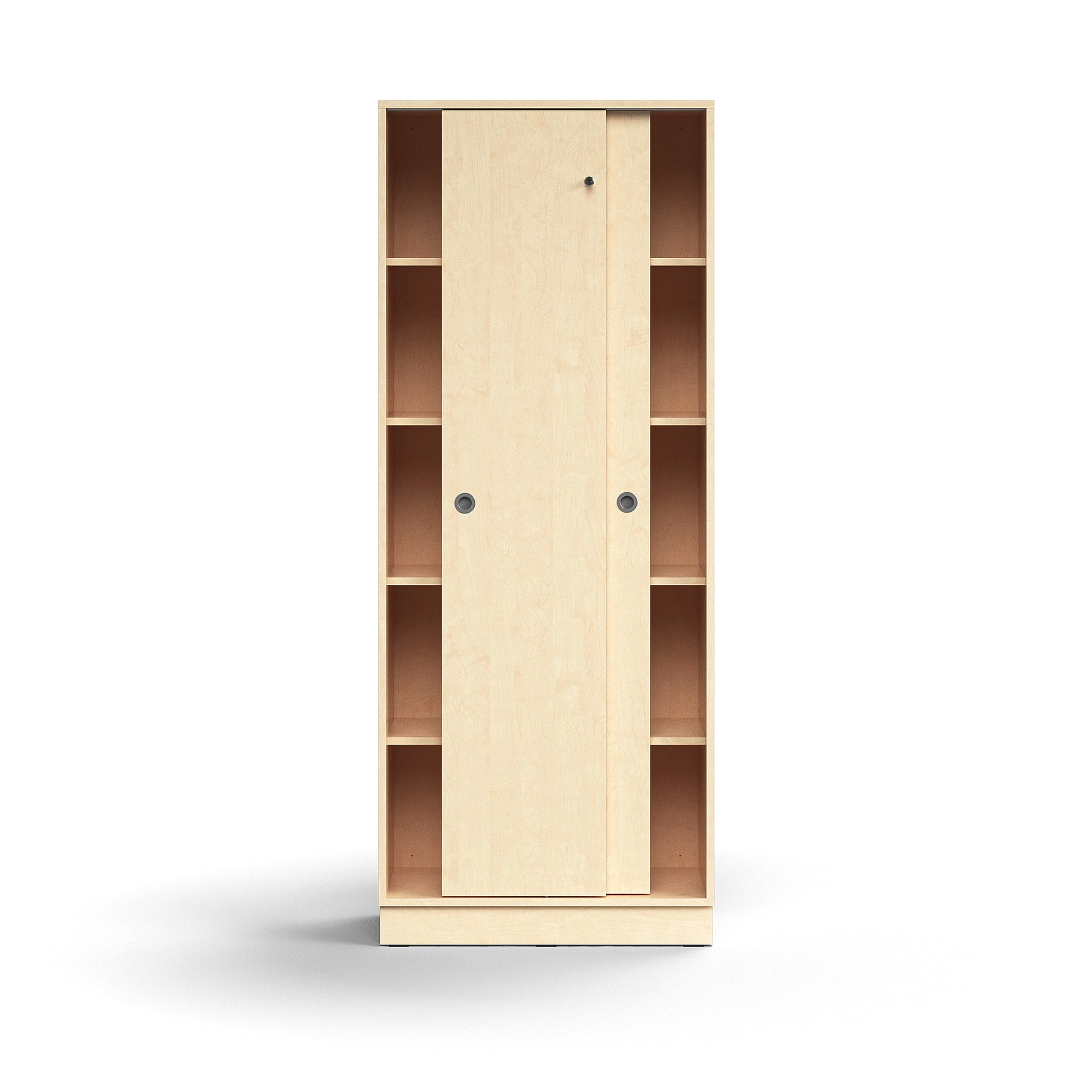 Skap QBUS, låsbare skyvedører m/håndtak, 4 hyller, sokkel, H2020 B800 D400 mm, bjørk