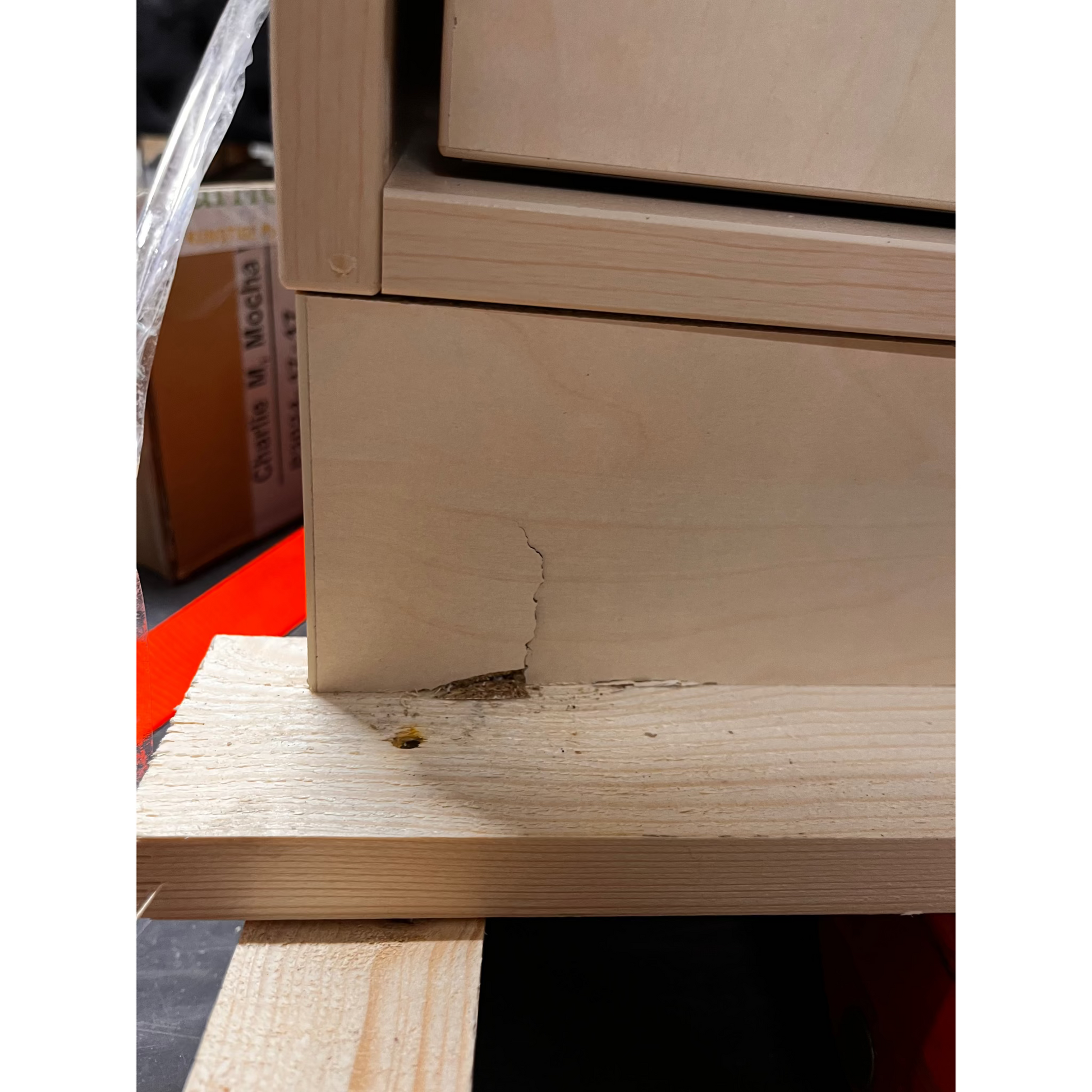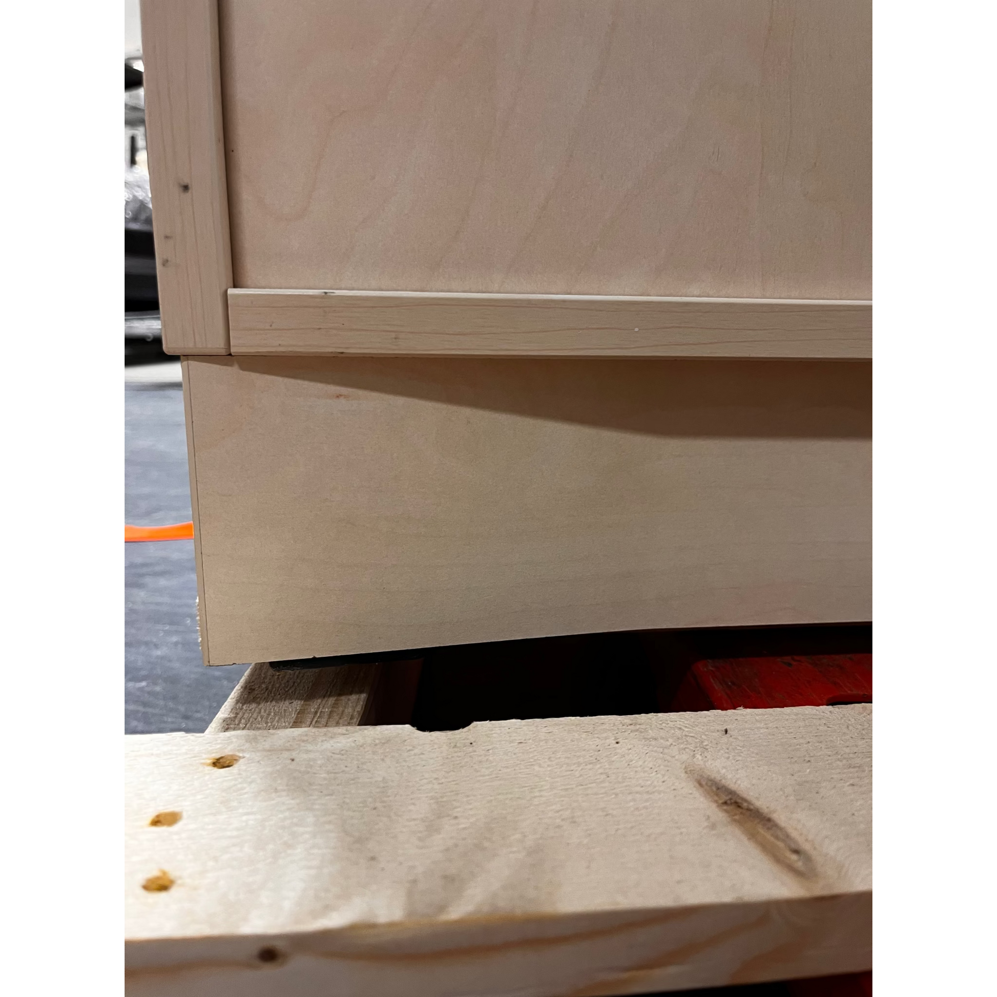 Skapet er i god tilstand men sokkelen er skadet og mangler en skrue. Det er også noen bruksskader som er synlige på skinna til dørene. Skapet står likevel stødig nok for bruk.