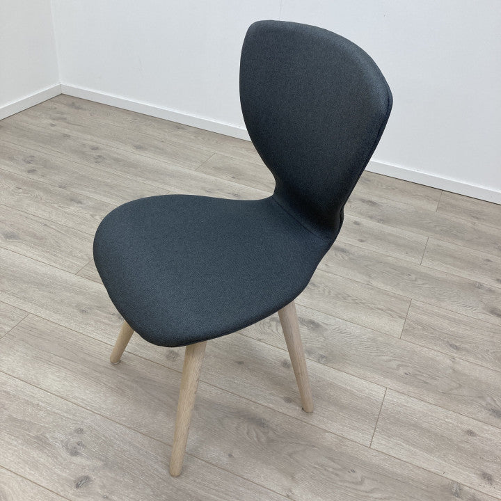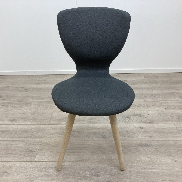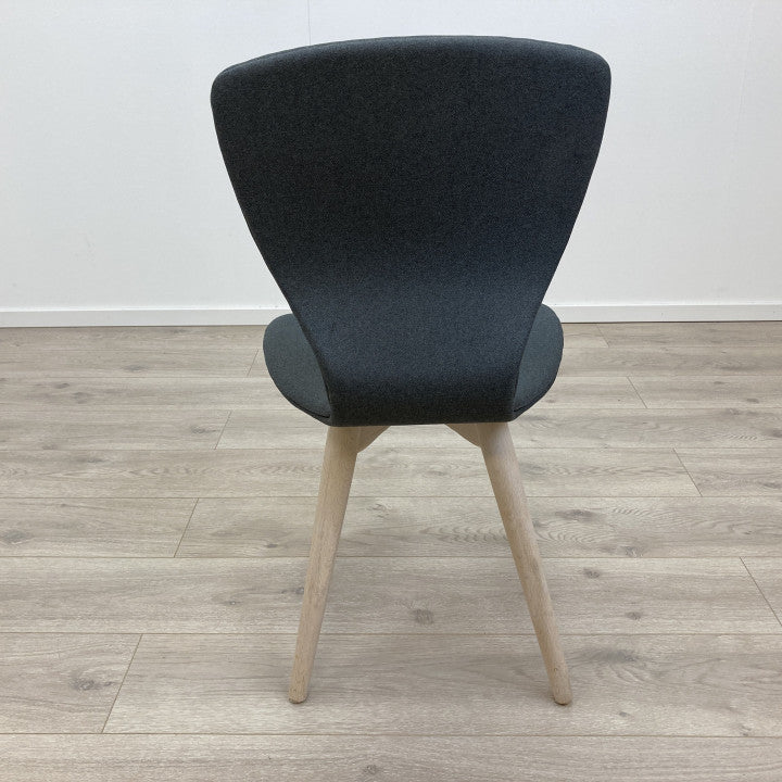 Spisestol/konferansestol med polstret sete i fargen grå med understell av hvitpigmentert eik. Selve designet på stolen er moderne og enkel som passer fint inn i både kontor sammenheng og i skandinavisk interiør. Ryggen på stolen er avsmalnende ved det polstrede setet og gir derfor en ekstra god sitteopplevelse med solid støtte til ryggen. Farge og materiale: Setetrekk i skifergrå vevet tekstil. Solid understell bestående av fire avsmalende ben av hvitpigmentert eik. Stolen har ingen merker eller flekker på hverken trekket eller understellet.