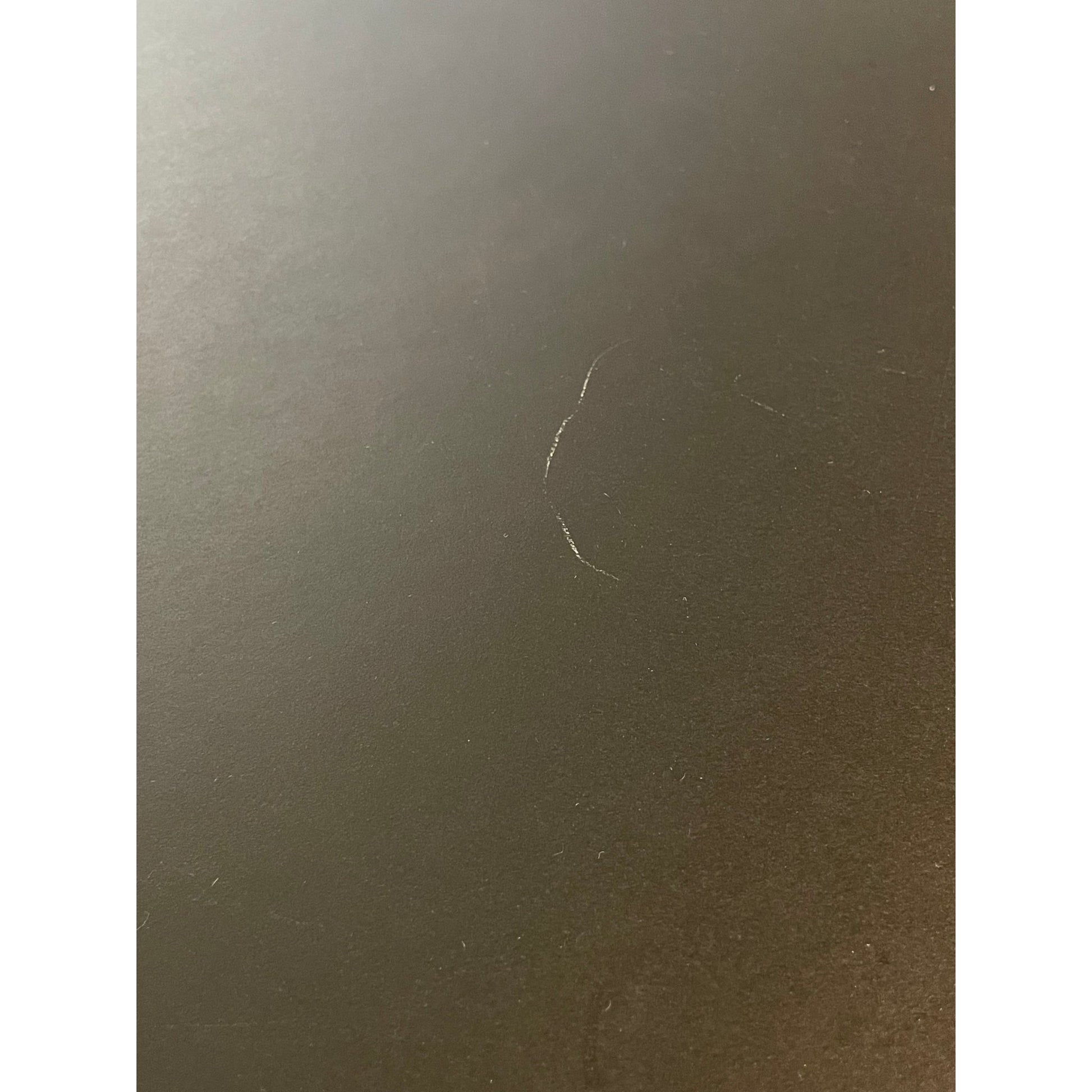 Skrivebordet er i god tilstand med noen bruksmerker på bordplaten. Det er funksjonelt, men enkelte hvite skraper er synlige på den svarte overflaten, som kan påvirke det estetiske inntrykket.
