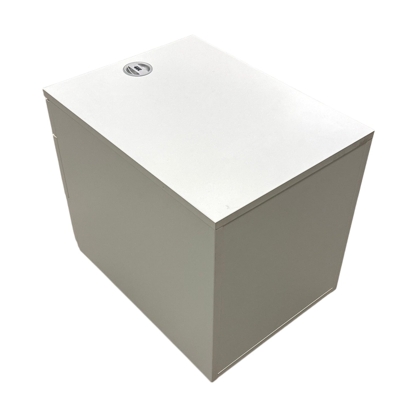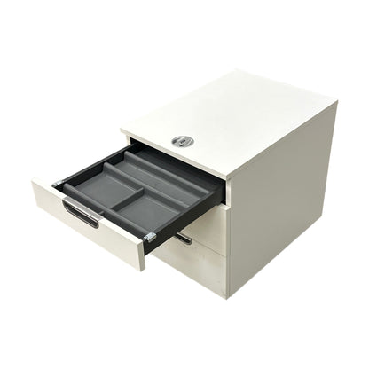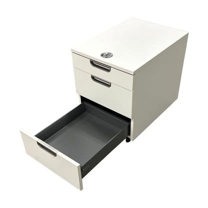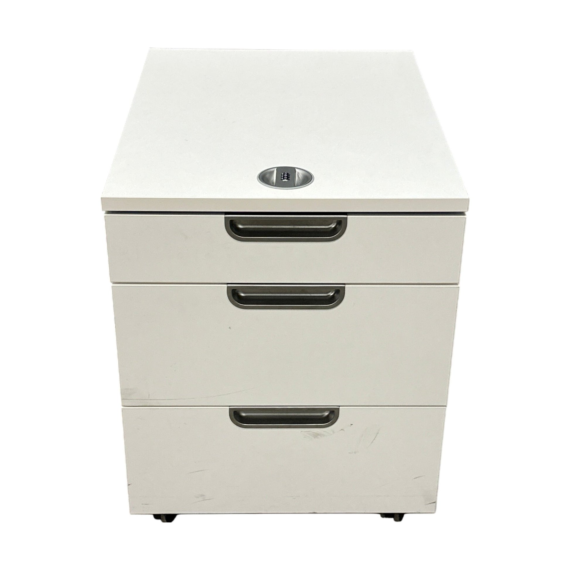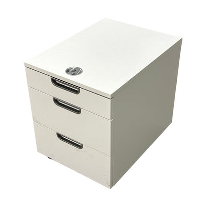 Denne moderne skuffeseksjonen kombinerer stil og funksjonalitet. Den rene, hvite finishen gir et minimalistisk utseende som passer perfekt inn på kontoret eller hjemme. Skuffeseksjonen har tre romslige skuffer, som er ideelle for å oppbevare viktige dokumenter og andre kontorartikler. Den praktiske kodelåsen sikrer at innholdet holdes trygt, og størrelsen gjør det perfekt til under pulten.