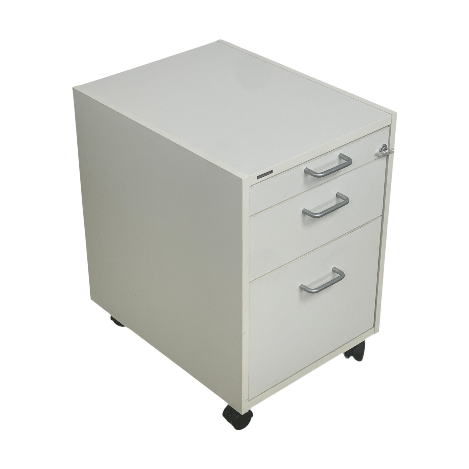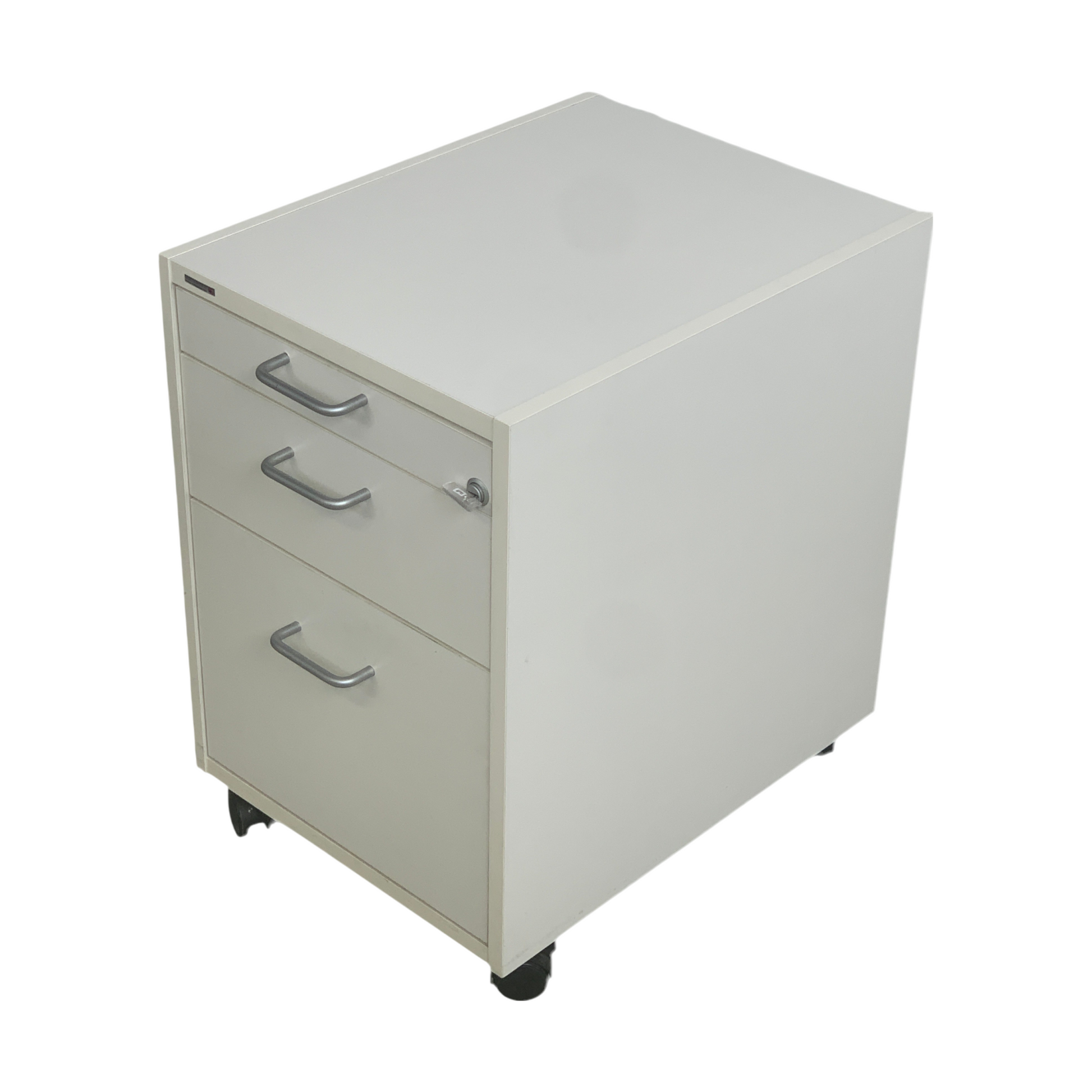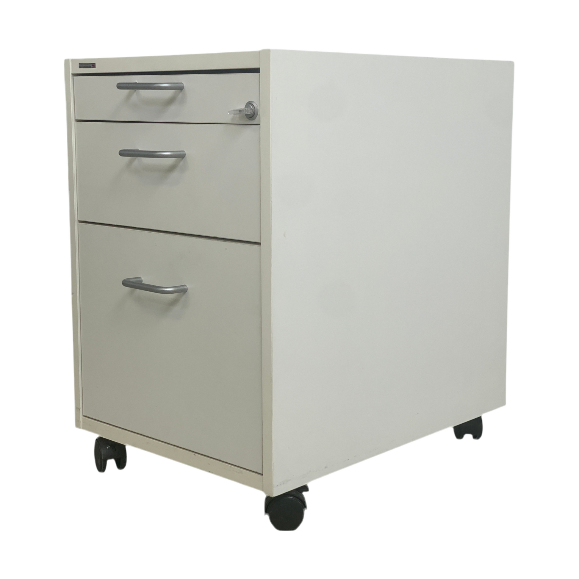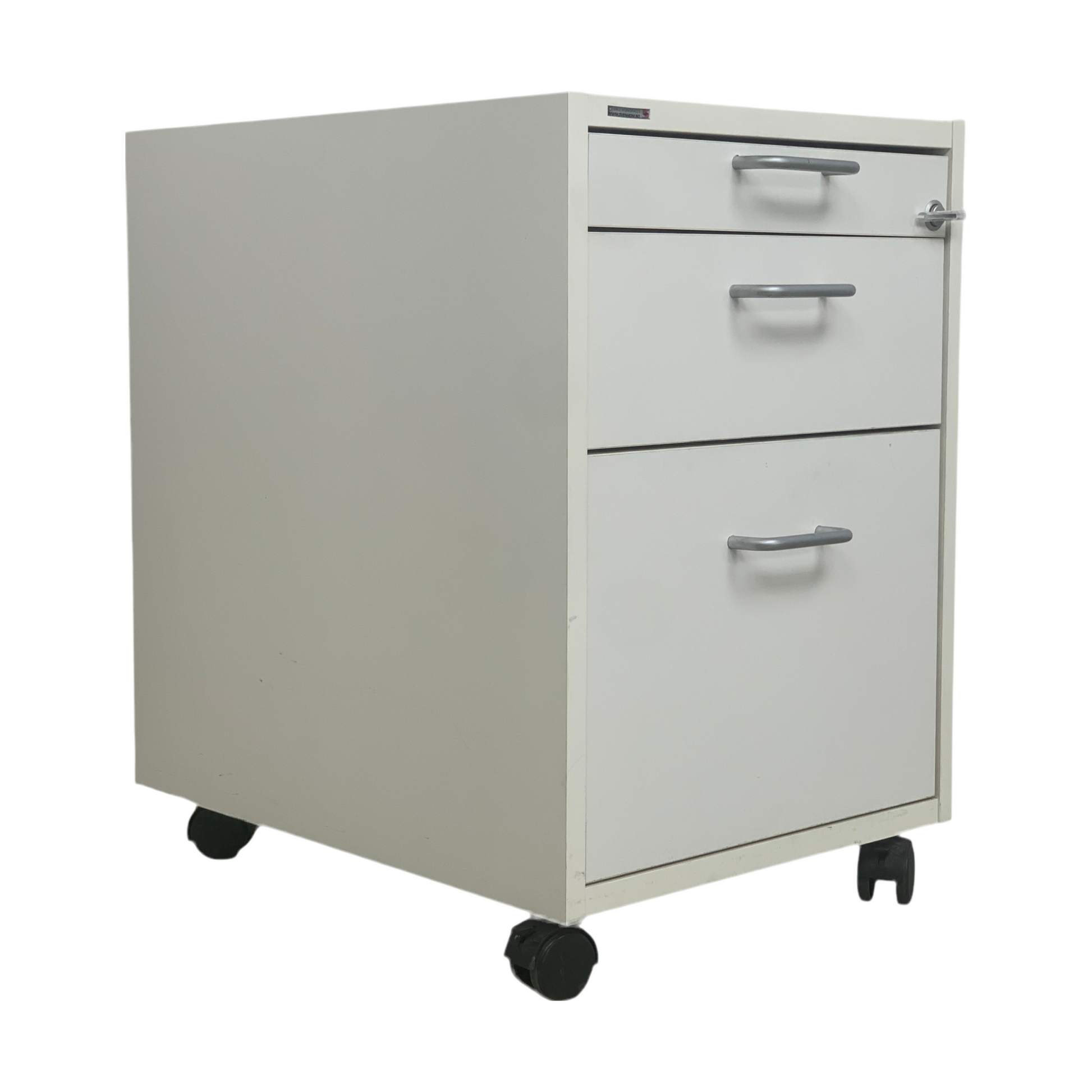 Praktisk skuffeseksjon på hjul, ideell for kontoret med begrenset plass. Med tre skuffer gir den effektiv oppbevaring for dokumenter og kontorutstyr. Den hvite fargen og enkle designet sørger for at den passer inn i de fleste kontormiljøer.