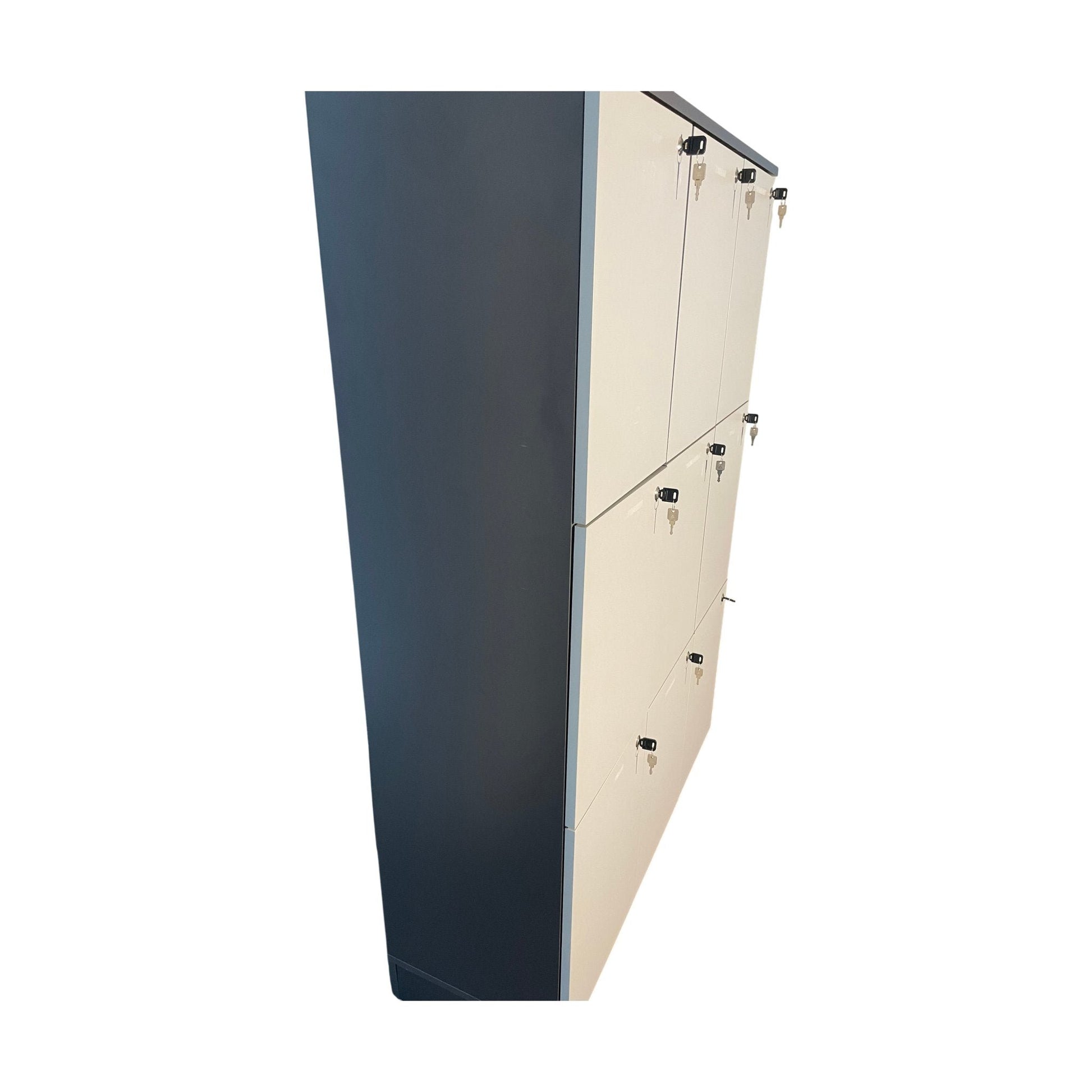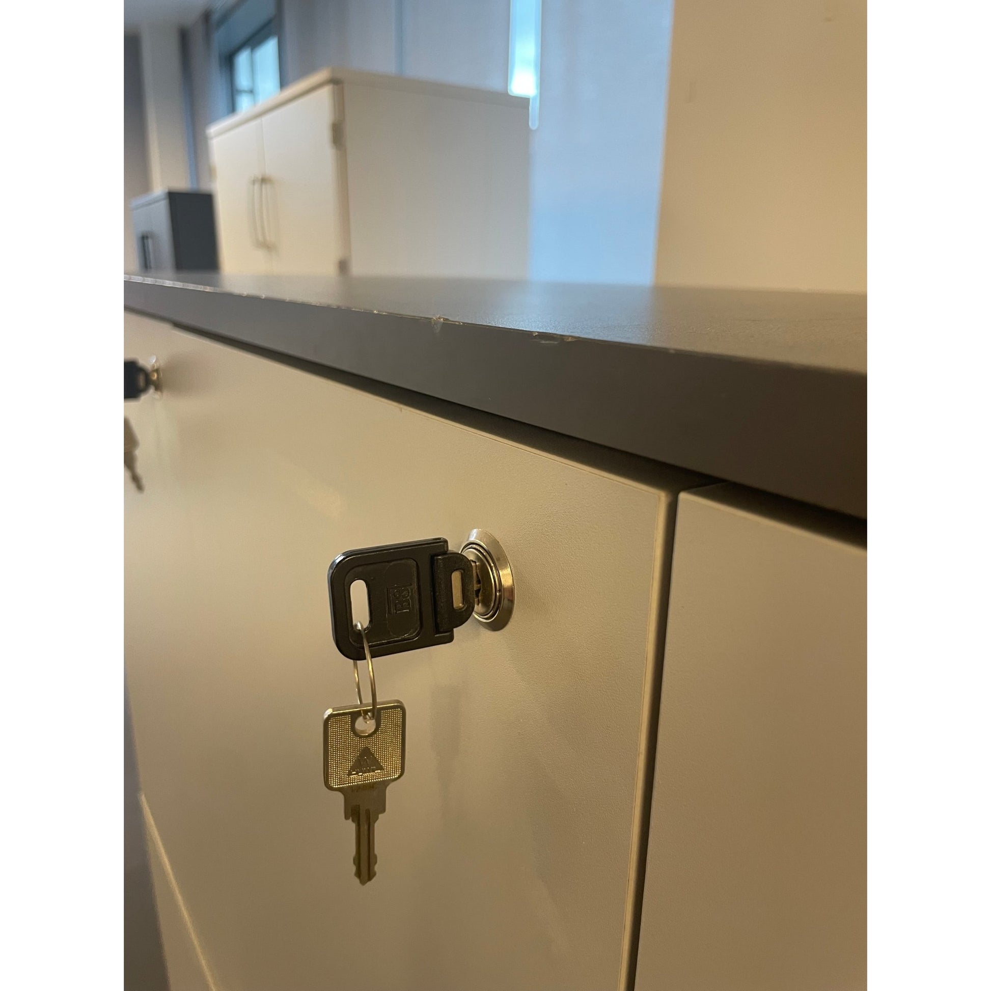 Praktisk og funksjonelt småroms skap som er ideelt for kontorbruk. Skapet har et slankt design med låsbare skapdører, noe som gir sikker oppbevaring av personlige eiendeler. Den grå laminatoverflaten gir et stilrent uttrykk, og kombinert med en stilig svart sokkel, passer det godt inn i moderne kontormiljøer.