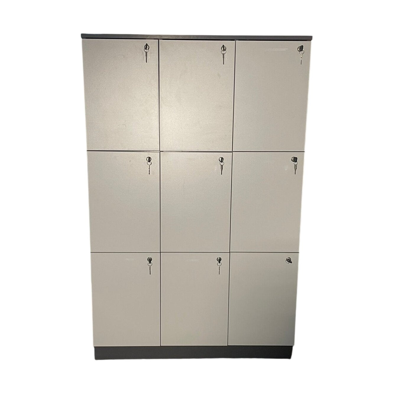 Skapet har noen små bruksskader og en ødelagt sokkel, men er ellers i godt brukt stand. Alle skapdører er låsbare og fullt funksjonelle, hvilket gjør det til en praktisk løsning for oppbevaring.