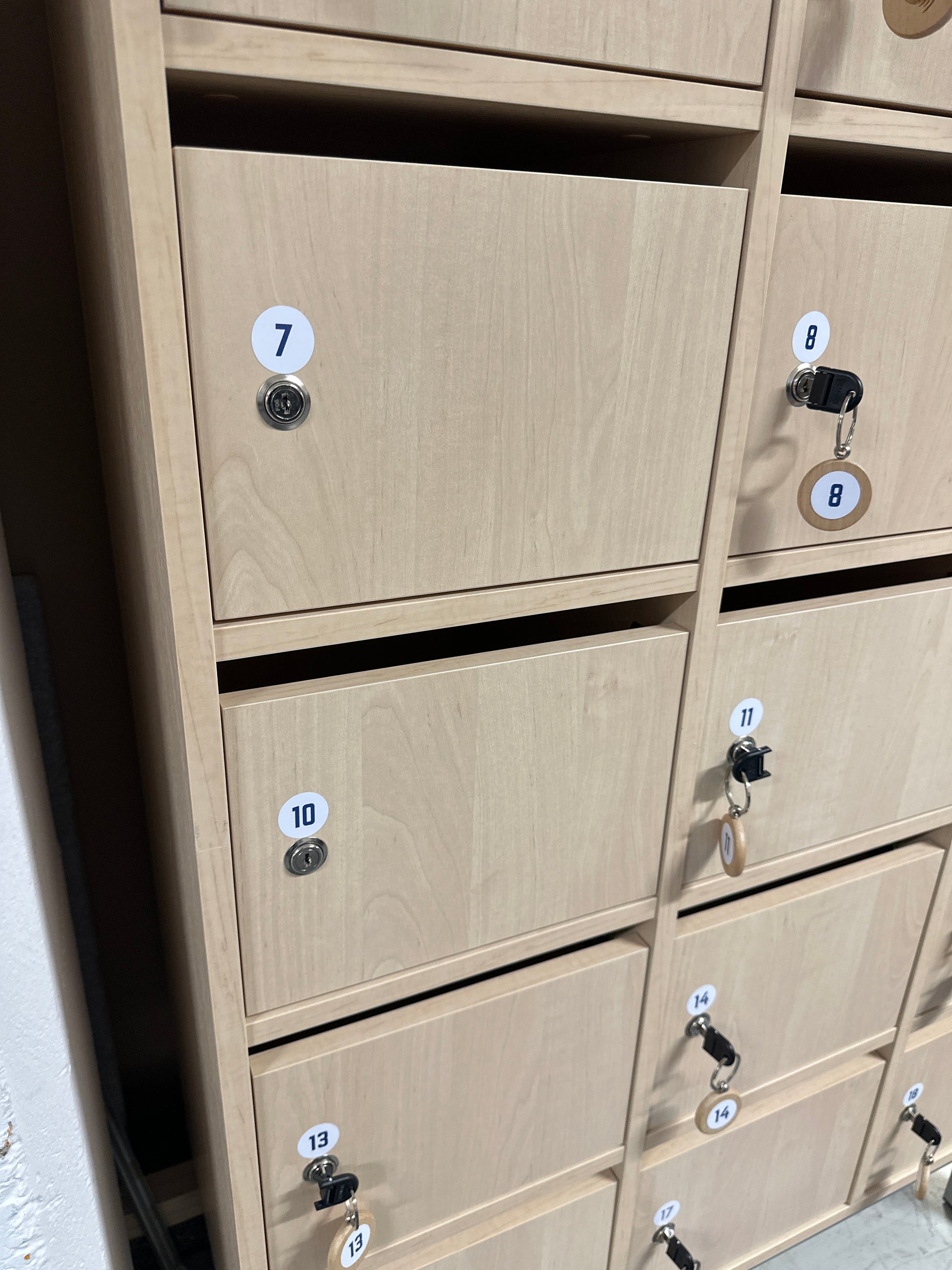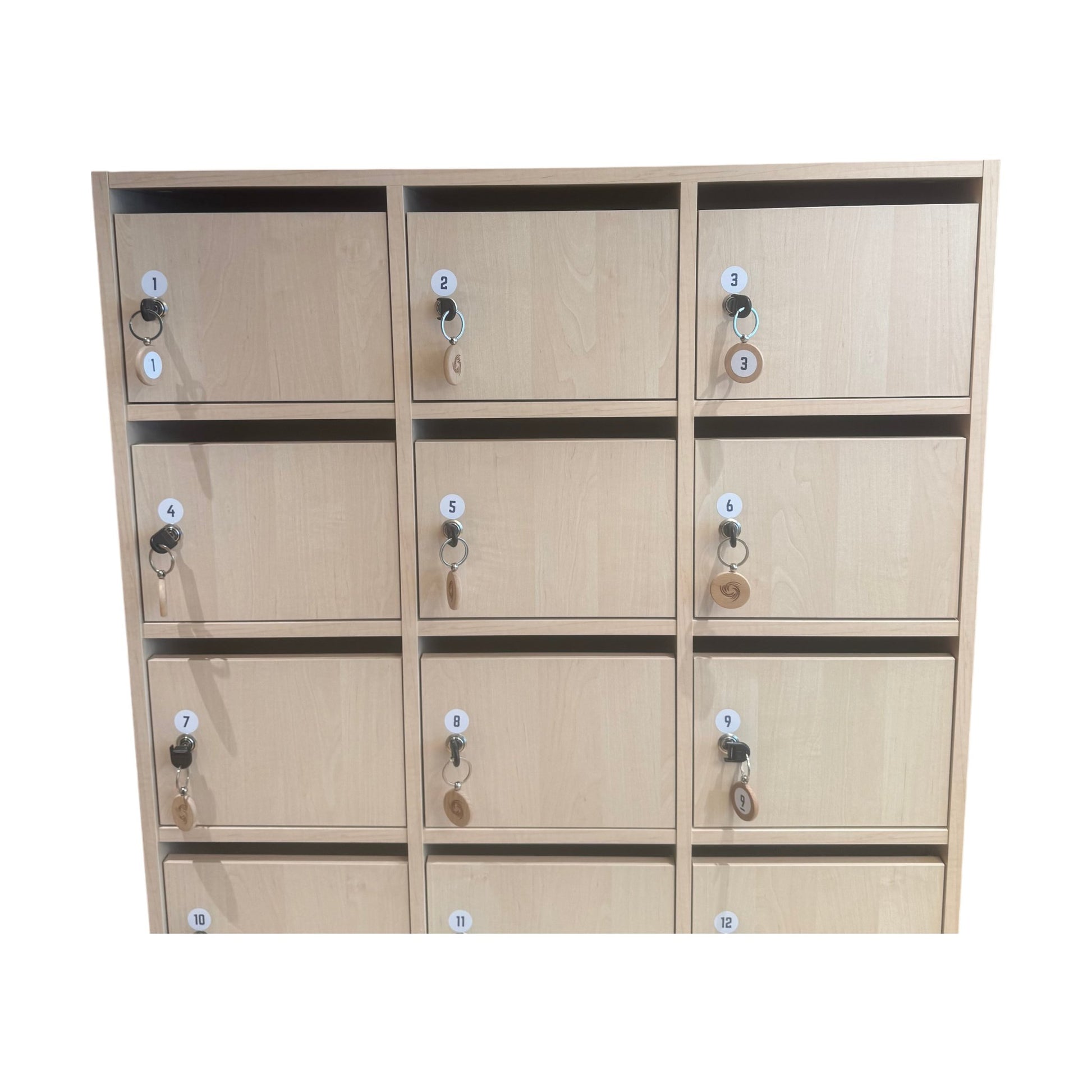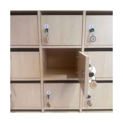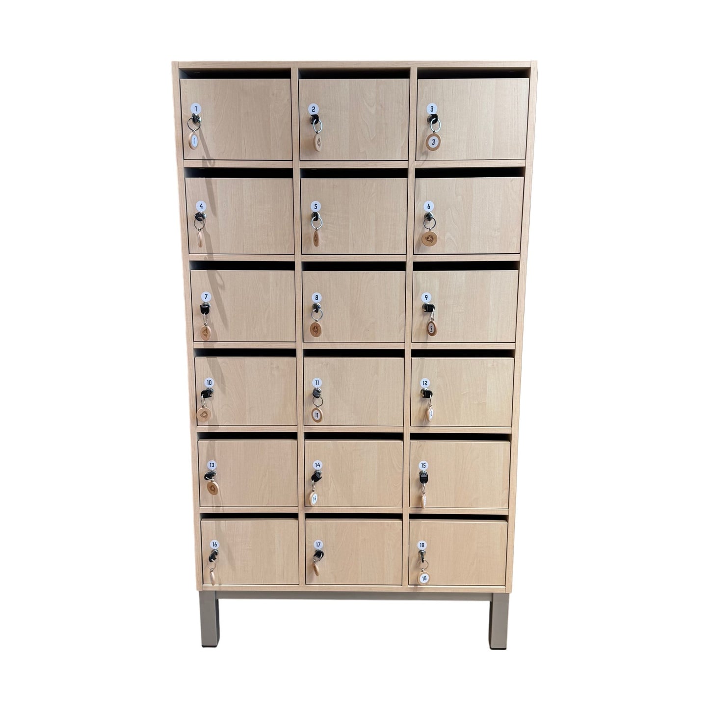 Funksjonell skapseksjon med 18 låsbare rom, perfekt for kontoret. Denne skapet tilbyr sikker oppbevaring og en enkel, moderne design med lyse treelementer.