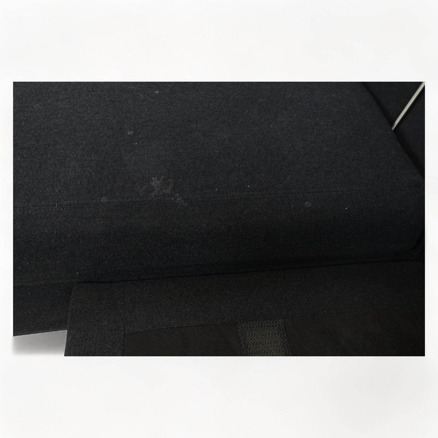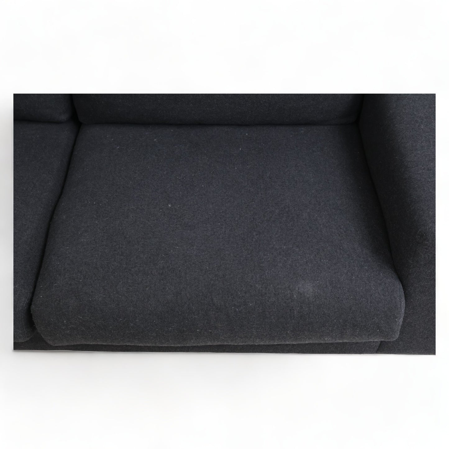 Sofaen har noen bruksmerker på sitteputene og spor av dyrehår. En mindre søm ved glidelåsen på sjeselongputen er reparert. Ellers i fin stand, renset og klar for rask levering.