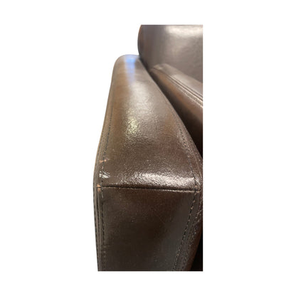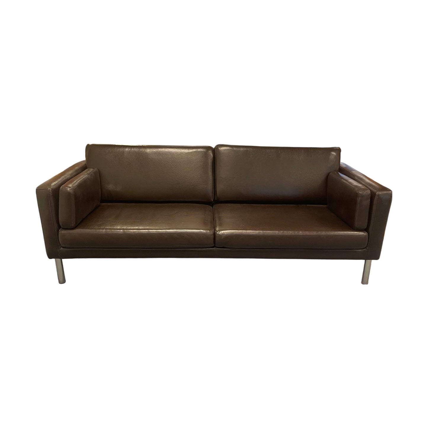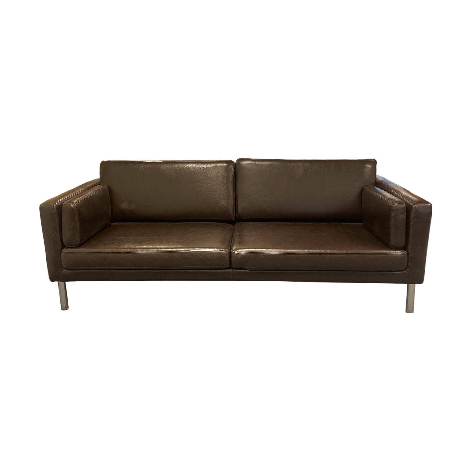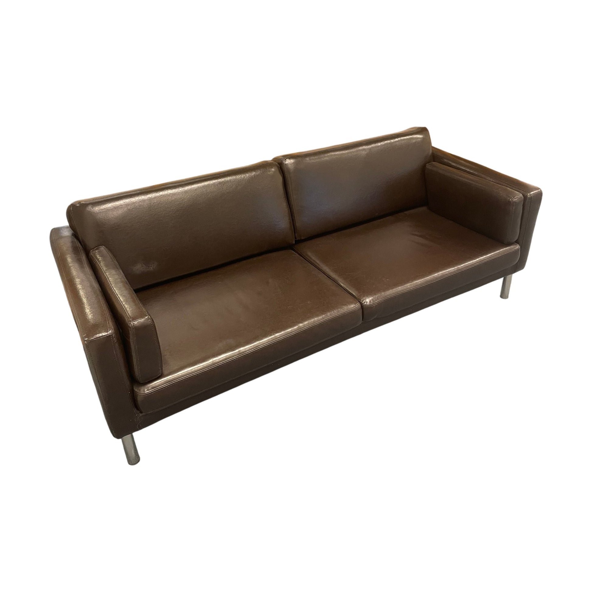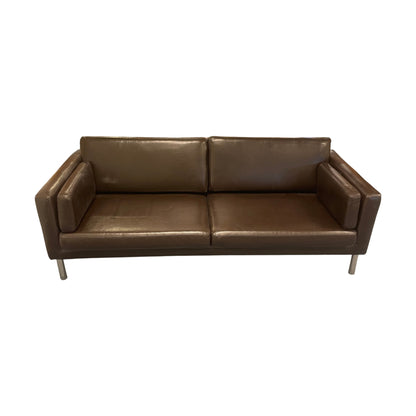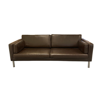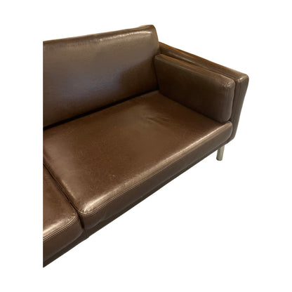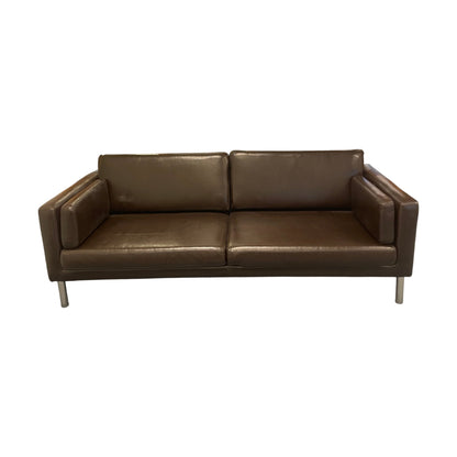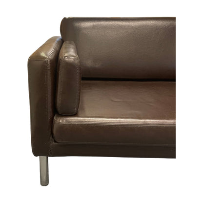 Stilig 3-seter sofa fra IKEA i brunt lær som gir en varm og innbydende atmosfære. Perfekt for stua, venterommet eller kontoret, tilbyr den både komfort og eleganse i hverdagen.