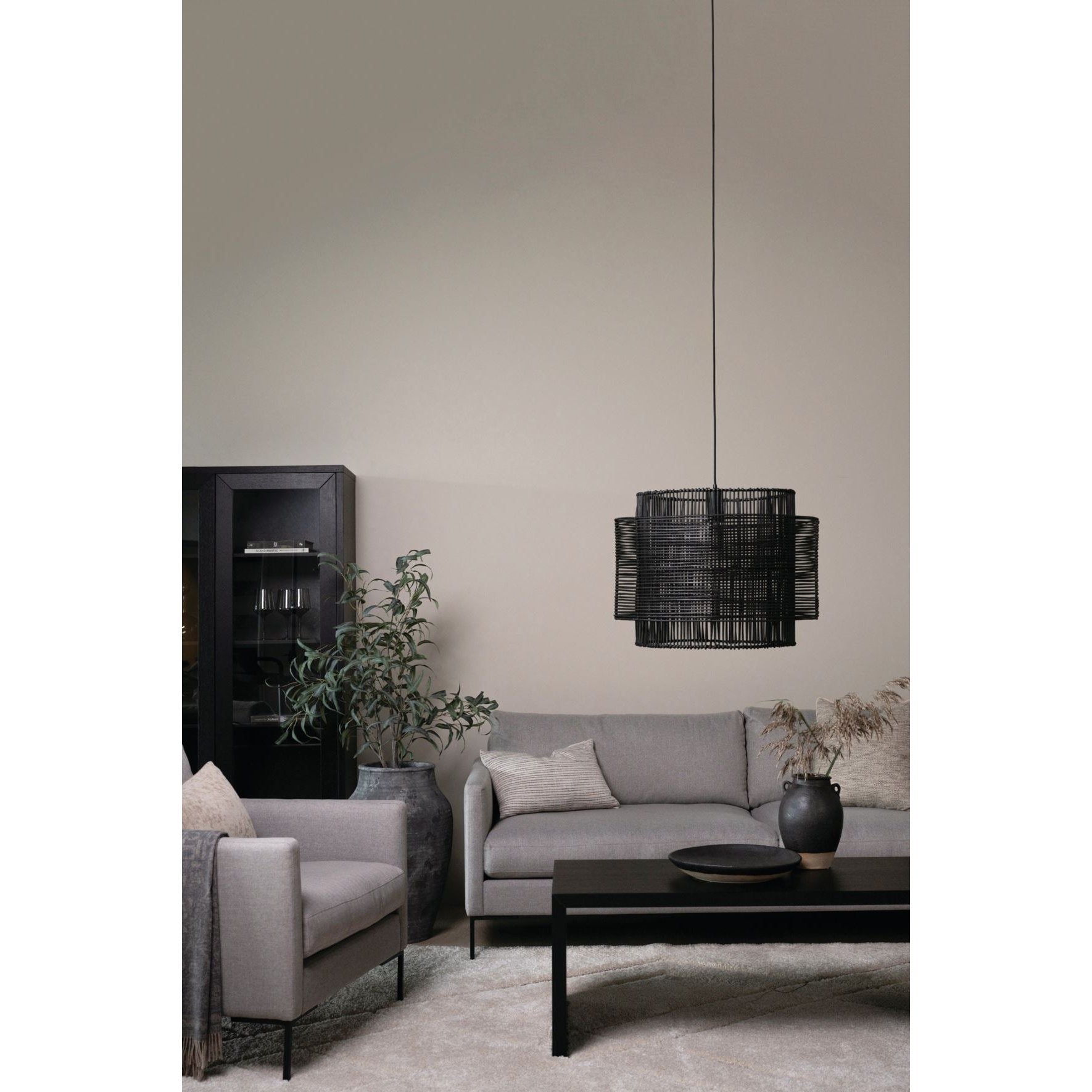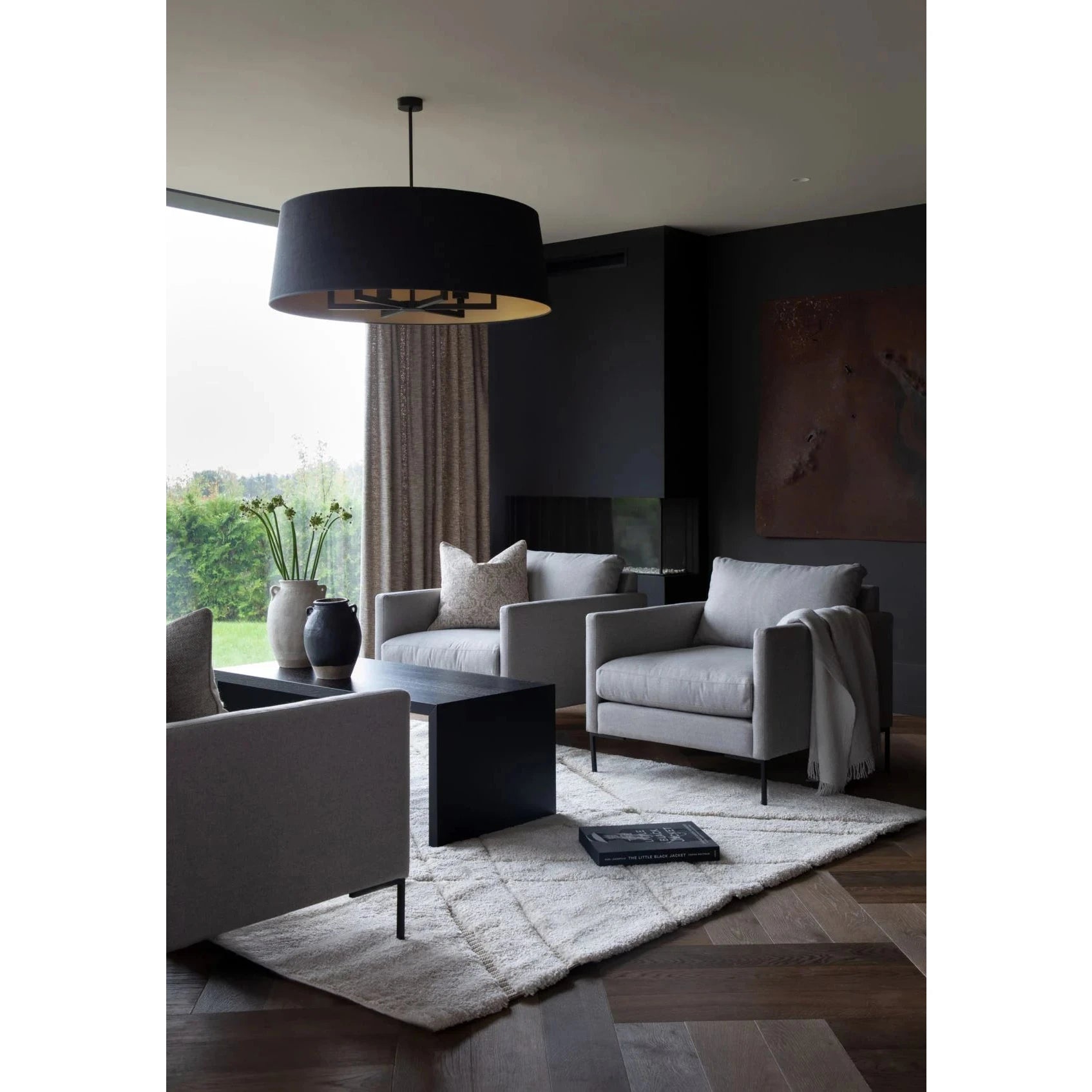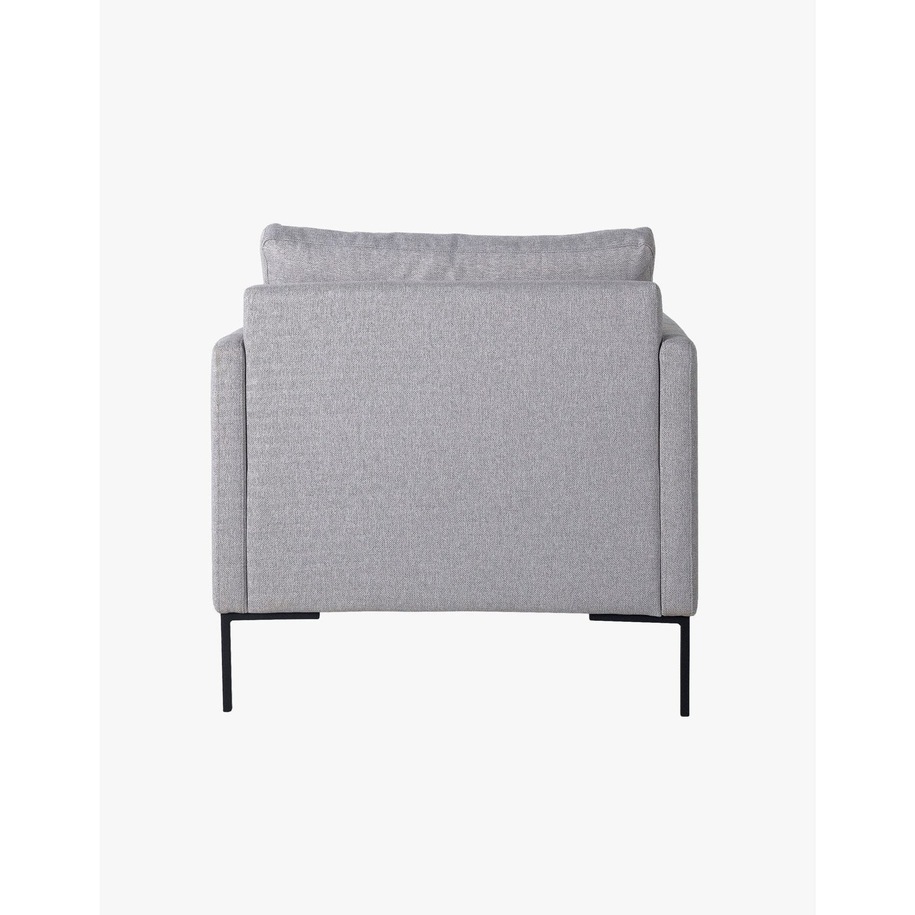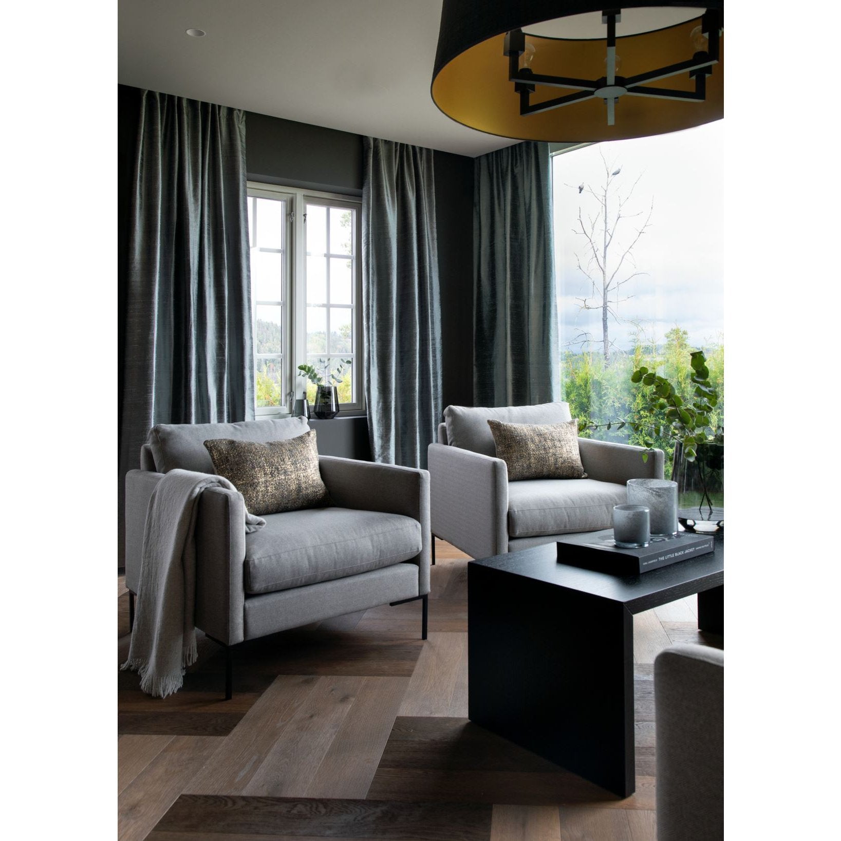Komfortabel loungstol i en klassisk, tidløs fasong. Trekket er slitesterkt og vevet i fiskebensmønster (100% Polyester), noe som gir et fint særpreg til sofaen. Det unike er avtagbart på rygg- og seteputer. Kan vaskes på 40 grader finvask. Armlenene er slanke, men behagelige og gir et minimalistisk, nordisk uttrykk. Seteputen er spesialkonstruert i ballfiber og HR-skum for ekstra god komfort. Stolen er bygget på en ramme av heltre furu og kryssfiner, som gir en stødig og holdbar kvalitet. Ben i sortlakkert stål.