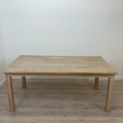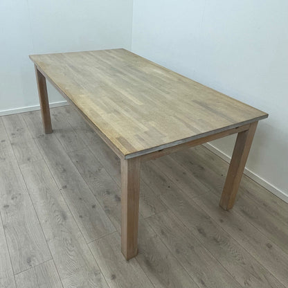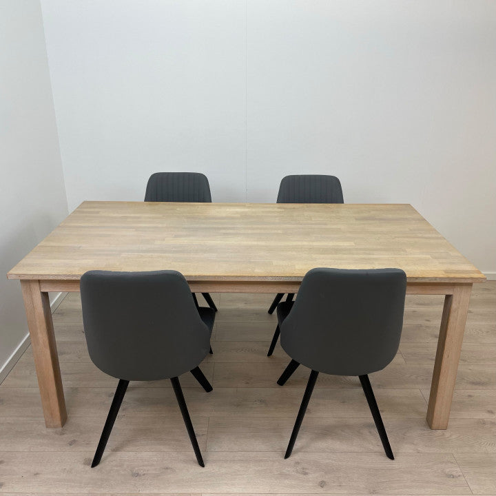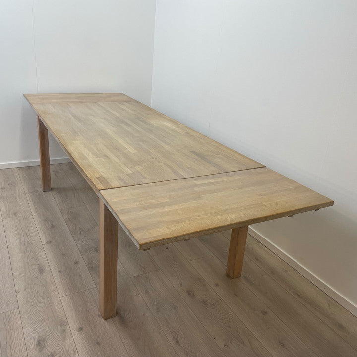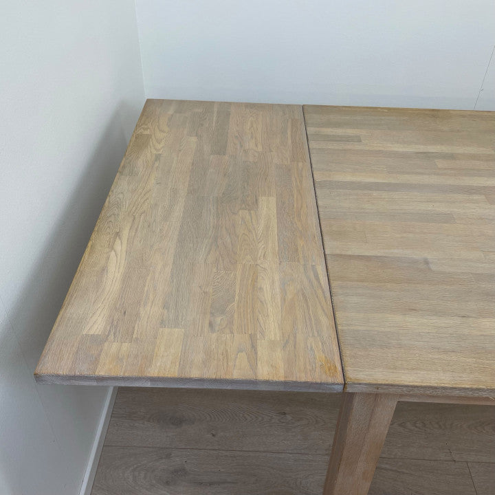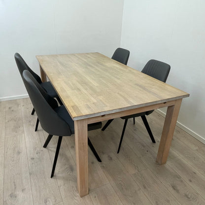 Spisebord/kjøkkenbord av hvitoljet eik i skandinavisk design. Det lyse og elegante treverket gir dermed et ekstra preg av natur på interiøret. Bordet har et fleksibelt bruksområde med mulighet for forlengelse av tilleggsplate på hver side av bordet. Den har derfor plass til 4-8 seter rundt bordet. Farge og materiale: Bordplate og bordben sammensatt av hvitoljet eik.