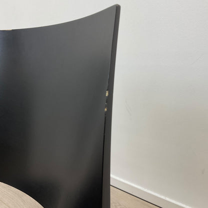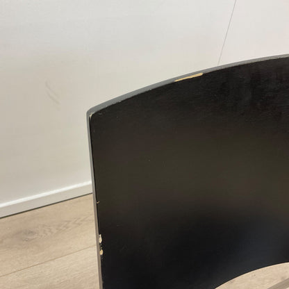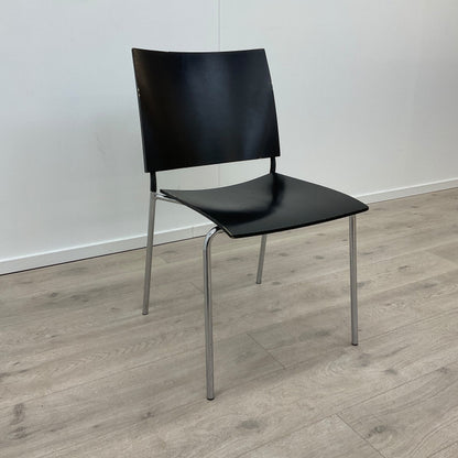 Enkel spisestol i svart farge med krom understell. En god og enkel spisestol med både rygg og sete av formpresset treverk for ekstra komfort. De rene linjene og enkle designelementene gjør at man kan bruke denne stolen til flere ulike interiør og bordformer. Stolen har noe bruksmerker ved kantene.